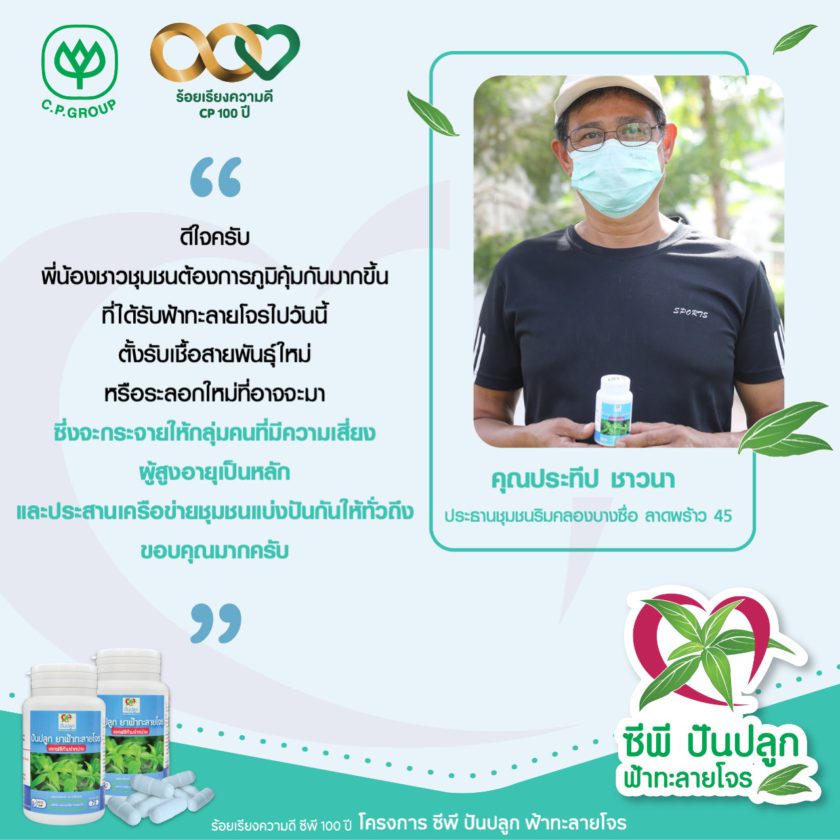 คุณประทีป ชาวนา ประธานชุมชนริมคลองบางซื่อ ลาดพร้าว 45 กล่าวว่า ดีใจที่พี่น้องชาวชุมชนได้รับสมุนไพรฟ้าทะลายโจร ซึ่งจะเป็นภูมิคุ้มกันได้มากขึ้น เพื่อตั้งรับเชื้อสายพันธุ์ใหม่หรือระลอกใหม่ที่อาจจะมา โดยจะกระจายให้กลุ่มคนที่มีความเสี่ยง ผู้สูงอายุเป็นหลัก และประสานเครือข่ายชุมชนแบ่งปันกันให้ทั่วถึง ขอขอบคุณเครือซีพีมา ณ โอกาสนี้