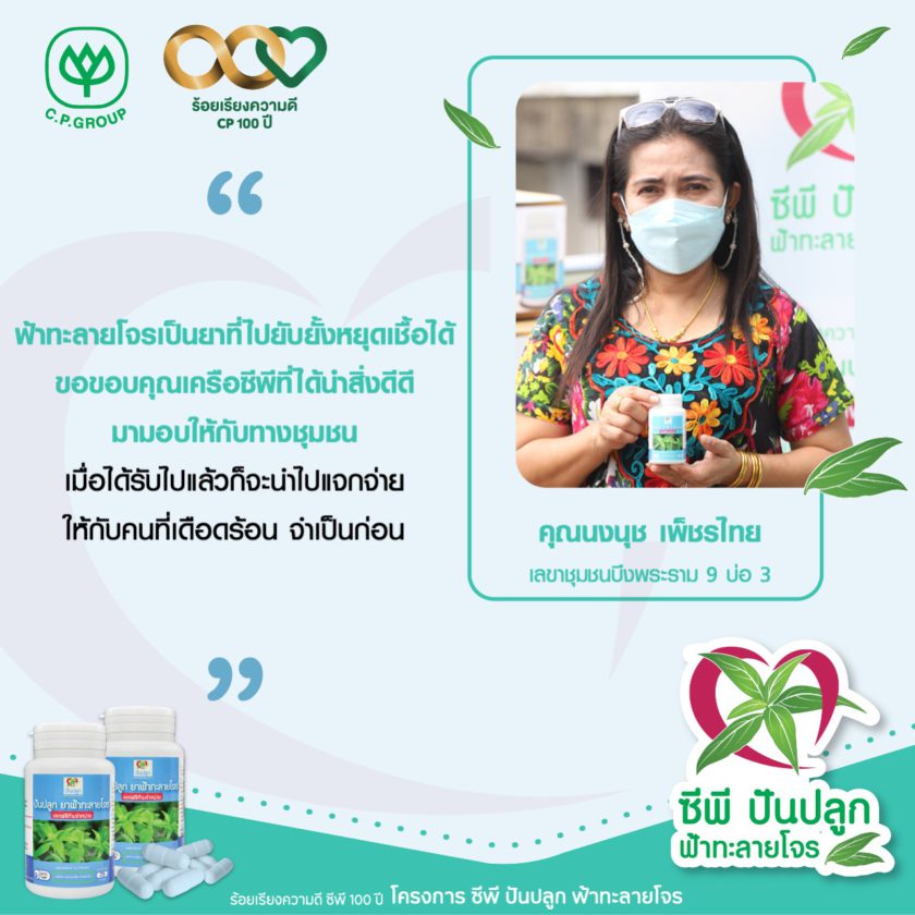 คุณนงนุช เพ็ชรไทย เลขาชุมชนบึงพระราม 9 บ่อ 3 กล่าวว่า ฟ้าทะลายโจรเป็นยาที่จะช่วยไปยับยั้งหยุดเชื้อได้ ขอขอบคุณเครือซีพีที่ได้นำสิ่งดีดีมามอบให้ชาวชุมชน เมื่อได้รับไปแล้วก็จะนำไปแจกจ่ายให้แก่คนที่เดือดร้อน และมีความจำเป็นก่อน ซึ่งปัจจุบันชุมชนยังมีผู้ติดเชื้อกักตัวอยู่ 3-4 หลังคาเรือน