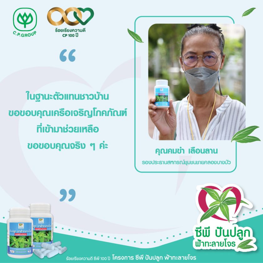 คุณคมขำ เลือนลาน รองประธานสหกรณ์ชุมชนชายคลองบางบัว และ คุณศิริพรรณ เกิดแก่น ประธานชุมชนก้าวหน้า กล่าวเสริมว่า สถานการณ์ผู้ป่วยโควิดในชุมชนตอนนี้ก็เหลือน้อยแล้ว ส่วนมากรักษาหาย มีบางคนที่หายแล้วแต่ยังมีอาการเรื้อรัง ซึ่งยาฟ้าทะลายโจรน่าจะช่วยบรรเทาได้ ก่อนหน้านี้หายาฟ้าทะลายโจรได้ยากมาก ในฐานะตัวแทนชาวบ้านขอขอบคุณเครือเจริญโภคภัณฑ์ที่เข้ามาช่วยเหลือ ขอขอบคุณจริง ๆ สำหรับน้ำใจที่ได้เอื้อเฟื้อมาให้ชาวชุมชน