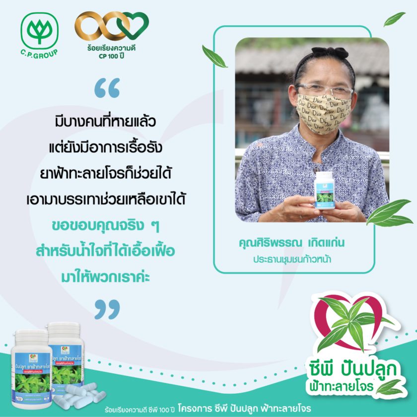 โครงการซีพี ปันปลูก ฟ้าทะลายโจร จัดตั้งขึ้นภายใต้แนวคิด “ร้อยเรียงความดี ซีพี 100 ปี” ดำเนินตามเจตนารมณ์ของท่านประธานอาวุโส ธนินท์ เจียรวนนท์ เครือเจริญโภคภัณฑ์ ที่ต้องการเพิ่มโอกาสให้ประชาชนได้เข้าถึงยาสมุนไพรไทยเพื่อใช้เสริมภูมิคุ้มกันป้องกันโรค รวมถึงส่งเสริมเกษตรกรให้ปลูกฟ้าทะลายโจรเพื่อให้เกิดความยั่งยืน โดยเริ่มลงกล้าเพาะปลูกต้นฟ้าทะลายโจร ตั้งแต่วันที่ 12 สิงหาคม เป็นต้นมา โดยจัดพื้นที่แปลงปลูกจำนวน 100 ไร่ ที่ศูนย์วิจัยแสลงพัน และฟาร์มคำพราน จ.สระบุรี เพื่อผลิตสมุนไพรฟ้าทะลายโจรแจกฟรี 30 ล้านแคปซูลแก่บุคลากรทางการแพทย์ และประชาชนกลุ่มเปราะบางและประชาชนในพื้นที่ที่ยังมีความเสี่ยงต่อการติดเชื้อโควิด-19