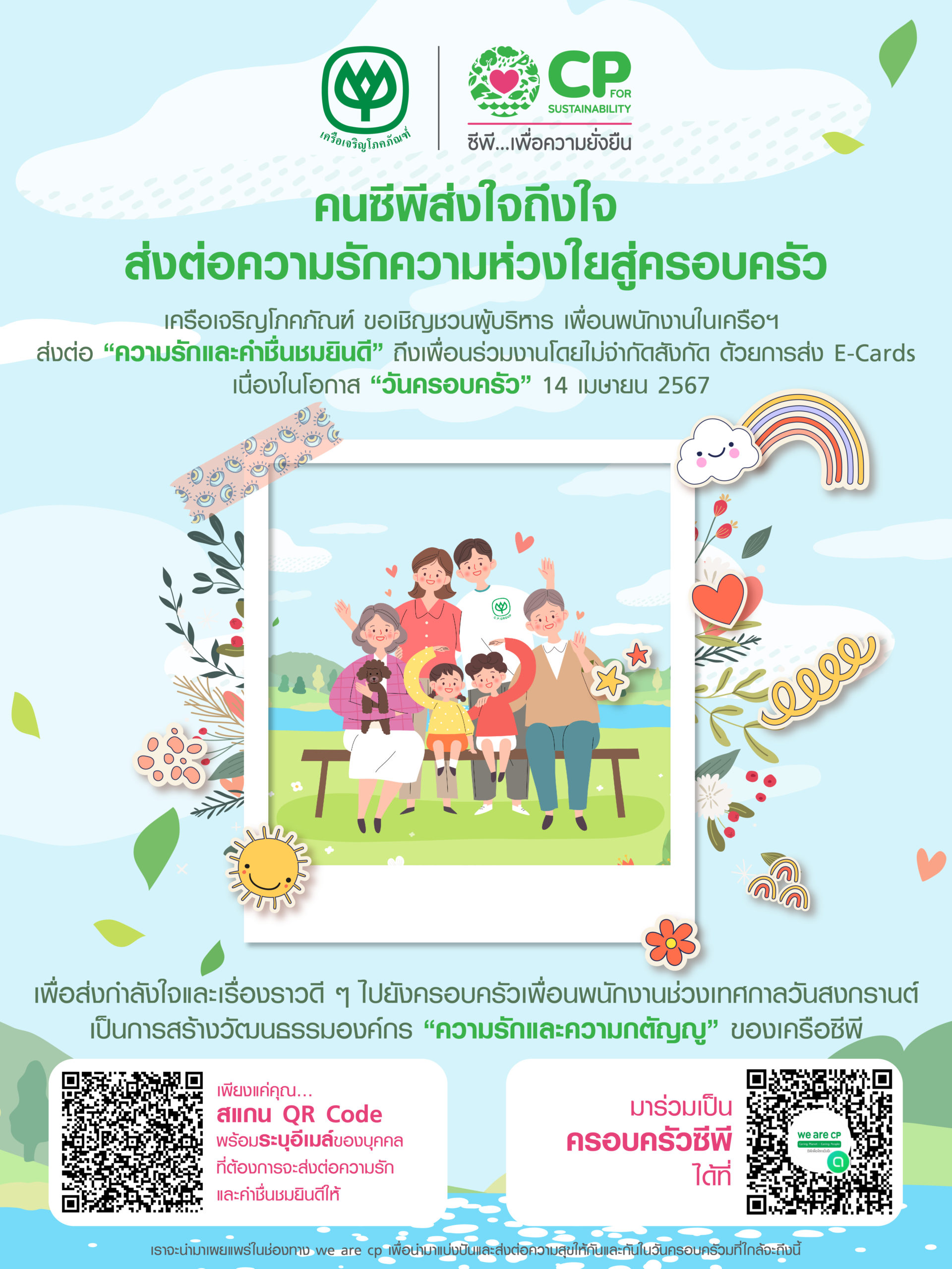 เนื่องในโอกาส “วันครอบครัว” 14 เมษายน 2567 เพื่อส่งกำลังใจและเรื่องราวดี ๆ ผ่านไปยังครอบครัวเพื่อนพนักงานช่วงเทศกาลวันสงกรานต์ เป็นการสร้างวัฒนธรรมองค์กรของเครือซีพีที่เชื่อใน “ความรักและความกตัญญู”