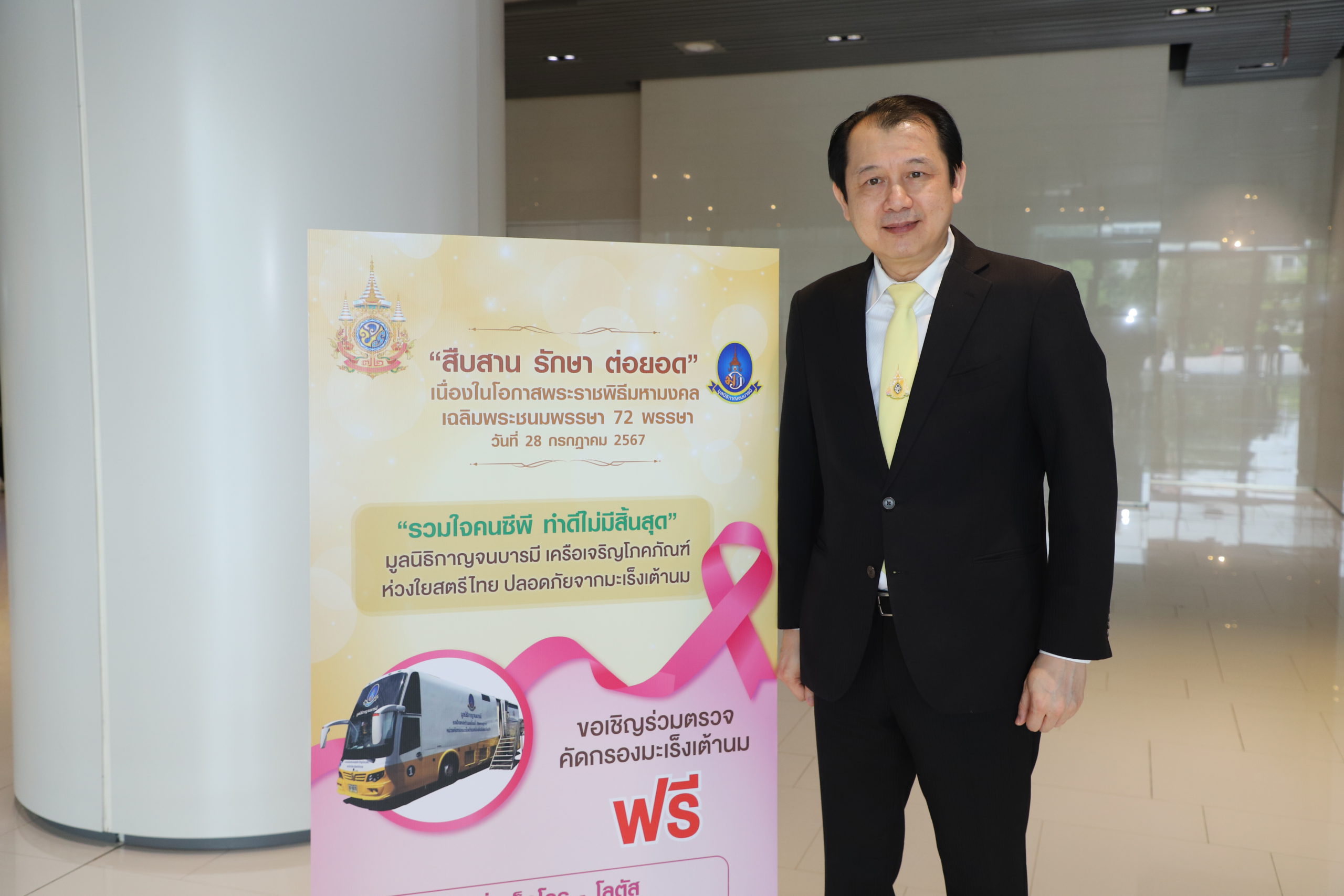 ดร.นพ.สมยศ ดีรัศมี ประธานมูลนิธิกาญจนบารมี เปิดเผยว่า พระบาทสมเด็จพระเจ้าอยู่หัวทรงให้ความสำคัญและทรงห่วงใยในการดูแลสุขภาพอนามัยของราษฎร โดยเฉพาะสตรีที่มีปัจจัยเสี่ยงต่อการเกิดโรคมะเร็งเต้านมที่อยู่ในพื้นที่ชนบท ห่างไกล และด้อยโอกาส ให้ได้เข้าถึงการตรวจรักษาด้วยเครื่องมือที่ทันสมัยที่สุด โดยไม่เสียค่าใช้จ่าย จึงทรงพระกรุณาโปรดเกล้าโปรดกระหม่อมให้มูลนิธิกาญจนบารมีดำเนินโครงการคัดกรองมะเร็งเต้านมด้วยเครื่องเอกซเรย์เต้านม (Mammogram) เคลื่อนที่ออกให้บริการในภูมิภาคต่าง ๆ ของประเทศไทย ตั้งแต่ปี 2557 จนถึงปัจจุบันรวม 10 ปี มีการตรวจคัดกรองผู้ที่มีปัจจัยเสี่ยงต่อมะเร็งเต้านมไปแล้ว 1,200,000 ราย ตรวจเอกซเรย์เต้านมพร้อมกับทำอัลตร้าซาวด์เต้านมจำนวน 140,000 ราย พบเป็นมะเร็งเต้านมระยะเริ่มแรก 3,500 ราย ซึ่งทำให้ผู้ตรวจสามารถรักษาได้ทันท่วงที และเนื่องในโอกาสมหามงคลเฉลิมพระชนมพรรษาพระบาทสมเด็จพระเจ้าอยู่หัว ทรงเจริญพระชนมพรรษา 72 พรรษา 28 กรกฎาคม 2567 มูลนิธิกาญจนบารมีได้ร่วมมือกับเครือซีพีในการรณรงค์ส่งเสริมการป้องกันมะเร็งเต้านมในสตรีกลุ่มเสี่ยงและด้อยโอกาสให้ได้รับการตรวจคัดกรองเบื้องต้นด้วยรถเอกซเรย์เต้านมเคลื่อนที่ด้วยเครื่องแมมโมแกรมที่มีประสิทธิภาพสูง 3 มิติ พร้อมอุปกรณ์ โดยมีทีมแพทย์และพยาบาลผู้เชี่ยวชาญในการตรวจเบื้องต้น