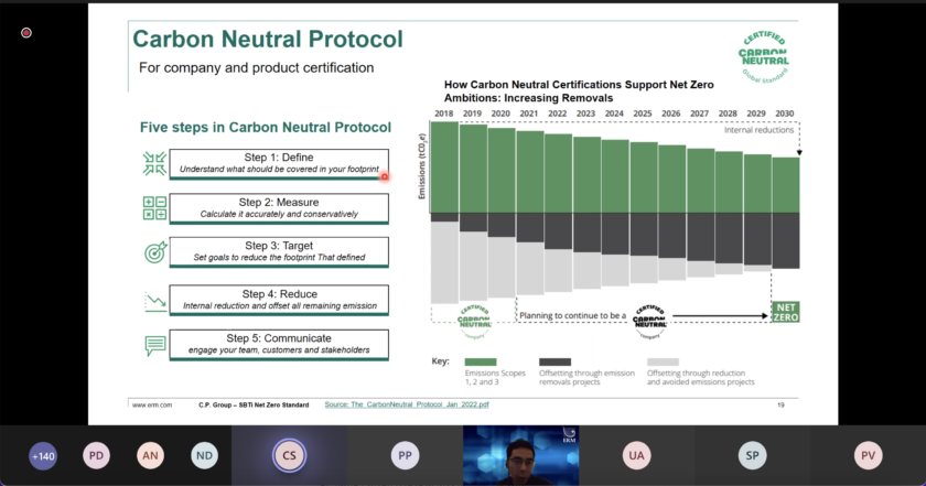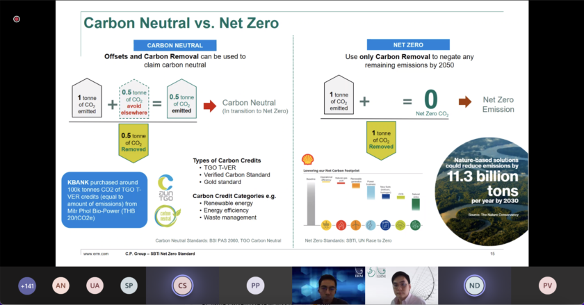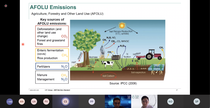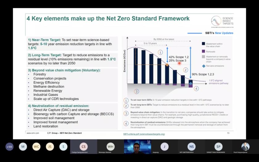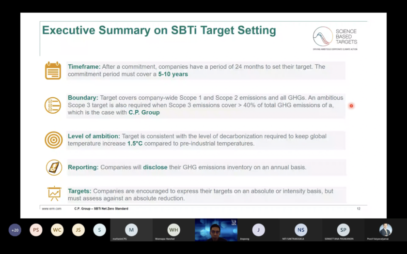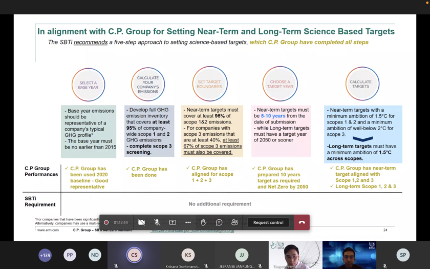 เมื่อเร็ว ๆ นี้ เครือเจริญโภคภัณฑ์ โดยสำนักบริหารความยั่งยืน ธรรมาภิบาล และสื่อสารองค์กร เครือเจริญโภคภัรฑ์ จัดสัมมนา C.P. Group – ERM Webinar on “SBTi Corporate Net-Zero Standards” โดยได้รับเกียรติจากทีมงานบริษัท Environmental Resources Management หรือ ERM ผู้เชี่ยวชาญด้านความยั่งยืนมาให้ความรู้ผ่านระบบออนไลน์ โดยมีผู้เข้าร่วมสัมมนาจากกลุ่มธุรกิจต่าง ๆ ของเครือฯ กว่า 130 คน