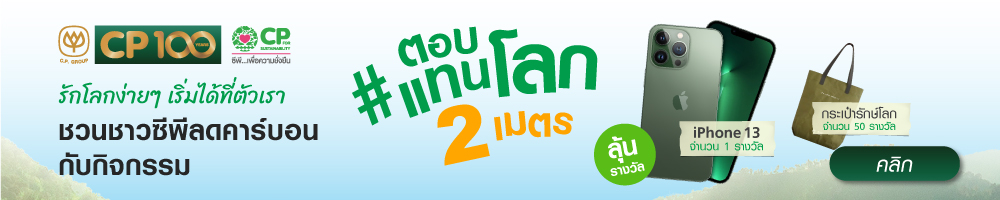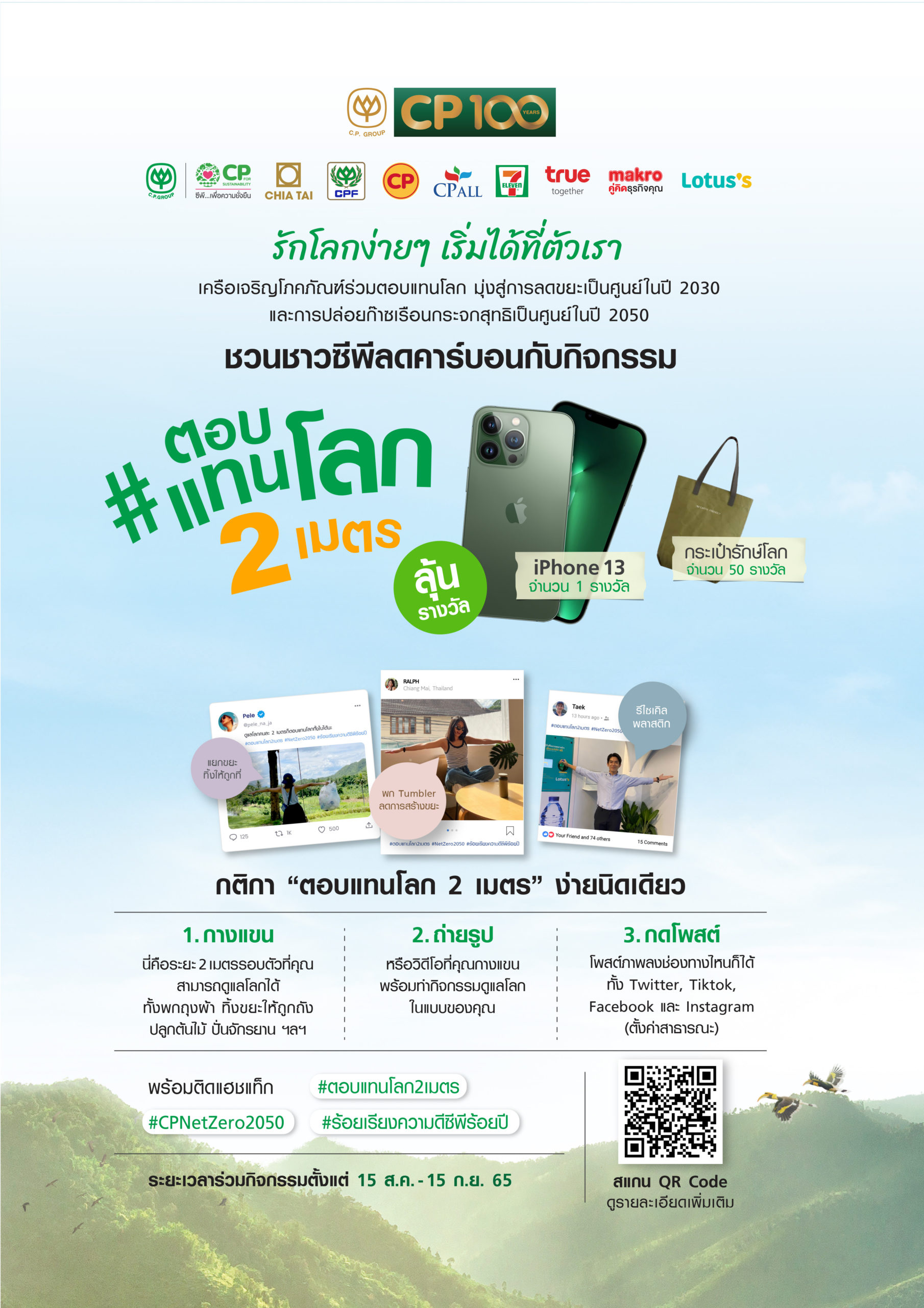 เครือเจริญโภคภัณฑ์ชวนลดคาร์บอน ช่วยโลกง่ายๆ ได้ลุ้น Iphone 13 กับ กิจกรรม ตอบแทนโลก 2 เมตร มุ่งสู่การลดขยะเป็นศูนย์ ภายในปี 2030 และการปล่อยก๊าซเรือนกระจกสุทธิเป็นศูนย์ ภายในปี 2050 เพียงแค่…