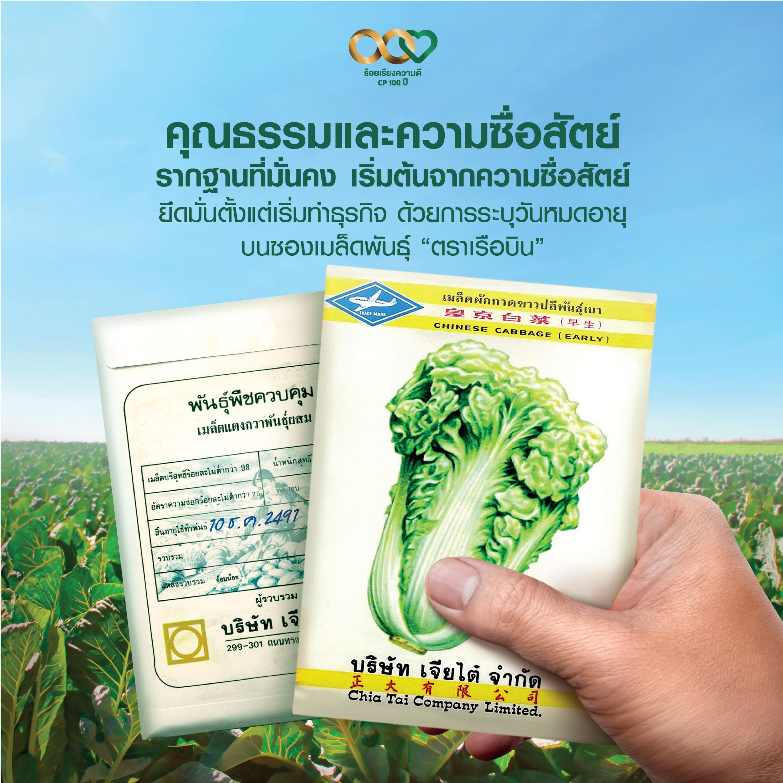 เครือเจริญโภคภัณฑ์เริ่มต้นจากร้านขายเมล็ดพันธุ์ผัก “เจียไต้จึง” เมื่อปีพ.ศ. 2464 บนถนนทรงสวัสดิ์ ย่านเยาวราช ก่อตั้งโดยสองพี่น้อง ชาวจีนโพ้นทะเลจากฆณฑลกวางตุ้ง “นายเจี่ย เอ็กชอ” และ “นายเจี่ย เซี่ยวฮุย” จุดเริ่มต้นสำคัญที่มาพร้อมกับคำสอนให้ลูกหลานทำการค้าด้วยการยึดมั่นในหลัก “คุณธรรมและความซื่อสัตย์” สะท้อนผ่านความใส่ใจลูกค้าด้วยการ ระบุวันหมดอายุไว้บนเมล็ดพันธุ์ผักตรา “เรือบิน” ในทุกซองอย่างชัดเจน นับเป็นครั้งแรกของเมืองไทยที่มีการรับประกันสินค้าด้านการเกษตร เพื่อให้ลูกค้าได้เมล็ดพันธุ์ที่มีคุณภาพ จากจุดเริ่มต้นกลายมาเป็นรากฐานที่สำคัญถ่ายทอดให้ผู้บริหารและพนักงานในเครือซีพีทุกคนยึดมั่นมาตลอด 100 ปี