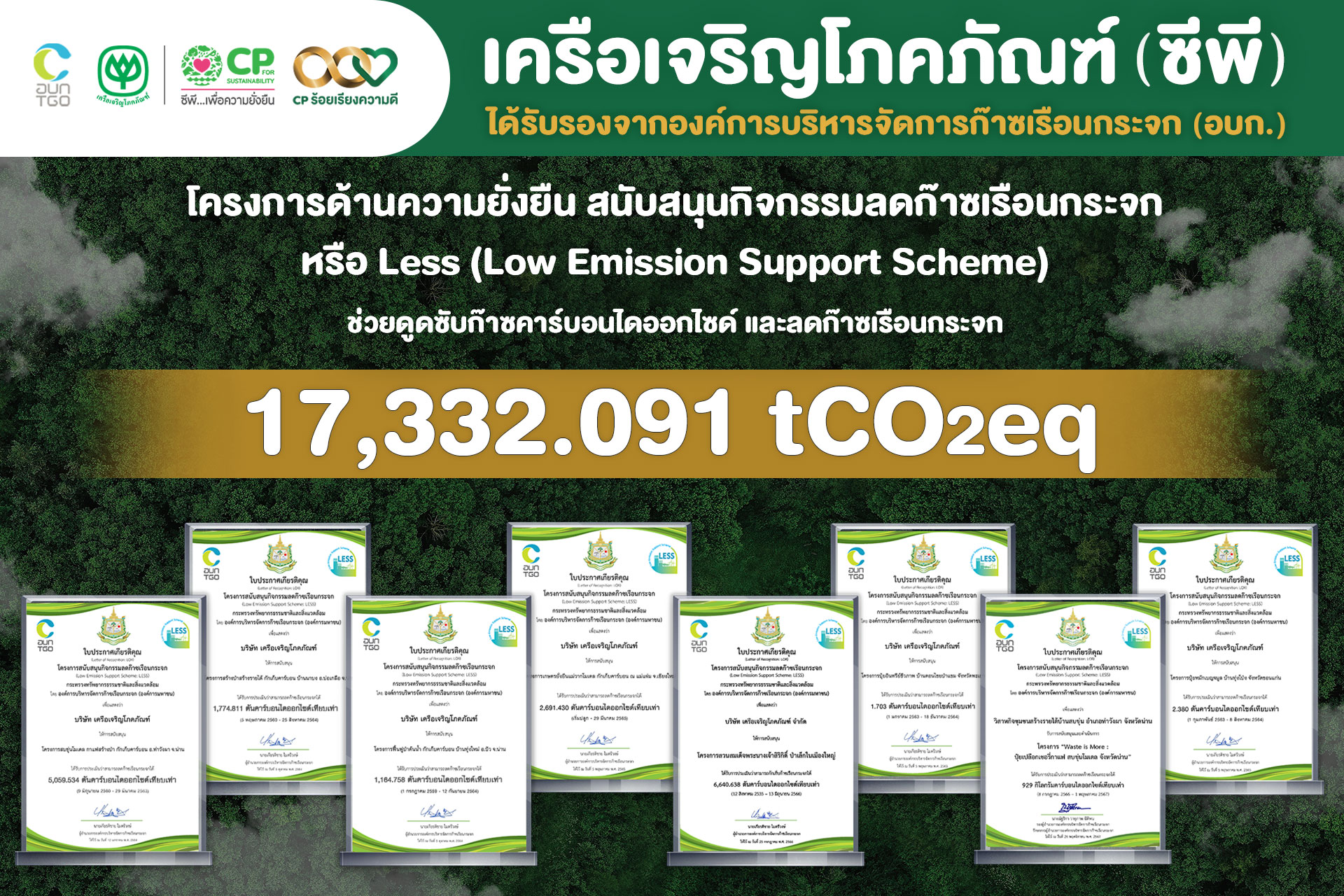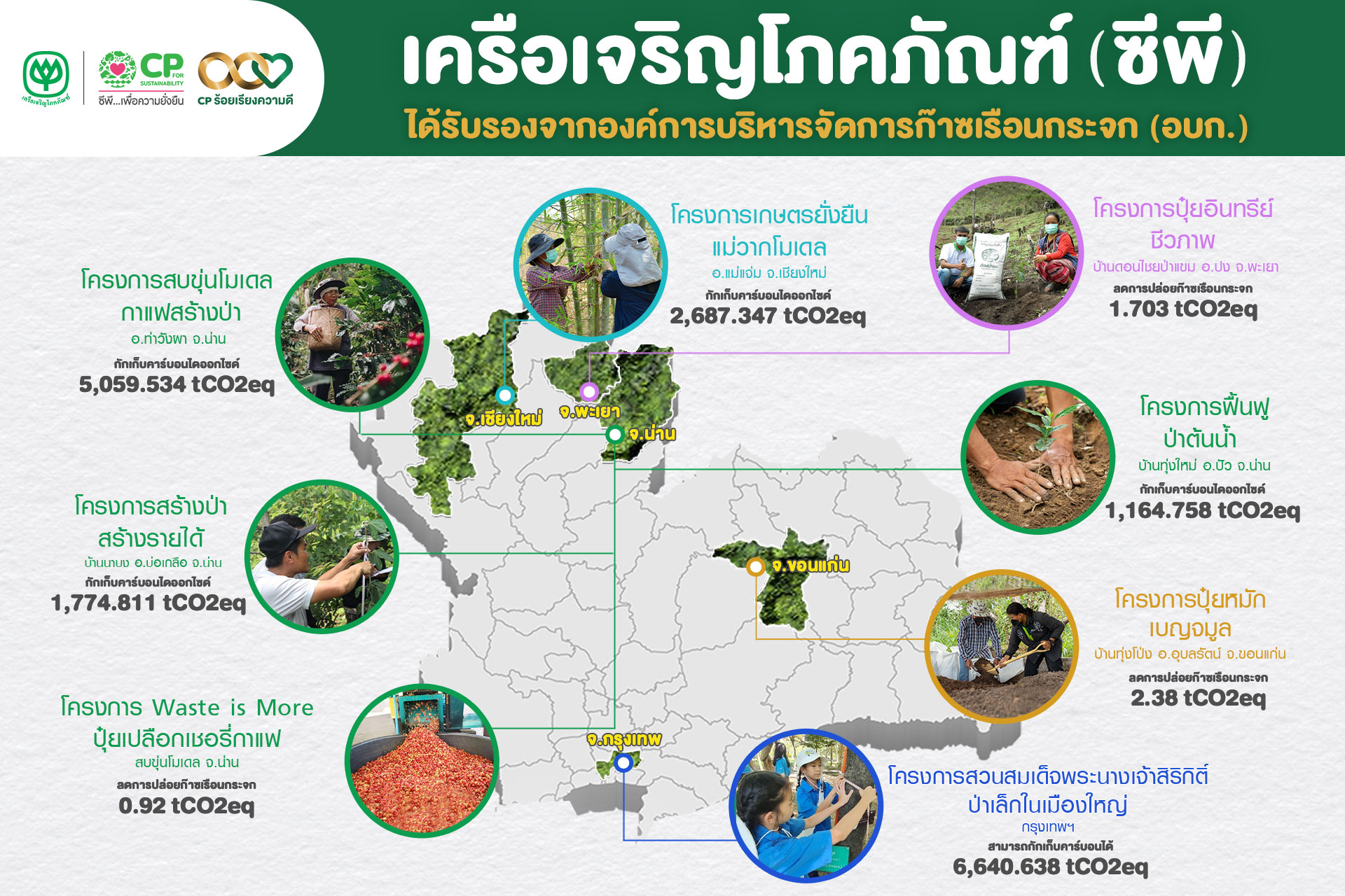 โดยล่าสุดในปี 2567 ได้รับการรับรองเพิ่มในโครงการ “Waste is More : ปุ๋ยเปลือกเชอรี่กาแฟ สบขุ่นโมเดล จ.น่าน” โดยนำเปลือกกาแฟเชอรี่ที่เหลือทิ้งจากการแปรรูป มาทำเป็นปุ๋ยอินทรีย์หมุนเวียนกลับไปใช้ซ้ำ สามารถลดการปล่อยก๊าซเรือนกระจกได้ 0.92 tCO2eq ทั้งนี้ 8 โครงการดังกล่าวฯ สามารถกักเก็บคาร์บอนและลดก๊าซเรือนกระจก สะสมรวม 17,332.091 tCO2eq โดยเป็นโครงการที่เครือซีพีสนับสนุนด้านอนุรักษ์ ฟื้นฟูธรรมชาติและสิ่งแวดล้อม เพื่อผลักดันเป้าหมายมุ่งสู่องค์กรปลดปล่อยก๊าซเรือนกระจกเป็นศูนย์ พร้อมทั้งลดความเหลื่อมล้ำที่ถือเป็นอีกความท้าทายของโลก โดยช่วยยกระดับคุณภาพชีวิตชุมชน สร้างโอกาสทางด้านอาชีพและรายได้อย่างยั่งยืน