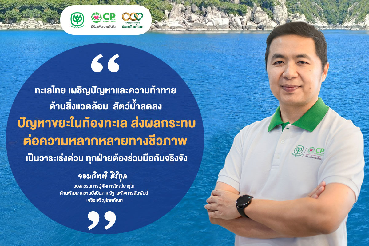 คุณจอมกิตติ ศิริกุล รองกรรมการผู้จัดการใหญ่อาวุโส ด้านพัฒนาความยั่งยืนภาครัฐและกิจการสัมพันธ์ เครือเจริญโภคภัณฑ์ เปิดเผยว่า ปัจจุบันท้องทะเลไทย เผชิญปัญหาและความท้าทายเป็นวงกว้างทั้งในด้านสิ่งแวดล้อม ปริมาณสัตว์น้ำลดลง ปัญหาเรื่องขยะในท้องทะเลและชายฝั่ง ที่ส่งผลกระทบต่อทรัพยากรธรรมชาติและความหลากหลายทางชีวภาพ ถือเป็นวาระเร่งด่วนที่ทุกฝ่าย ทุกหน่วยงานต้องร่วมมือกันอย่างจริงจัง โดยหลายปีที่ผ่านมา เครือเจริญโภคภัณฑ์(ซีพี) มีนโยบายขับเคลื่อนงานด้านความยั่งยืนทั้งทางบกและทางทะเลอย่างต่อเนื่องในหลายจังหวัดทั่วประเทศ เพื่อให้บรรลุแนวทางการพัฒนาที่ยั่งยืน 17SDGs สำหรับภาคทางทะเล ขับเคลื่อนภายใต้นโยบาย “SEACOSYSTEM เพื่อทะเลไทยที่ยั่งยืน” ที่จะบูรณาการร่วมกับภาคีเครือข่าย ทั้งภาครัฐ ภาคเอกชน ภาคประชาสังคม ภาคการศึกษา และชุมชน ครอบคลุมทั้งอ่าวไทยและอันดามัน ผ่านภารกิจงาน 6 ด้าน ด้านแรก คือ การอนุรักษ์ ปกป้อง ฟื้นฟูทรัพยากรทางทะเลให้ยั่งยืน ด้านที่สอง คือ การสร้างสมดุล 3 มิติ ทั้งเศรษฐกิจ สังคม และสิ่งแวดล้อม ตามแนวคิดการอนุรักษ์ควบคู่การสร้างรายได้ ด้านที่สาม คือ การขับเคลื่อนทางนโยบายระดับท้องถิ่น จังหวัด ตลอดจนถึงระดับประเทศ ยกระดับการพัฒนาทะเลไทยอย่างจริงจังและยั่งยืน ด้านที่สี่ สนับสนุนการขับเคลื่อนพัฒนา ยกระดับกลุ่มประมงพื้นบ้านและสนับสนุนการจัดตั้งเครือข่าย เพื่อสร้างความเข้มแข็ง ด้านที่ห้า ส่งเสริมการแปรรูปเพิ่มมูลค่าสินค้าทางทะเล การท่องเที่ยวและธุรกิจโดยชุมชน และด้านที่หก การสื่อสารสู่สาธารณะ เพื่อสร้างความตระหนักรู้ ความสำคัญของทรัพยากรทางทะเลแก่สังคม โดยทั้งหมดนี้ มีเป้าหมายปกป้องระบบนิเวศทางทะเลและชายฝั่งให้กลับมาอุดมสมบูรณ์ ผลักดันเศรษฐกิจชุมชน สร้างอาชีพด้านการประมงที่เหมาะสม สร้างชุมชนเข้มแข็งโดยการให้ความรู้ สร้างความเข้าใจให้เป็นกลไกทางสังคมในการอยู่ร่วมกับทรัพยากรทางทะเลได้อย่างพึ่งพาอาศัย เป็นห่วงโซ่อุปทานที่ยั่งยืน