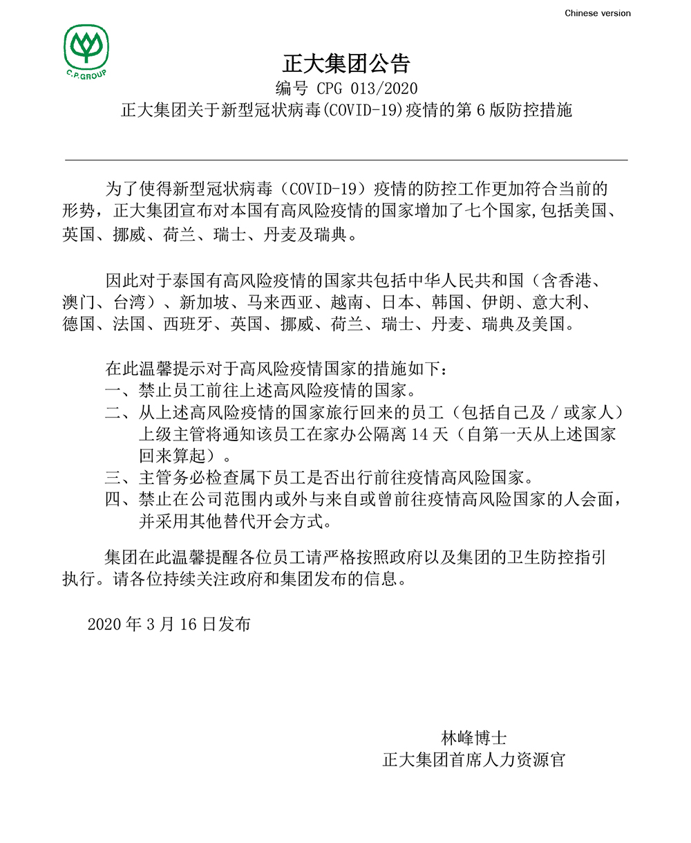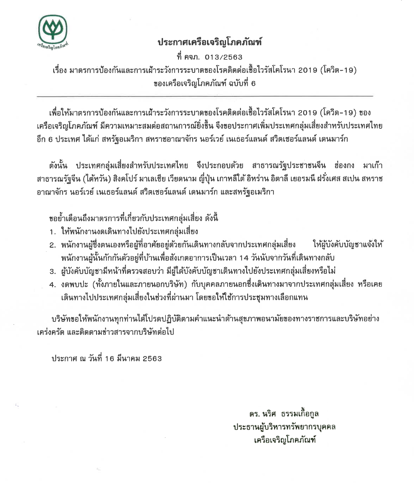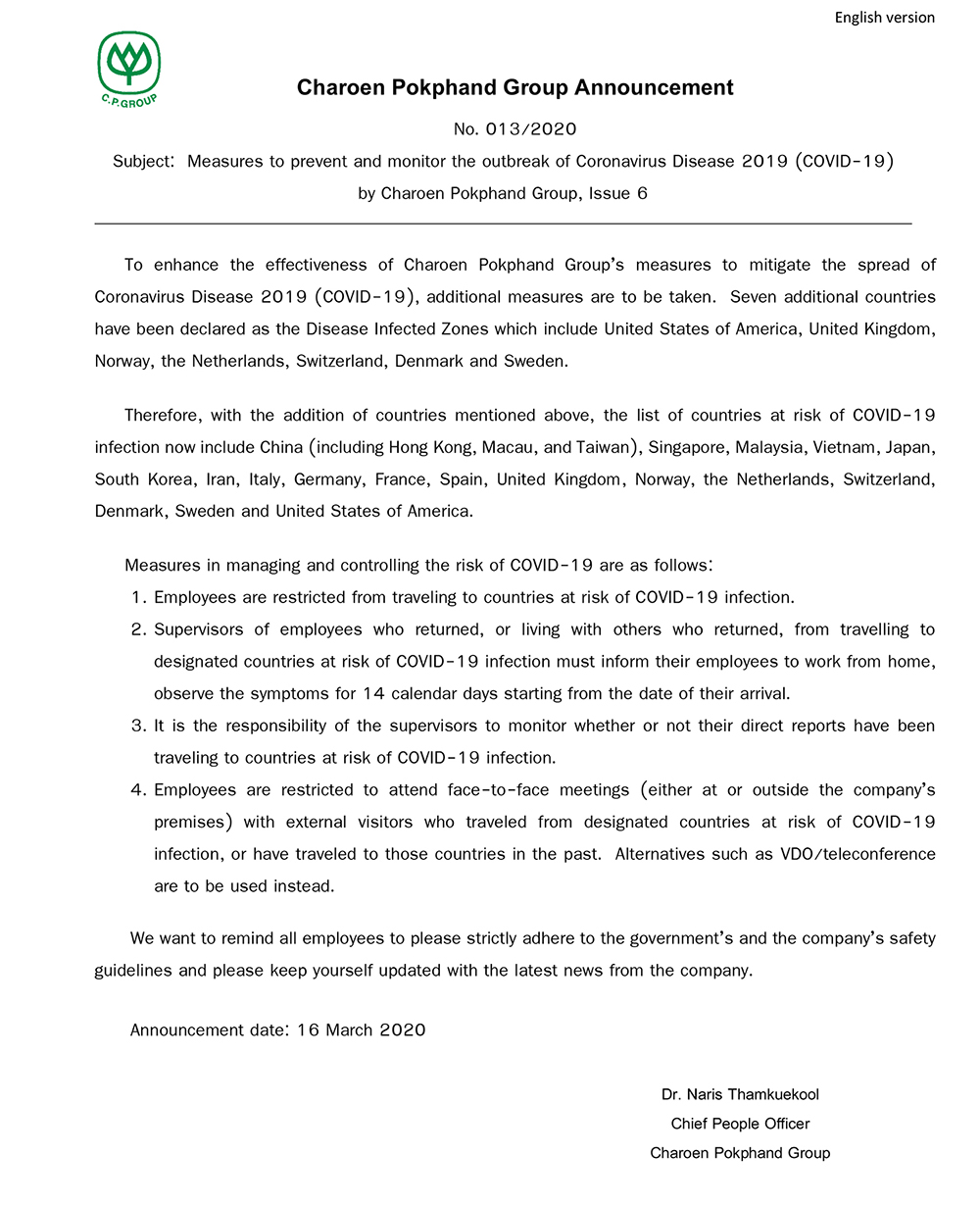 เครือซีพีประกาศมาตรการป้องกันฯไวรัสโควิด-19 ฉบับที่ 6