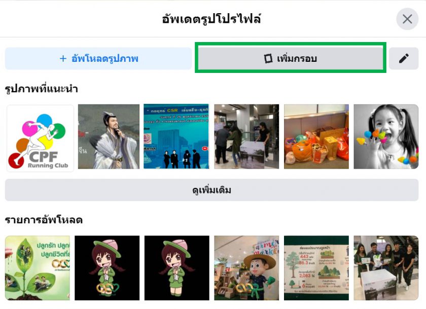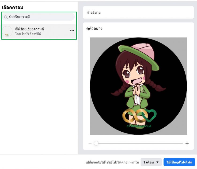 3. ในช่องค้นหา พิมพ์ ‘ซีพีร้อยเรียงความดี’ เลือกกรอบที่จัดทำโดย ใบบัว วีอาร์ซีพี ปรับขนาดรูปโปรไฟล์ของคุณ และเลือกใช้เป็นรูปโปรไฟล์