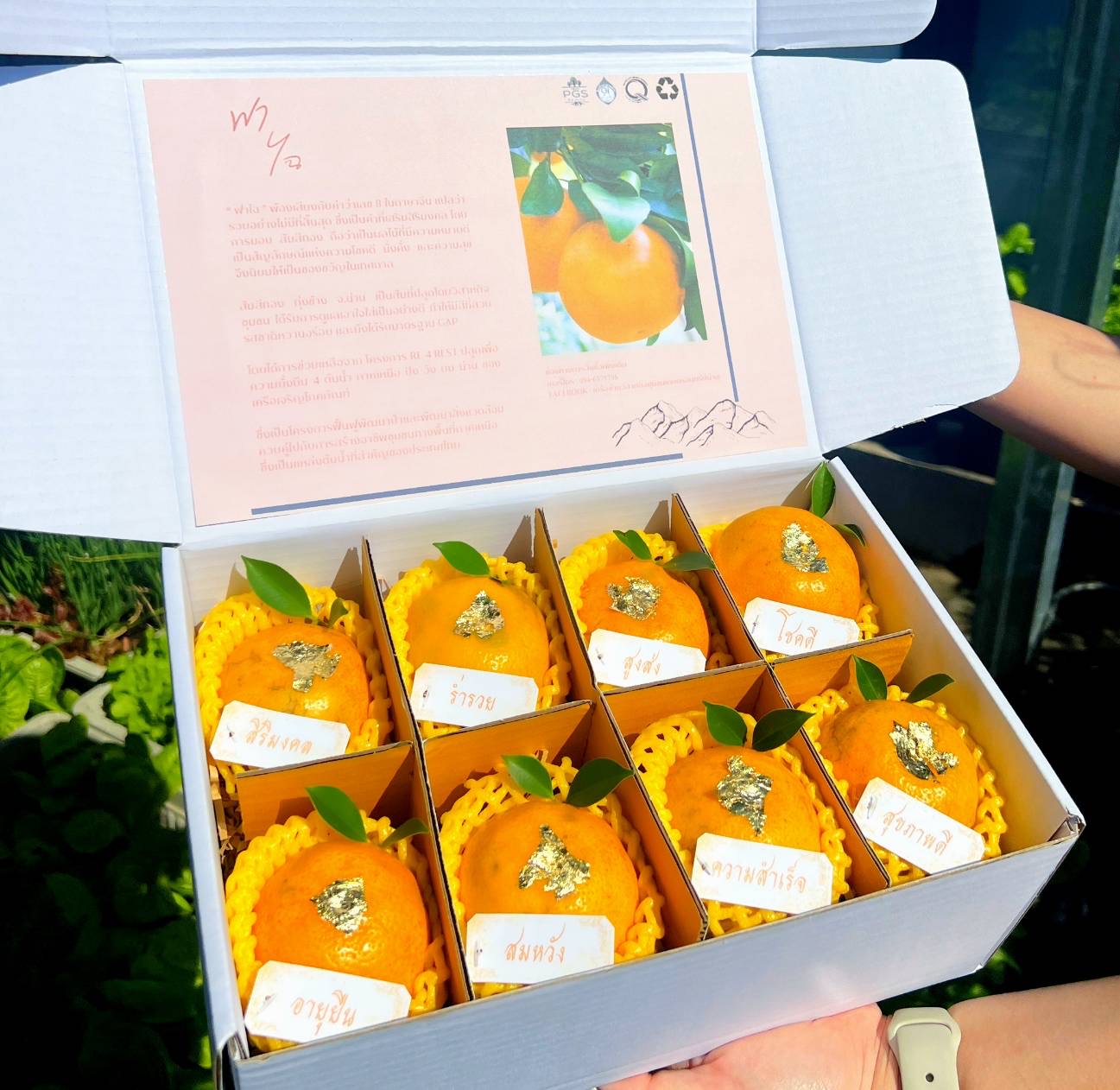 ส้มสีทองจำนวน 8 ผล บรรจุในกล่องสวยงาม