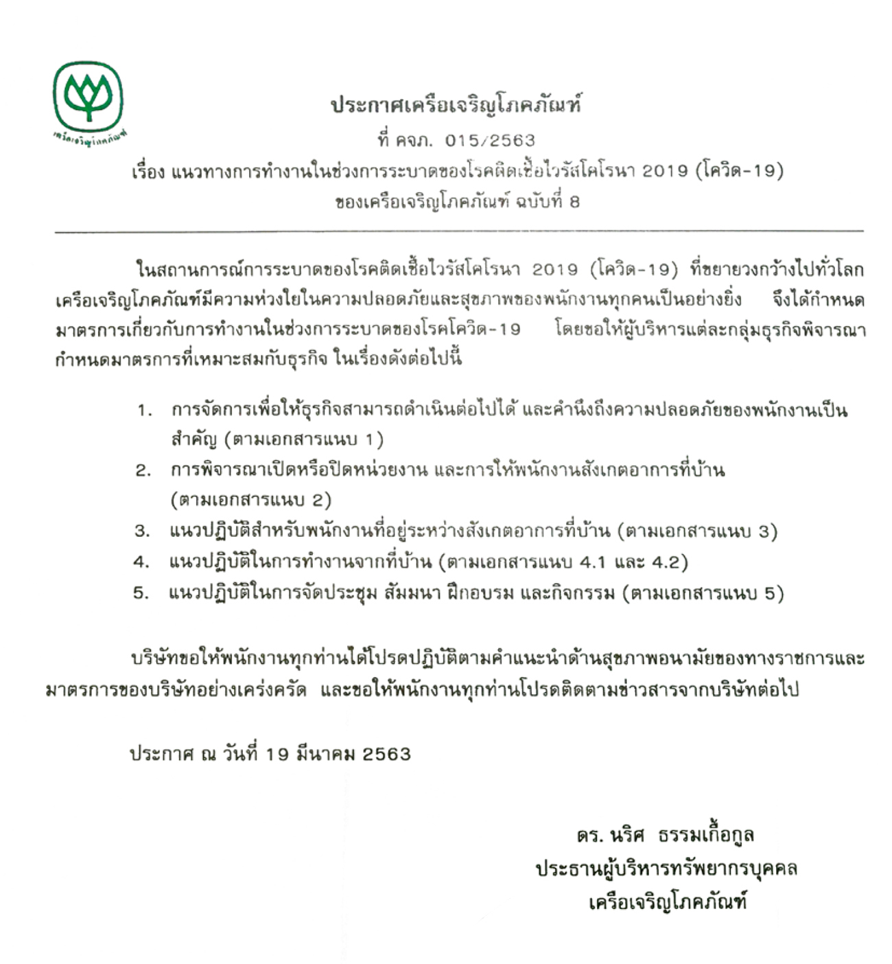ในสถานการณ์การระบาดของโรคติดเชื้อไวรัสโคโรนา 2019 (โควิด-19) ที่ขยายวงกว้างไปทั่วโลก เครือเจริญโภคภัณฑ์มีความห่วงใยในความปลอดภัยและสุขภาพของพนักงานทุกคนเป็นอย่างยิ่ง จึงได้กำหนดมาตรการเกี่ยวกับการทำงานในช่วงการระบาดของโรคโควิด-19 โดยขอให้ผู้บริหารแต่ละกลุ่มธุรกิจพิจารณากําหนดมาตรการที่เหมาะสมกับธุรกิจ ในเรื่องดังต่อไปนี้