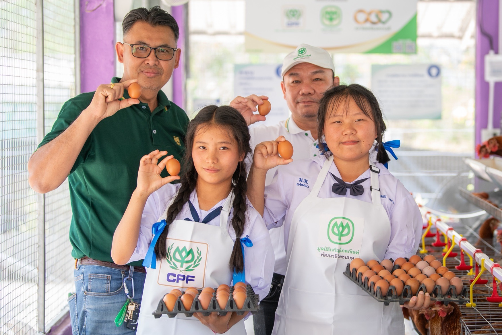 โครงการเลี้ยงไก่ไข่เพื่ออาหารกลางวันนักเรียน เป็นโครงการสำคัญของมูลนิธิฯ ร่วมกับบริษัท ซีพีเอฟ (ประเทศไทย) หรือ CPF ส่งเสริมให้เด็กและเยาวชนในโรงเรียนพื้นที่ห่างไกลได้รับประทานโปรตีนจากไข่ไก่อย่างเพียงพอ เป็นรากฐานสําคัญของการเติบโตอย่างแข็งแรงและพัฒนาศักยภาพได้อย่างเต็มที่ นอกจากนี้ ยังส่งเสริมให้โรงเรียนพัฒนาหลักสูตรการเลี้ยงไก่ไข่เชิงอาชีพ ให้นักเรียนได้เรียนรู้ตั้งแต่กระบวนการเลี้ยง การจัดการฟาร์ม ไปจนถึงการแปรรูป ผลิตภัณฑ์จากไก่ไข่เพื่อใช้บริโภคภายในโรงเรียน และต่อยอดเป็นธุรกิจ สร้างรายได้หมุนเวียนกลับคืนสู่โรงเรียนและ ชุมชนอย่างยั่งยืน