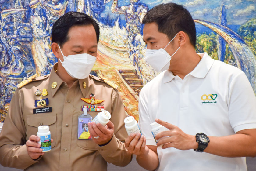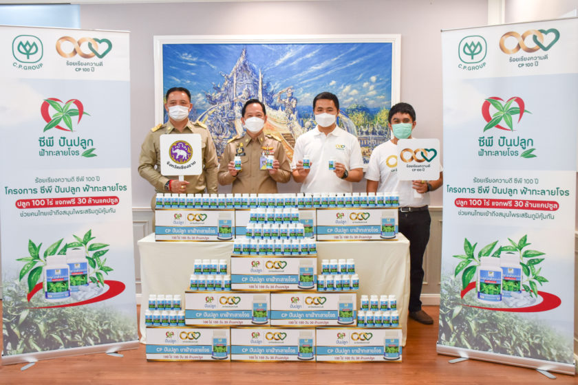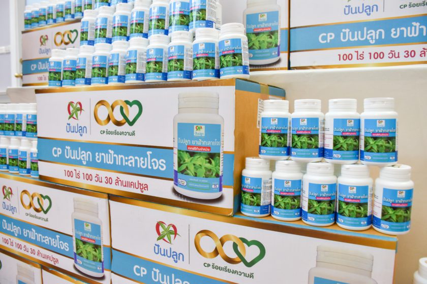 ทั้งนี้ เครือซีพีดำเนินการปลูกต้นฟ้าทะลายโจรบนที่ดิน 100 ไร่ใน จ.สระบุรี และเก็บเกี่ยวเพื่อนำมาผลิตยาฟ้าทะลายโจร 30 ล้านแคปซูล แจกจ่ายฟรีแก่ประชาชน เพราะฟ้าทะลายโจรมีสรรพคุณช่วยป้องกันไข้หวัดสร้างภูมิคุ้มกัน โดยได้ผ่านการรับรองมาตรฐานการปฏิบัติทางการเกษตรที่ดี (GAP) จากกรมวิชาการเกษตร กระทรวงเกษตรและสหกรณ์ พร้อมทั้งการบรรจุแคปซูลยังได้รับรองมาตรฐานจาก GMP PIC/S ซึ่งเป็นมาตรฐานสำคัญของโรงงานผลิตยา และดำเนินการผลิตตามพ.ร.บ.ยาสมุนไพร ผ่านการรับรองการขึ้นทะเบียนยาสมุนไพร กับสำนักงานคณะกรรมการอาหารและยาที่มีข้อกำหนดด้านปริมาณสารสำคัญ แอนโดรกราโฟไลด์ (andrographolide) ในวัตถุดิบอย่างเคร่งครัด