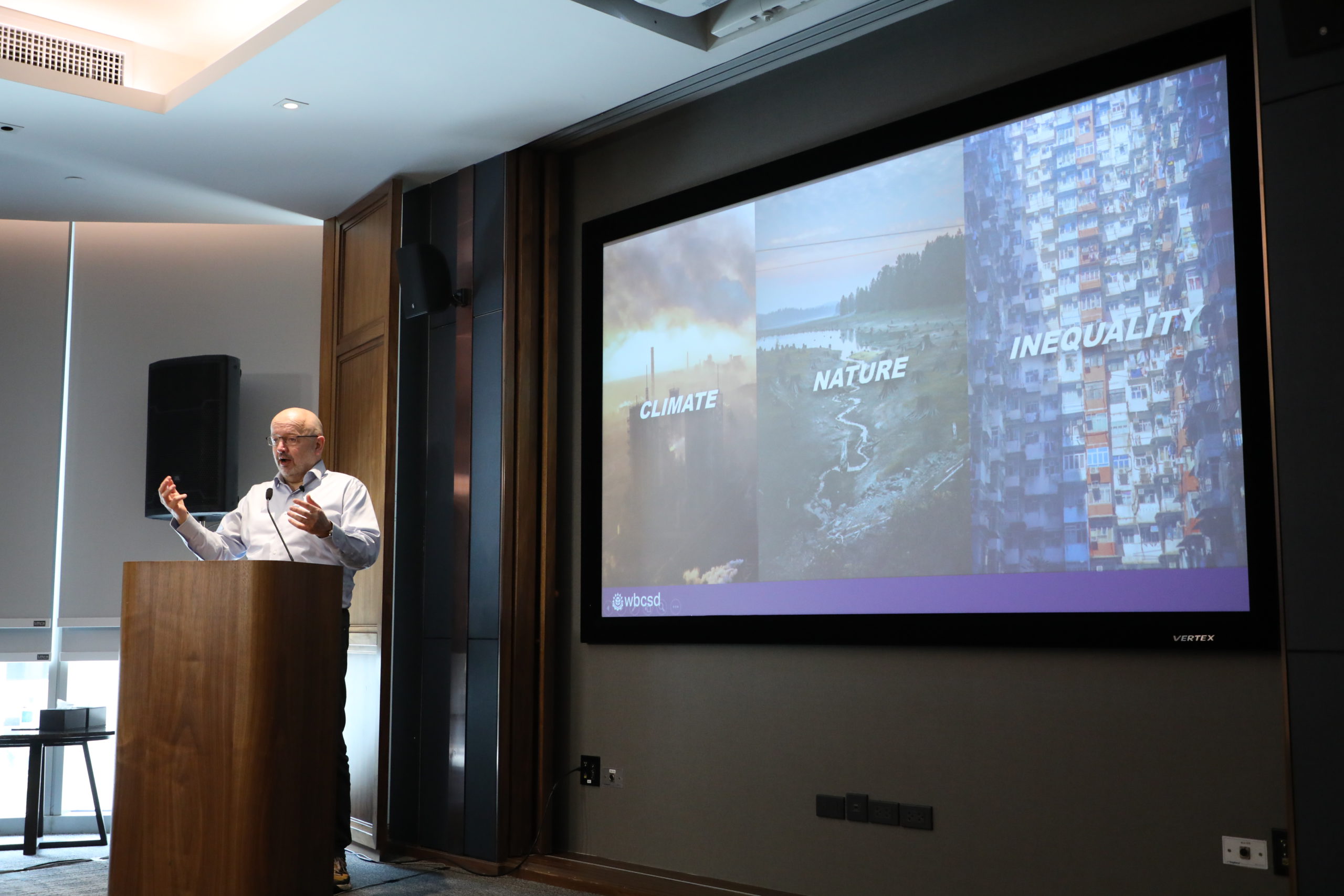 Mr. Peter Bakker explained how businesses are held to a higher standard in today’s world. It is no longer enough for them to avoid causing negative externalities – businesses are now expected to navigate and solve the modern world’s complexities and problems, with the top three issues being climate change, biodiversity loss, and inequality.
