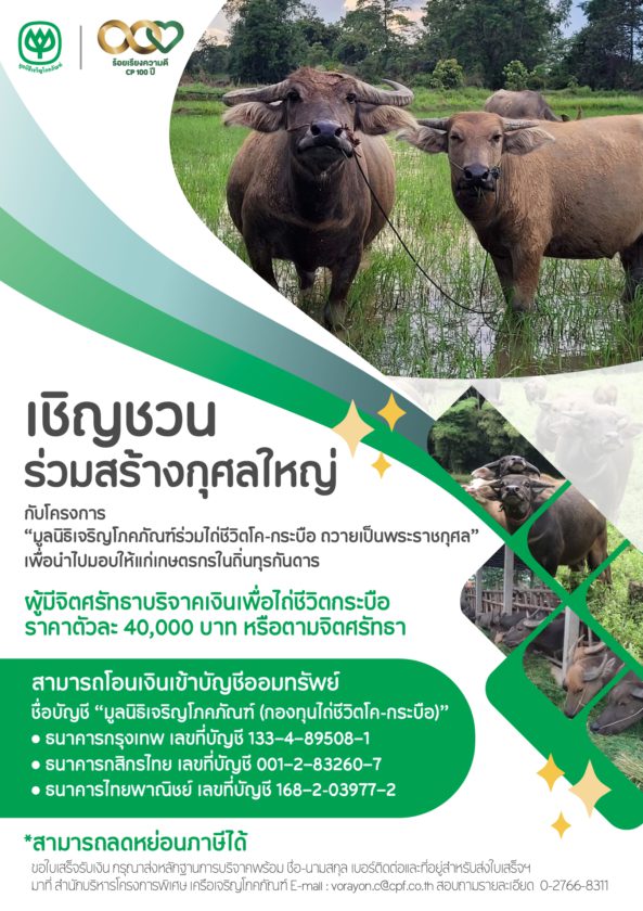 ชื่อบัญชี “มูลนิธิเจริญโภคภัณฑ์ (กองทุนไถ่ชีวิตโค-กระบือ)”