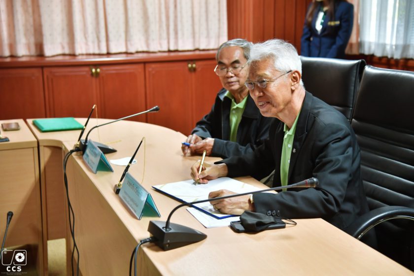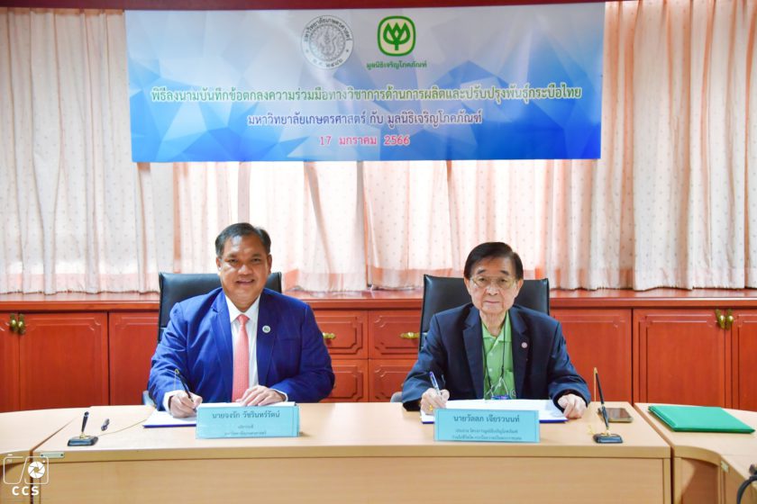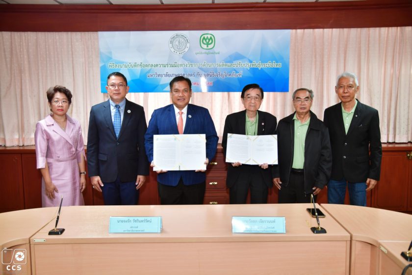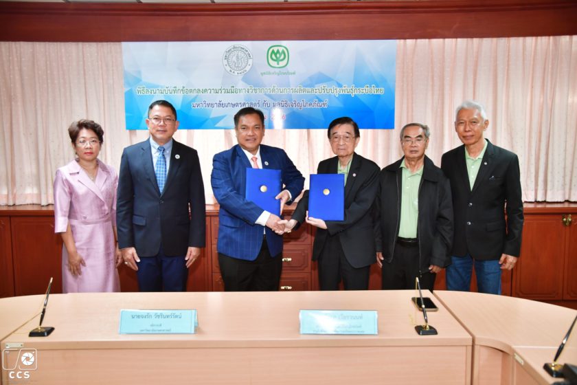 คุณวัลลภ เจียรวนนท์ รองประธานอาวุโส เครือเจริญโภคภัณฑ์ ในฐานะประธานโครงการมูลนิธิเจริญโภคภัณฑ์ ร่วมไถ่ชีวิตโค-กระบือถวายเป็นพระราชกุศล และ ดร.จงรัก วัชรินทร์รัตน์ อธิการบดี มหาวิทยาลัยเกษตรศาสตร์ ร่วมลงนามในบันทึกข้อตกลงความร่วมมือทางวิชาการด้านการผลิตและปรับปรุงพันธุ์กระบือ ระหว่างมูลนิธิเจริญโภคภัณฑ์ กับ มหาวิทยาลัยเกษตรศาสตร์ โดยเป็นครั้งแรกที่ภาคเอกชนและภาคการศึกษาร่วมกันศึกษา วิจัย และพัฒนาตามหลักวิชาการผลิตกระบือไทย การบริหารจัดการในเรื่องพันธุกรรม และการปรับปรุงพันธุ์กระบือ เพื่อให้เกิดประโยชน์ในการอนุรักษ์ พัฒนาอาชีพ และการเพิ่มจำนวนกระบือไทยให้มีประสิทธิภาพมากยิ่งขึ้น ณ ห้องประชุม 9 อาคารสารนิเทศ 50 ปี มหาวิทยาลัยเกษตรศาสตร์
