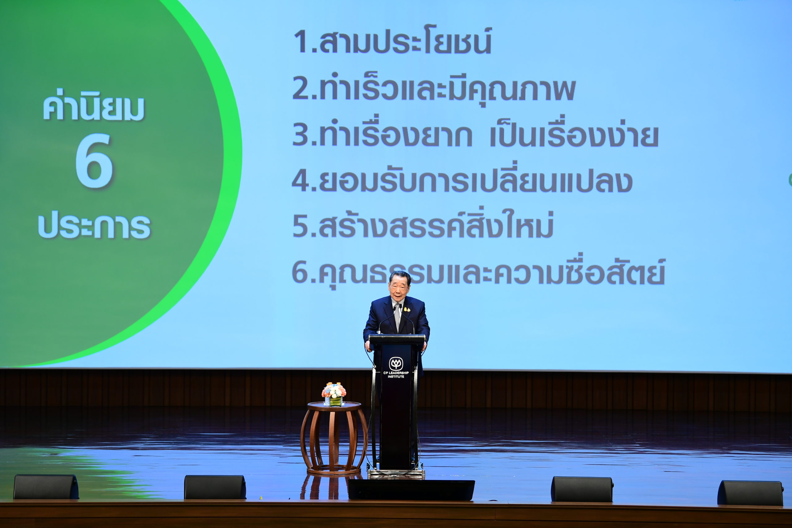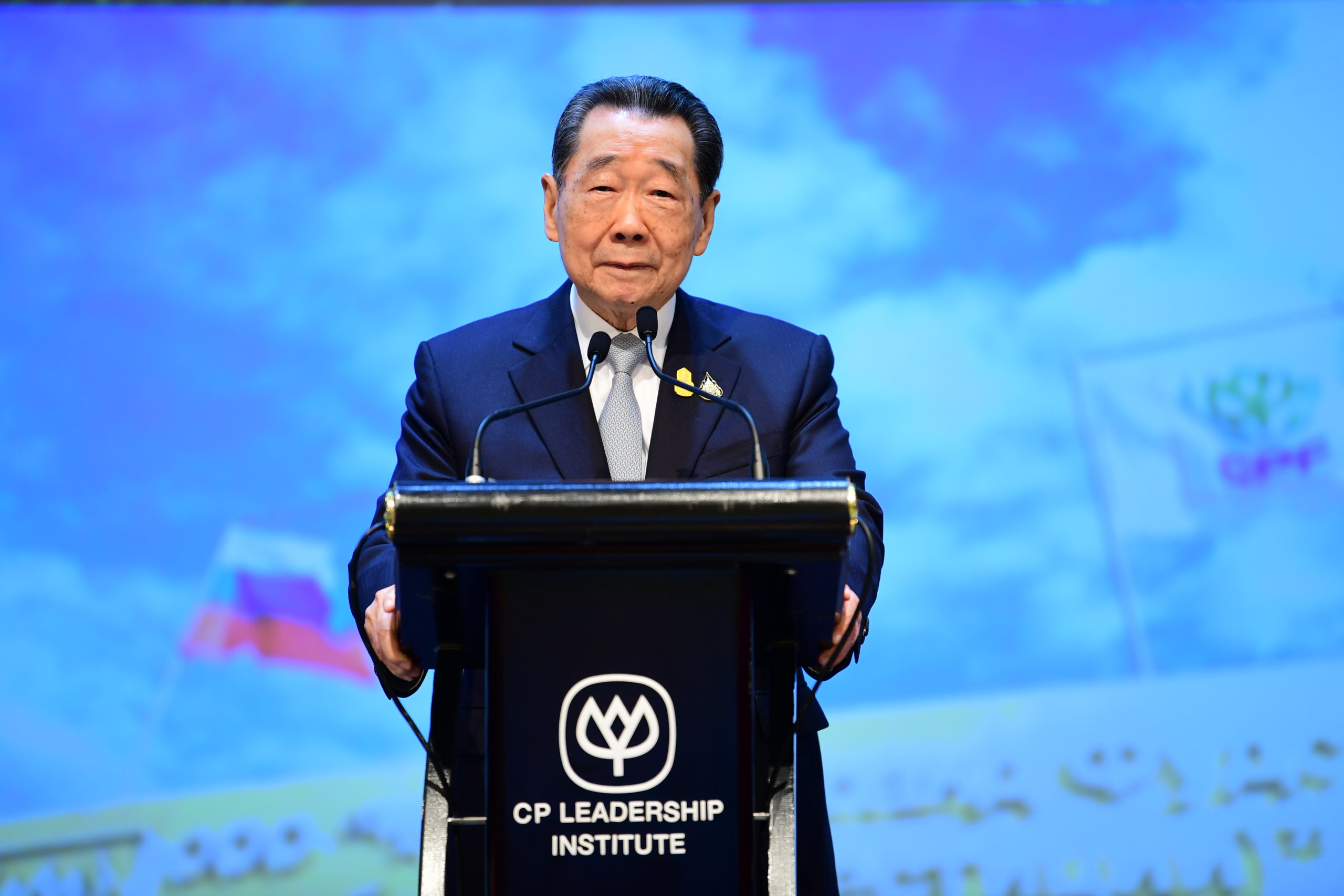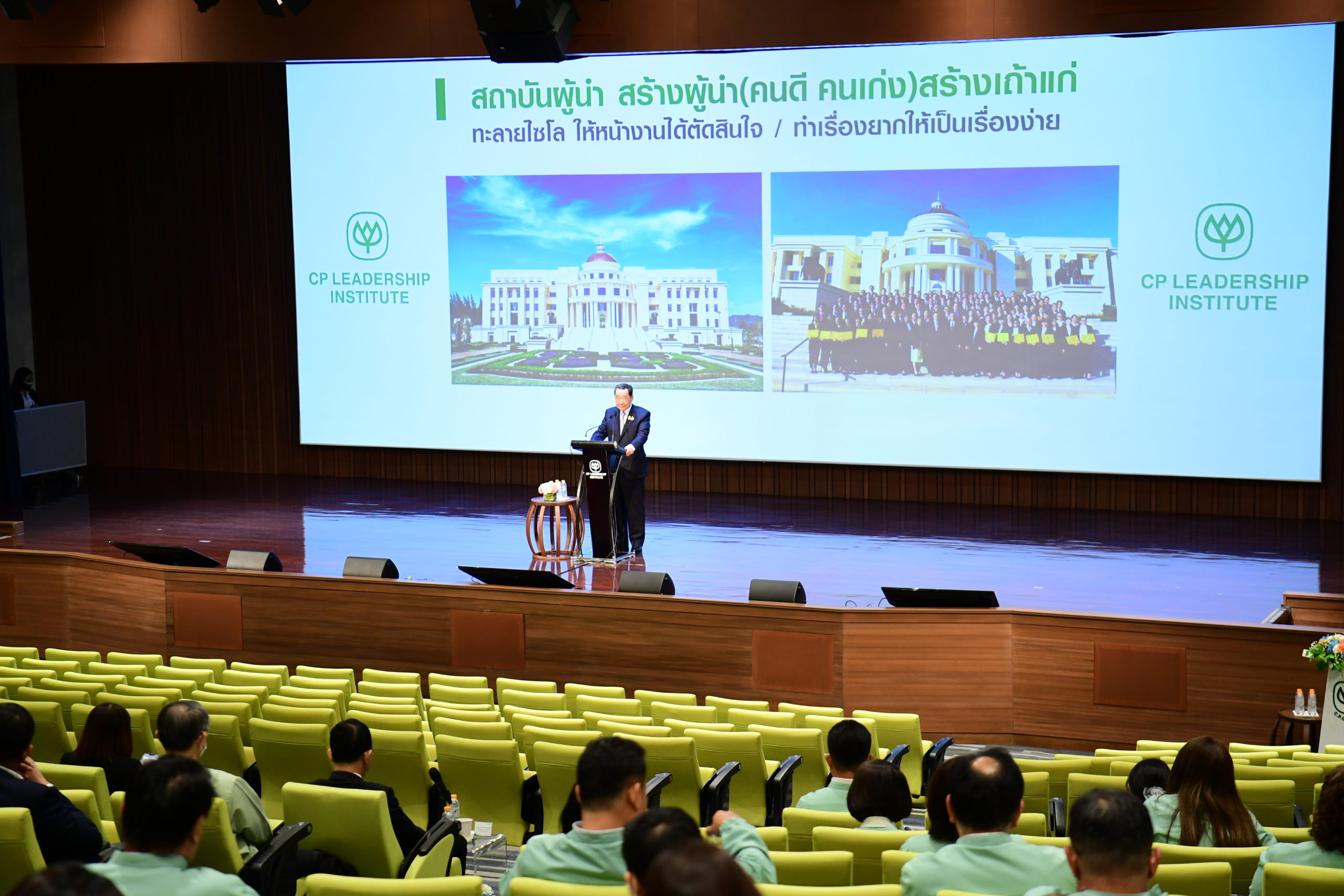 โดยท่านประธานอาวุโสธนินท์ เจียรวนนท์ ได้ให้เกียรติร่วมบรรยายพิเศษ ‘การสร้างผู้นำรับการเปลี่ยนแปลง’ แบ่งปันประสบการณ์และแนวคิดนักธุรกิจภายใต้ค่านิยม 6 ประการเครือเจริญโภคภัณฑ์  โดยเผยว่า ปัจจุบันโลกเปลี่ยนแปลงอย่างรวดเร็วในหลายมิติ โดยเฉพาะอย่างยิ่งเทคโนโลยีและนวัตกรรม อาทิ โรงงานที่มีหุ่นยนต์เข้ามาเสริมทัพ หรืออุตสาหกรรมรถยนต์ไฟฟ้า ทั้งยังมีข้อมูลมากมายที่สามารถนำมาผสมผสานกับนวัตกรรมเพื่อขับเคลื่อนธุรกิจ พนักงานของเครือซีพีจึงต้องยอมรับการเปลี่ยนแปลงและปรับตัวให้เร็ว การสร้างผู้นำในแบบฉบับของซีพีคือ ‘มุ่งเน้นคนดี คนเก่ง และมีความกตัญญูเป็นสำคัญ’ หลักสูตรการสร้างผู้นำของสถาบันผู้นำเครือฯ ได้ประยุกต์จากการเปิดกว้างศึกษาเรียนรู้จากบริษัทชั้นนำระดับโลก เช่น GE และ Samsung เปิดโอกาสให้คนรุ่นใหม่ได้ตัดสินใจ ลงมือทำจริง ลองผิดลองถูก ให้คนใหม่ทำของใหม่ เป็นลูกวัวไม่กลัวเสือ ไม่ยึดติดกับความสำเร็จเดิม ๆ เพราะวิกฤตเกิดขึ้นได้ทุกวันและความสำเร็จ ‘ดีใจได้วันเดียว’ พร้อมปลูกฝัง ‘ค่านิยม 6 ประการเครือซีพี’ ชี้แนะให้รู้จักให้ ใจกว้าง เสียสละ เสียเปรียบ และให้อภัย โดยต้องทำงานด้วยความซื่อสัตย์ มีความกตัญญู ไม่เห็นแก่ตัว