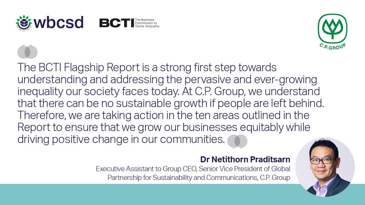 เจนีวา, 3 พฤษภาคม 2566: สภาธุรกิจโลกเพื่อการพัฒนาอย่างยั่งยืน (World Business Council on Sustainable Development – WBCSD) เผยแพร่รายงาน Tackling inequality: An agenda for business action ซึ่งเป็นรายงาน ของโครงการ The Business Commission to Tackle Inequality (BCTI) เพื่อจัดการปัญหาความไม่เท่าเทียม ลดความเหลื่อมล้ำและกระตุ้นให้ภาคเอกชนมีส่วนร่วม ทั้งนี้ บริษัท เครือเจริญโภคภัณฑ์ จำกัด เป็นภาคธุรกิจไทยเพียงบริษัทเดียวที่ได้รับเชิญให้ร่วมเป็นสมาชิกคณะกรรมาธิการระดับโลกนี้