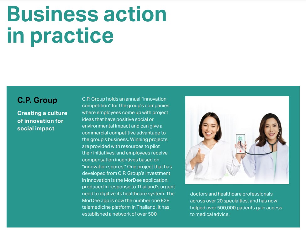 The case study discusses Charoen Pokphand Group’s annual “innovation competition” for the group’s companies where employees come up with project ideas that have positive social or environmental impact and can give a commercial competitive advantage to the group’s business. Winning projects are provided with resources to pilot their initiatives, and employees receive compensation incentives based on “innovation scores.” One project that has developed from C.P. Group’s investment in innovation is the MorDee application, produced in response to Thailand’s urgent need to digitize its healthcare system. The MorDee app is now the number one E2E telemedicine platform in Thailand. It has established a network of over 500 doctors and healthcare professionals across over 20 specialties, and has now helped over 500,000 patients gain access to medical advice.