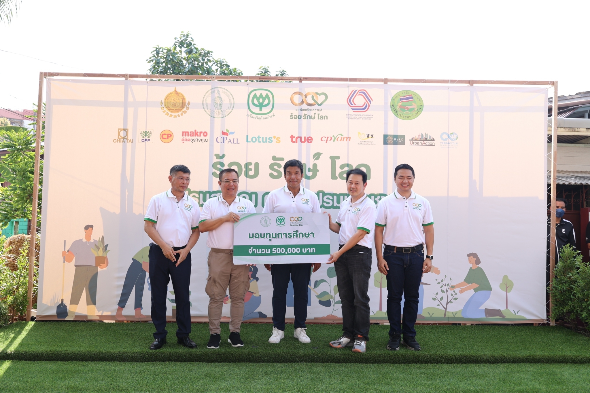 พร้อมกันนี้ คุณณรงค์ เจียรวนนท์ รองประธานอาวุโส เครือเจริญโภคภัณฑ์ พร้อมด้วย ผู้ว่าราชการกรุงเทพมหานคร และคณะผู้บริหารฯ ได้ร่วมมอบโรงเรือนเพาะกล้าไม้ เมล็ดพันธุ์ผักของเจียไต๋ให้กับผู้นำชุมชนประชาร่วมใจ 1 และ 2 เพื่อนำมาเพาะกล้าพันธุ์ไม้สร้างอาชีพ สร้างรายได้ให้กับคนในชุมชน จำนวน 1,700 ต้น ซึ่งเป็นทั้งไม้ประดับ ไม้ยืนต้น และเมล็ดพืชผักสวนครัวจากบริษัท เจียไต๋ จำกัด ให้กับกรุงเทพมหานครและเขต เพื่อสนับสนุนนโยบายเพิ่มพื้นที่สีเขียวให้กับเมืองมากขึ้น นอกจากนี้ เครือซีพี ยังเล็งเห็นความสำคัญด้านการศึกษาของเด็กไทย ได้มอบทุนการศึกษา มูลค่า 500,000 บาท จำนวน 100 ทุน ให้กับโรงเรียนในเขตกรุงเทพฯ เพื่อสร้างโอกาสทางการศึกษาสำหรับเด็กที่ขาดโอกาสในชุมชนเมืองให้เติบโตเป็นบุคคลากรที่สำคัญของชาติต่อไป พร้อมกันนี้ ยังมอบจักรยาน จำนวน 100 คัน เพื่อนำไปพัฒนาการท่องเที่ยวชุมชน ให้เกิดรายได้และเป็นอีกหนึ่งจุดท่องเที่ยวในกรุงเทพฯ อีกทั้ง เครือซีพีมีความห่วงใยในด้านสุขอนามัย จึงได้มอบหน้ากากอนามัย CP จำนวน 60,000 ชิ้น ให้กับชุมชน