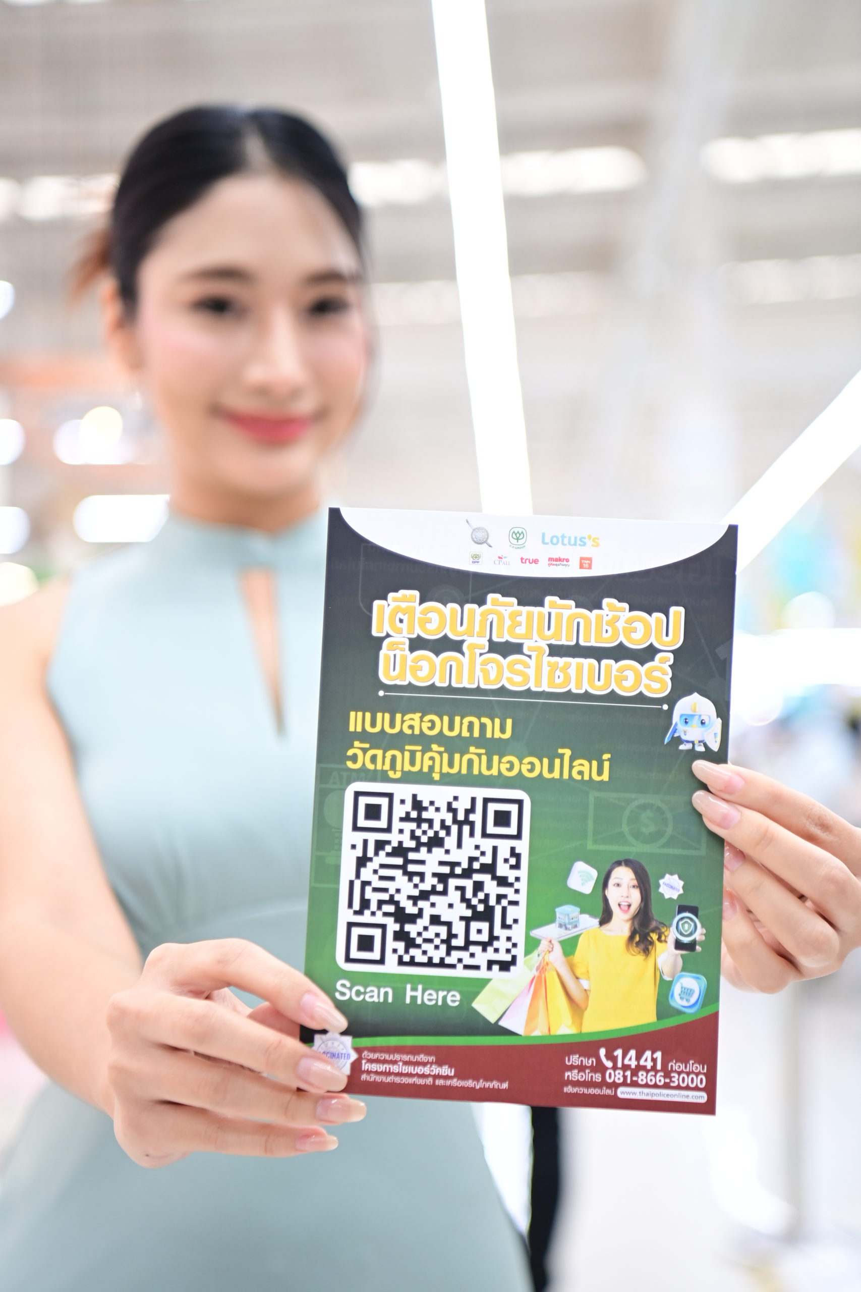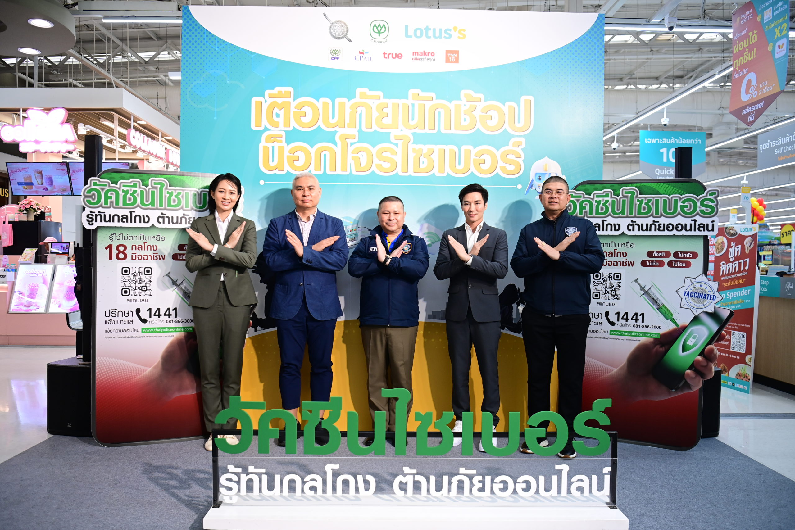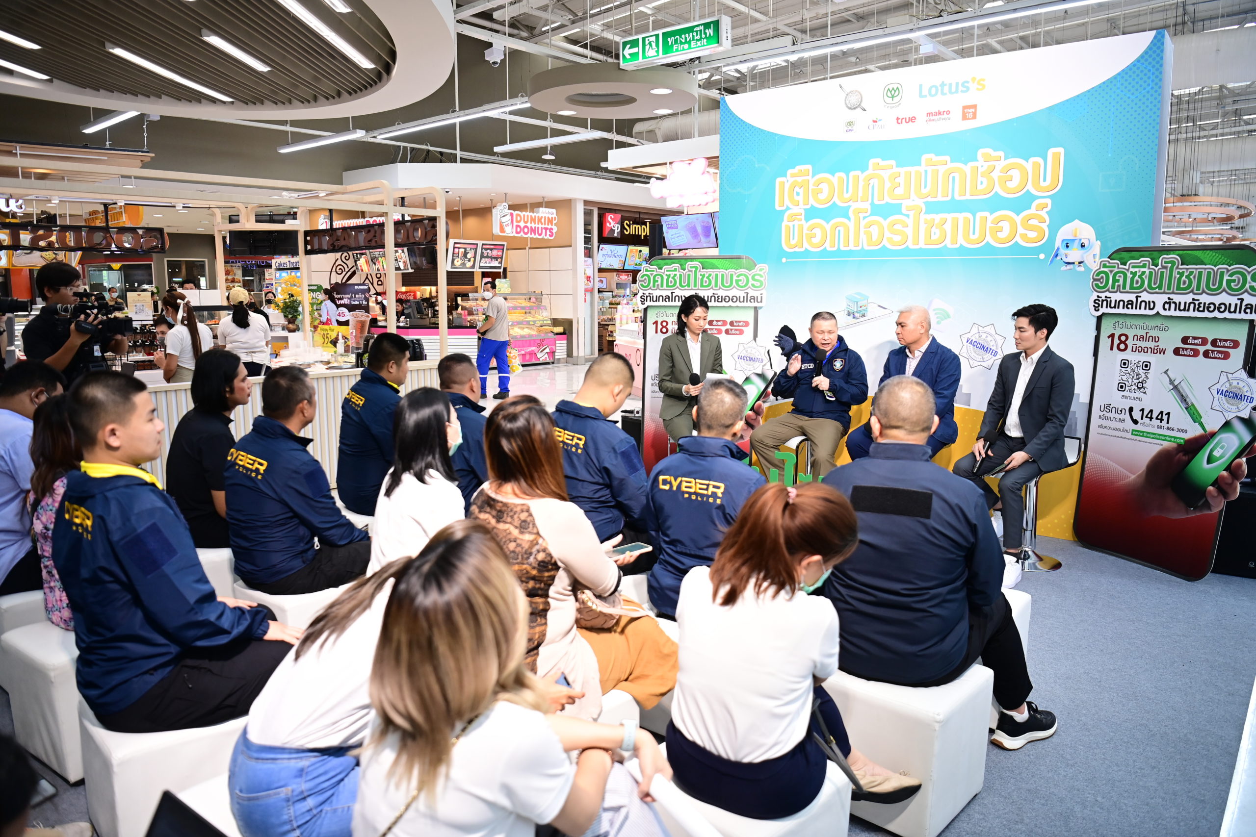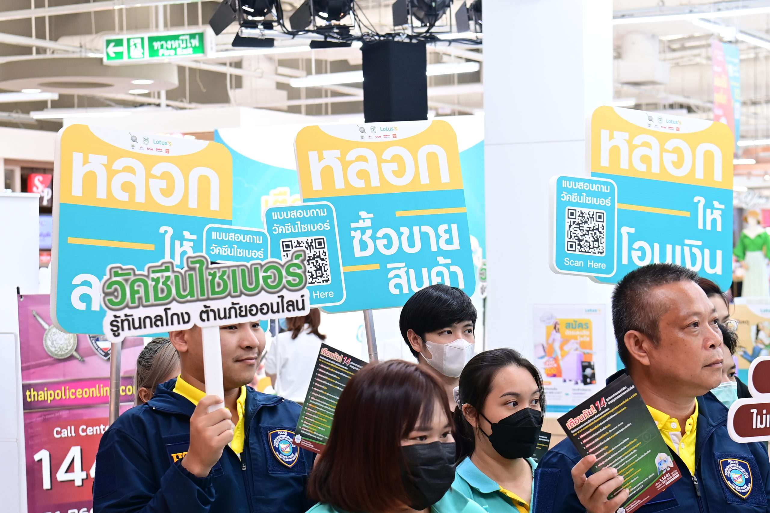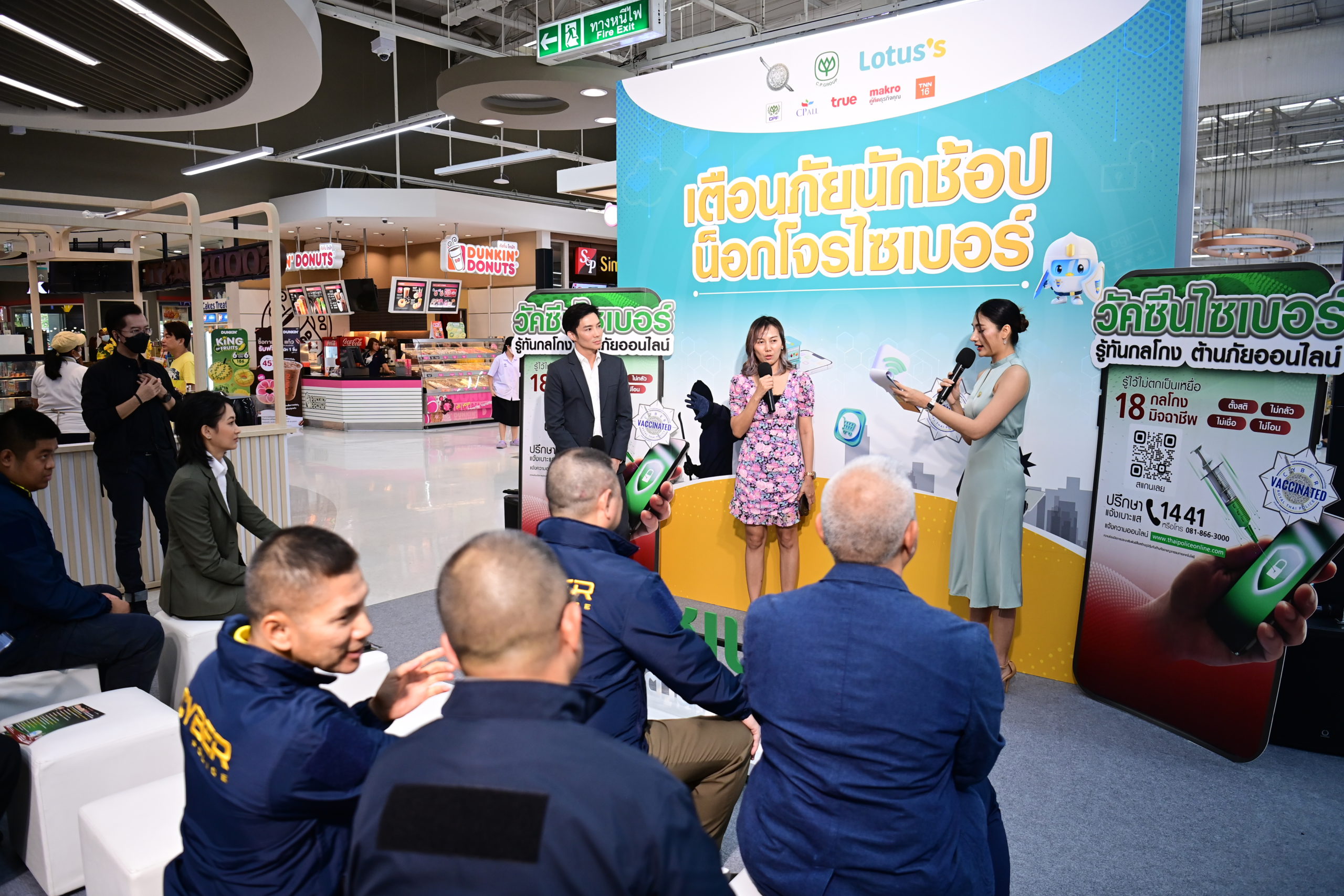 ทั้งนี้ เครือซีพี ได้ตระหนักถึงปัญหาการหลอกลวงทางไซเบอร์ ซึ่งจากข้อมูลของเจ้าหน้าที่พบว่า กลโกงออนไลน์ที่เป็นคดีมากที่สุดคือ คดีประเภทหลอกลวงซื้อขายสินค้า ดังนั้นด้วยความห่วงใยที่มีต่อลูกค้าและประชาชน ที่ผ่านมาทางโลตัสได้ร่วมเผยแพร่สื่อประชาสัมพันธ์โครงการไซเบอร์วัคซีนภายในพื้นที่ของศูนย์การค้าทั่วประเทศ และได้มีการสื่อสารภายในสำหรับพนักงาน โดยการณรงค์ให้ความรู้ภายในองค์กรเพื่อสร้างการตระหนักรู้ ซึ่งการจัดกิจกรรม “เตือนภัยนักช้อป น็อกโจรไซเบอร์” ที่ โลตัส สาขารามอินทรา ในวันนี้ นับเป็นการการต่อยอดโครงการฯ เพื่อร่วมเป็นส่วนสำคัญในการช่วยกระจายข่าวสาร ให้ข้อมูลเสริมภูมิคุ้มกันให้กับประชาชนในการป้องกันไม่ให้หลงเชื่อหรือตกเป็นเหยื่อกลโกงของมิจฉาชีพที่มาในรูปภัยออนไลน์ ช่วยลดความสูญเสียที่อาจเกิดขึ้นในอนาคต