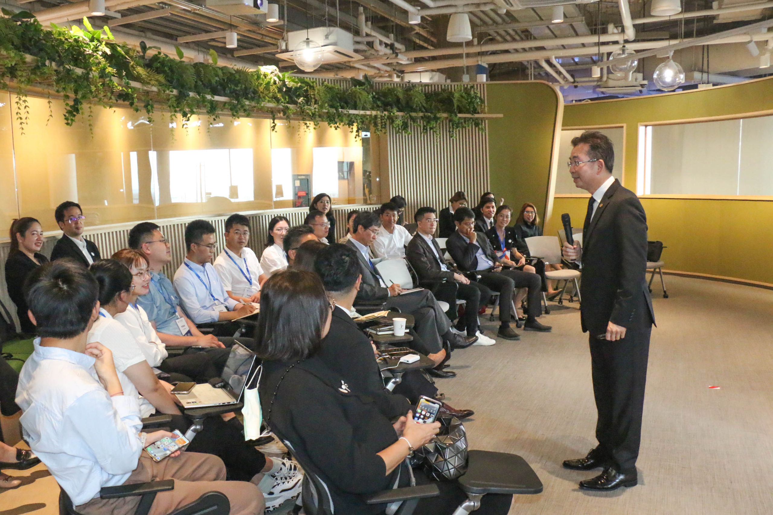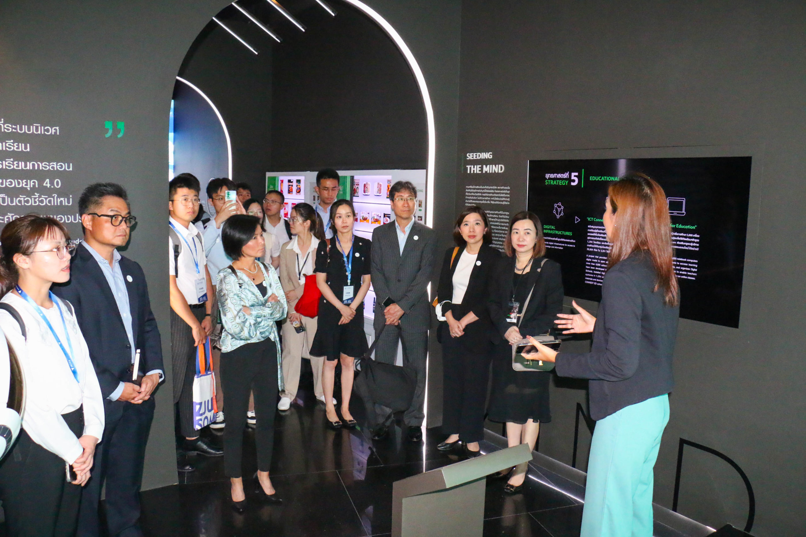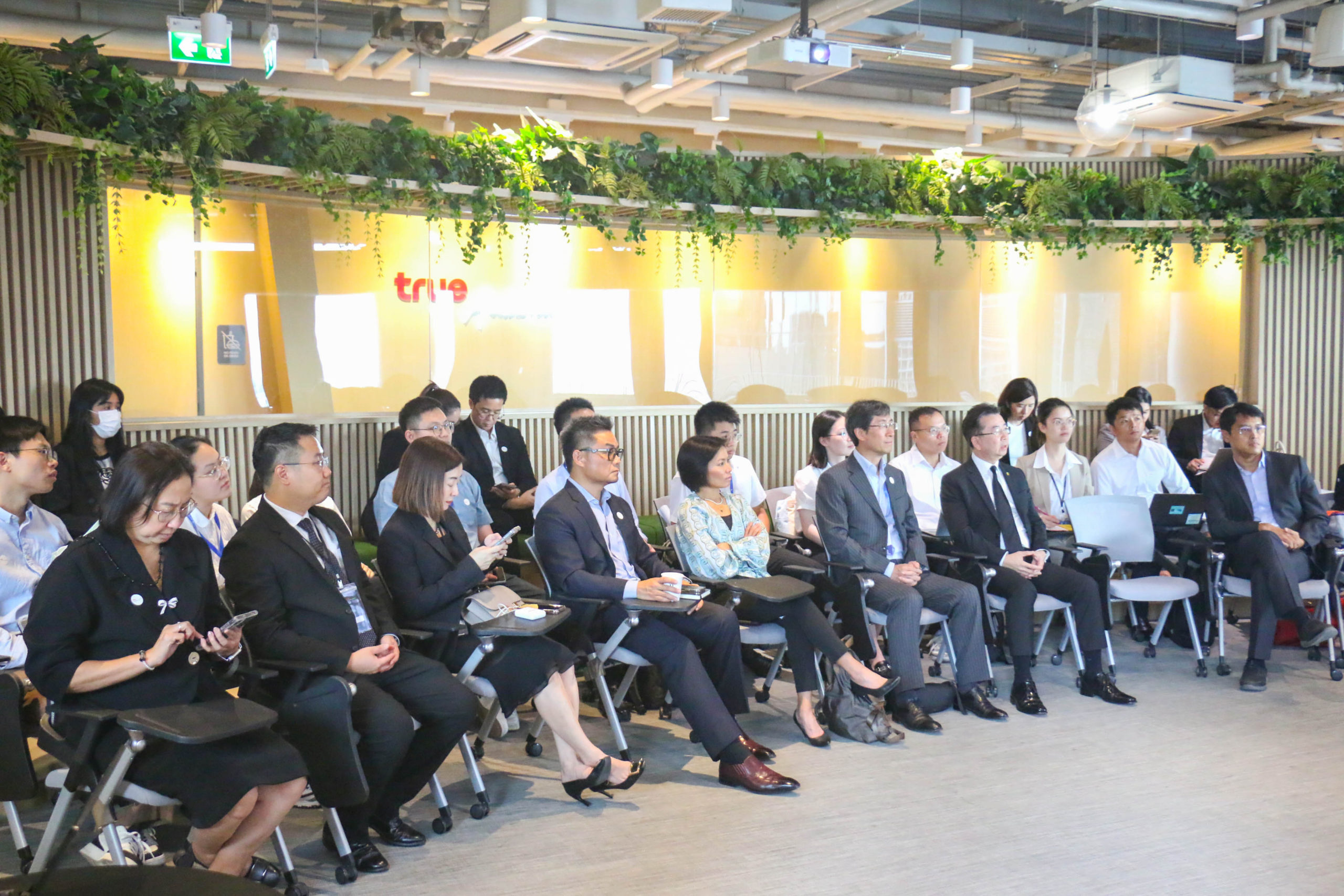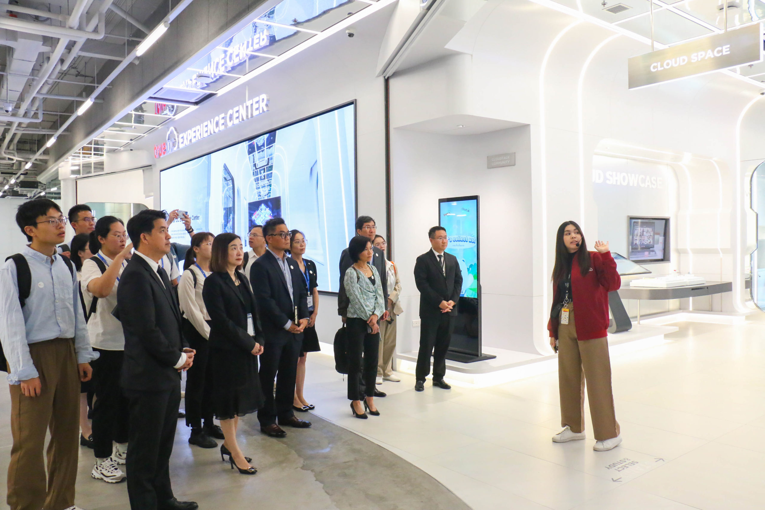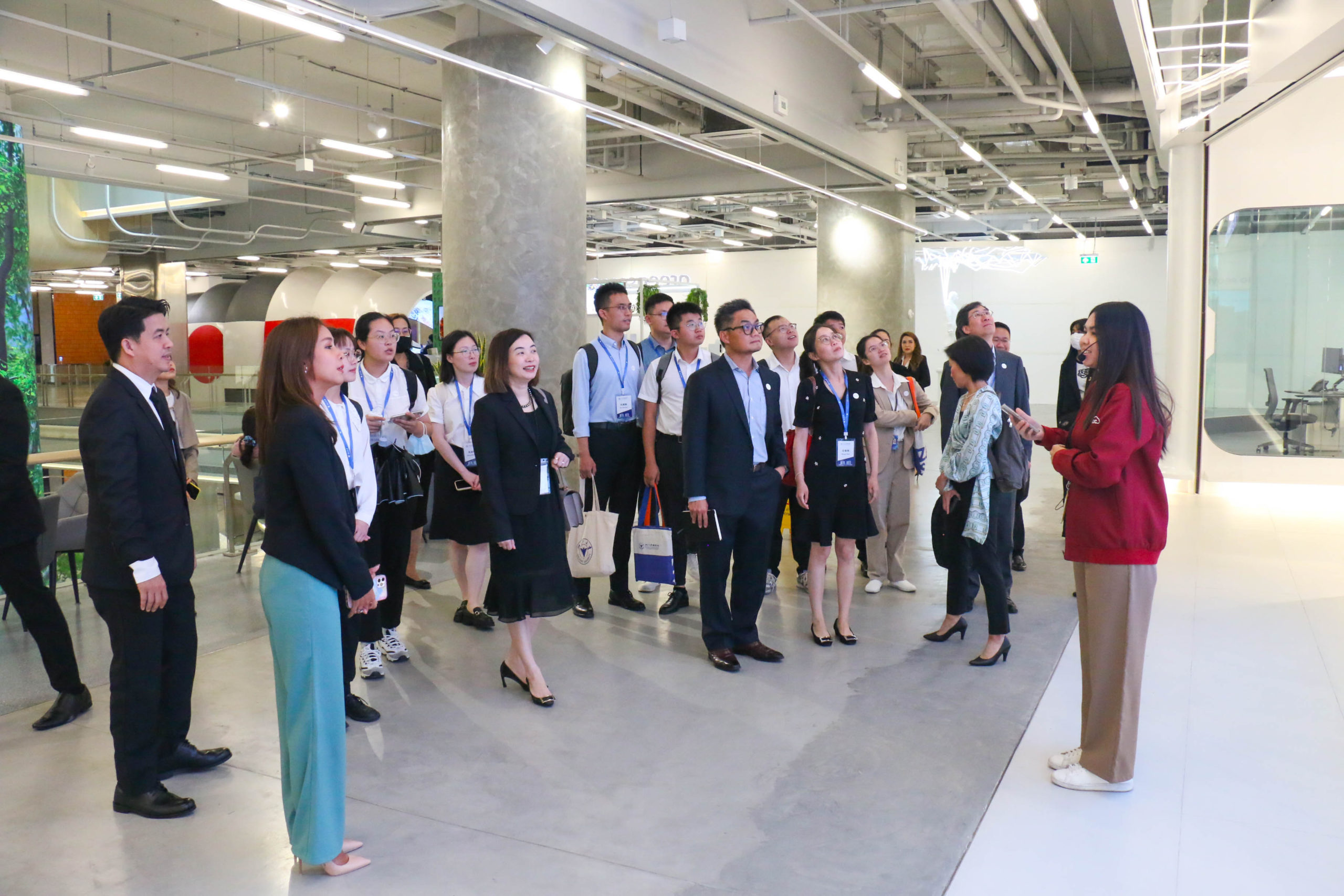 ก่อนเริ่มแลกเปลี่ยนเรียนรู้ คุณพิมลรัตน์ รีพัฒนาวิจิตรกุล และ ดร.ธีระพล ถนอมศักดิ์ยุทธ ได้นำคณะนักศึกษามหาวิทยาลัยเจ้อเจียง เยี่ยมชม ศูนย์แสดงนวัตกรรมเพื่อความยั่งยืน เครือเจริญโภคภัณฑ์ หรือ CP Innovation for Sustainability Center นำเสนอนวัตกรรมและเทคโนโลยีในการทำธุรกิจของเครือฯ ภายใต้แนวคิด Seeding for a Better Tomorrow – ปลูกความคิด ปลุกจินตนาการ เปลี่ยนแปลงสู่อนาคตที่ยั่งยืน เพื่อขับเคลื่อนองค์กรสู่ความยั่งยืน ได้เห็นทิศทางในอนาคต ทำให้เข้าใจได้ว่า ทำไมเครือซีพีจึงเป็นองค์กรธุรกิจชั้นนำของไทย ที่ประสบความสำเร็จและได้รับการยอมรับมากที่สุดแห่งหนึ่ง และ เยี่ยมชม ทรู ดิจิทัล พาร์ค บนพื้นที่กว่า 230,000 ตารางเมตร แบ่งเป็น ทรู ดิจิทัล พาร์ค ฝั่งอีสต์ เปิดให้บริการเมื่อปี 2562 เป็นระบบนิเวศสำหรับสตาร์ทอัพในประเทศไทย และทรู ดิจิทัล พาร์ค ฝั่งเวสต์ เปิดบริการปี 2565 ภายใต้แนวคิด “Tomorrow Life Campus” โดยแบ่งพื้นที่ให้บริการหลากหลาย ได้แก่ Co-working Space, Enterprise Space, Start up Innovation Space, Events and Business Services Space รวมถึงพื้นที่ส่วนของร้านค้า พื้นที่สำนักงานให้เช่าขนาดใหญ่ รวมทั้งบริการโซลูชันด้านไอโอที (IoT Solutions) และดิจิทัลแพลตฟอร์ม เพื่อรองรับการทำธุรกิจ อาทิ Cloud Computing และ ระบบ e-Payment เป็นต้น