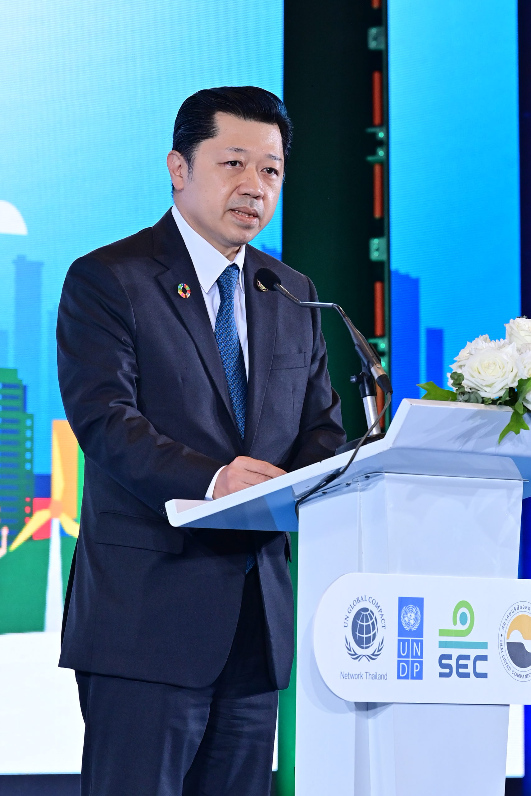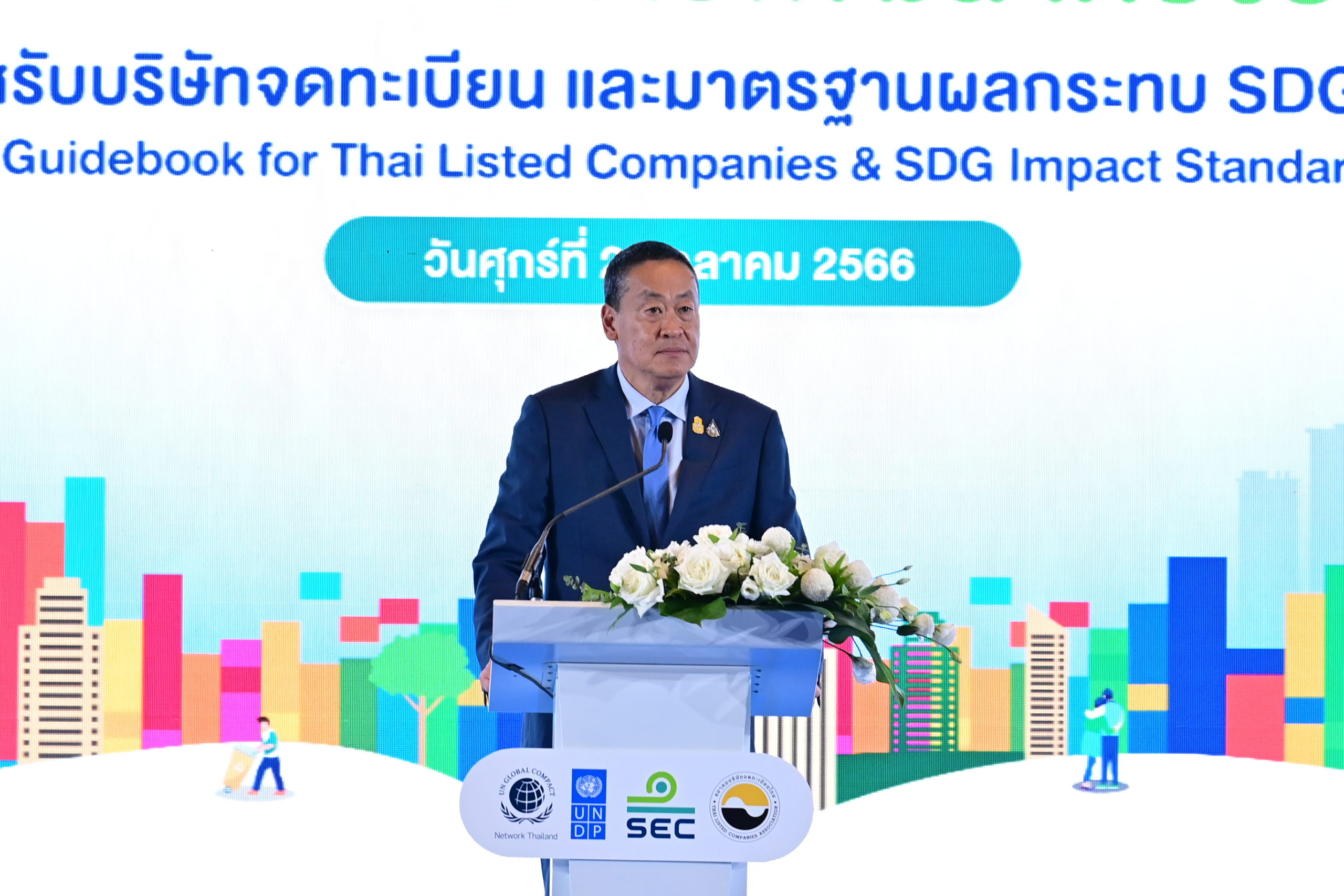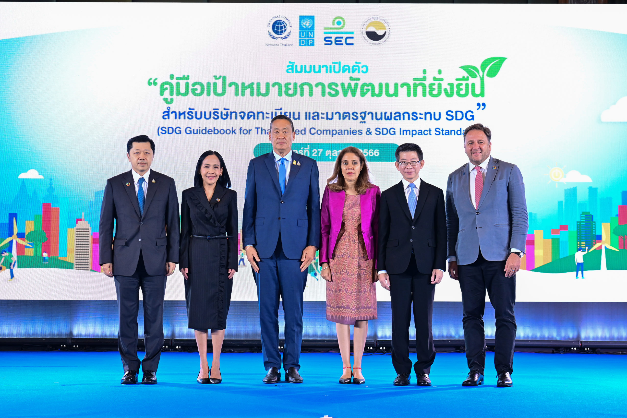 27 ตุลาคม 2566 – สำนักงานโครงการพัฒนาแห่งสหประชาชาติ (UNDP) ร่วมกับ สำนักงานคณะกรรมการกำกับหลักทรัพย์และตลาดหลักทรัพย์ (กลต.) สมาคมบริษัทจดทะเบียนไทย และสมาคมเครือข่ายโกลบอลคอมแพ็กแห่งประเทศไทย (GCNT: Global Compact Network Thailand) จัดงานเปิดตัว “คู่มือเป้าหมายการพัฒนาที่ยั่งยืนสำหรับบริษัทจดทะเบียน และมาตรฐานผลกระทบ SDG” โดยได้รับเกียรติจาก คุณเศรษฐา ทวีสิน นายกรัฐมนตรีและรัฐมนตรีว่าการกระทรวงการคลัง เป็นประธานในงานและกล่าวปาฐกถาพิเศษ พร้อมด้วย Ms. Gita Sabharwal ผู้ประสานงานสหประชาชาติประจำประเทศไทย Mr. Renaud Meyer ผู้แทนโครงการพัฒนาแห่งสหประชาชาติประจำประเทศไทย คุณพรอนงค์ บุษราตระกูล เลขาธิการสำนักงานคณะกรรมการกำกับหลักทรัพย์และตลาดหลักทรัพย์ ดร.กอบศักดิ์ ภูตระกูล อุปนายกสมาคมบริษัทจดทะเบียนไทย พร้อมด้วย คุณศุภชัย เจียรวนนท์ ประธานคณะผู้บริหาร เครือเจริญโภคภัณฑ์ ในฐานะนายกสมาคมเครือข่ายโกลบอลคอมแพ็กแห่งประเทศไทย โดยมีผู้นำจากภาครัฐ ประชาสังคม และภาคเอกชนชั้นนำจากหลากหลายองค์กรเข้าร่วมงานอย่างคับคั่ง ณ ห้องแกรนด์บอลรูม 1-2 โรงแรมแกรนด์ ไฮแอท เอราวัณ ถนนราชดำริ เขตปทุมวัน กรุงเทพฯ