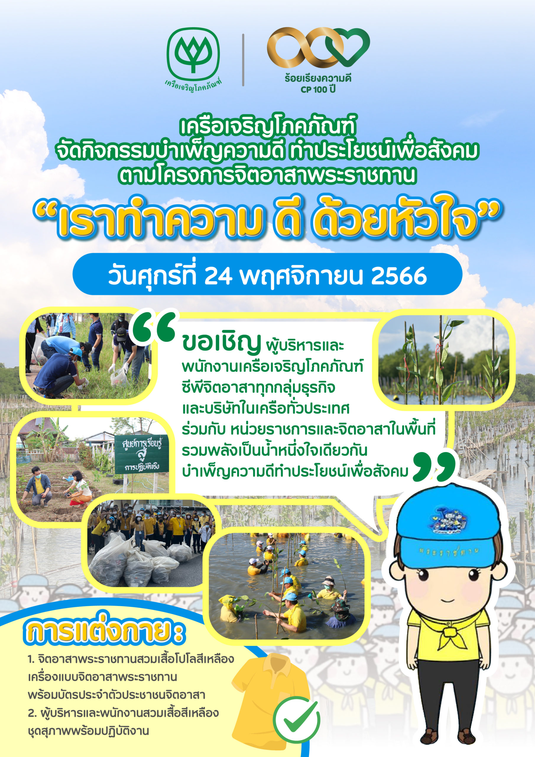เครือเจริญโภคภัณฑ์ ขอเชิญชวนชาวซีพีจิตอาสาทุกกลุ่มธุรกิจและบริษัทในเครือฯ ทั่วประเทศ ร่วมกับจิตอาสาในพื้นที่ หน่วยงานภาครัฐ รวมพลังเป็นหนึ่งเดียว บำเพ็ญประโยชน์เพื่อสังคม ดำเนินตามพระบรมราโชบายของพระบาทสมเด็จพระปรเมนทรรามาธิบดีศรีสินทรมหาวชิราลงกรณ พระวชิรเกล้าเจ้าอยู่หัว และน้อมรำลึกในพระมหากรุณาธิคุณพระบาทสมเด็จพระบรมชนกาธิเบศร มหาภูมิพลอดุลยเดชมหาราช บรมนาถบพิตร เนื่องในวันคล้ายวันพระราชสมภพ 5 ธันวาคม