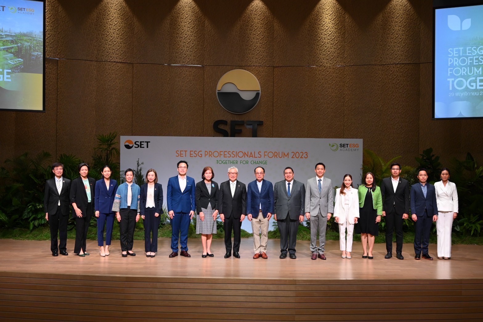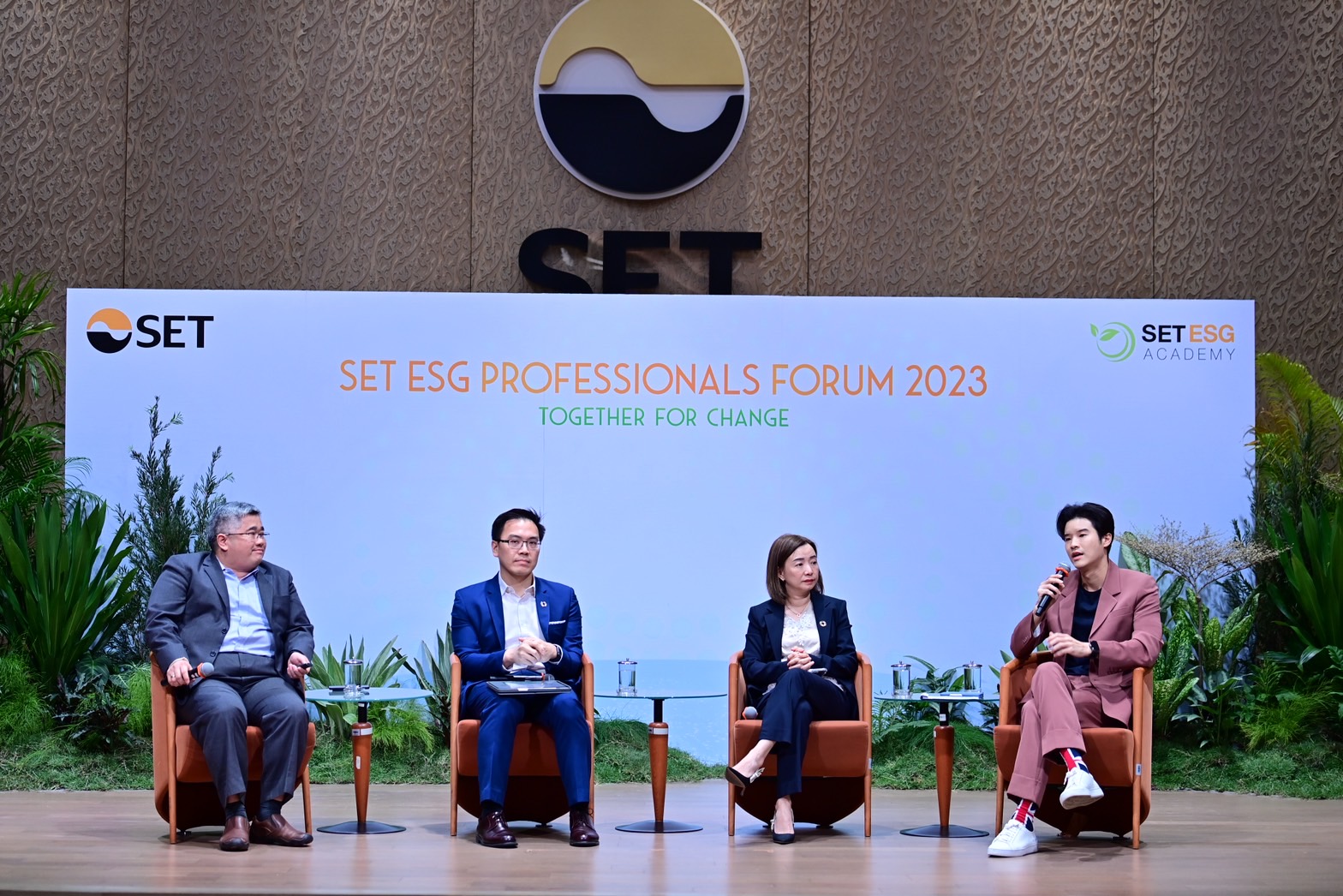 เมื่อวันที่ 29 พฤศจิกายน 2566 – ตลาดหลักทรัพย์ฯ ร่วมกับเครือข่ายผู้เชี่ยวชาญด้านความยั่งยืน SET ESG Experts Pool จัดงาน SET ESG Professionals Forum 2023 ภายใต้แนวคิด Together for Change เพื่อรวมพลังสร้างการเปลี่ยนแปลง โดยมี คุณพิมลรัตน์ รีพัฒนาวิจิตรกุล ประธานผู้บริหารทรัพยากรบุคคล เครือเจริญโภคภัณฑ์ และ บมจ.เจริญโภคภัณฑ์อาหาร ร่วมเสวนาในหัวข้อ “Sustainability Champions : C-Suite Insights on Driving Sustainable Change” พร้อมกับ คุณณัฐพรรษ ตันบุญเอก ประธานเจ้าหน้าที่ฝ่ายการเงิน บมจ.ดับบลิวเอชเอ คอร์ปอเรชั่น และ ดร.กรินทร์ บุญเลิศวณิชย์ รองกรรมการผู้จัดการ สายงาน Corporate Strategy and Innovation Division ธนาคารกสิกรไทย จำกัด (มหาชน) ทั้งนี้ งานดังกล่าวถือเป็นเวทีที่ระดมความร่วมมือของผู้ที่ทำงานด้าน ESG Professionals ที่ใหญ่ที่สุดในไทย