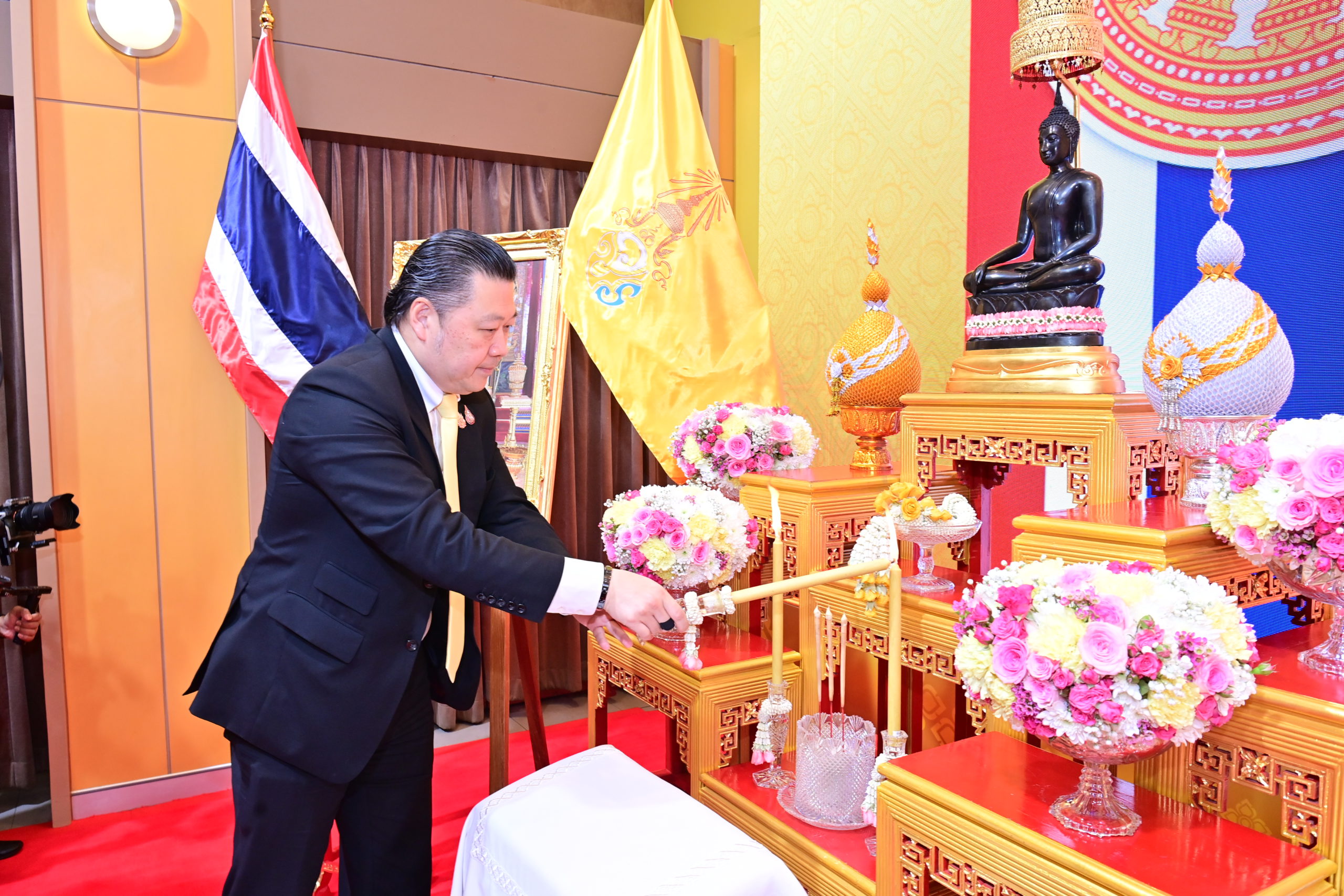 ในช่วงเช้าเริ่มต้นด้วยพิธีไหว้ศาลพระชัยมงคล และพิธีทำบุญตักบาตรพระสงฆ์ 104 รูป ณ โถงชั้น 1 อาคารซี.พี. ทาวเวอร์ ก่อนเข้าสู่พิธีเจริญพระพุทธมนต์และถวายปัจจัยไทยธรรม โดยมีท่านเจ้าประคุณสมเด็จพระมหาธีราจารย์ เจ้าอาวาสวัดพระเชตุพนวิมลมังคลาราม เป็นประธานสงฆ์ พร้อมด้วยพระราชาคณะจากวัดสำคัญต่าง ๆ ณ ห้องประชุม ชั้น 11