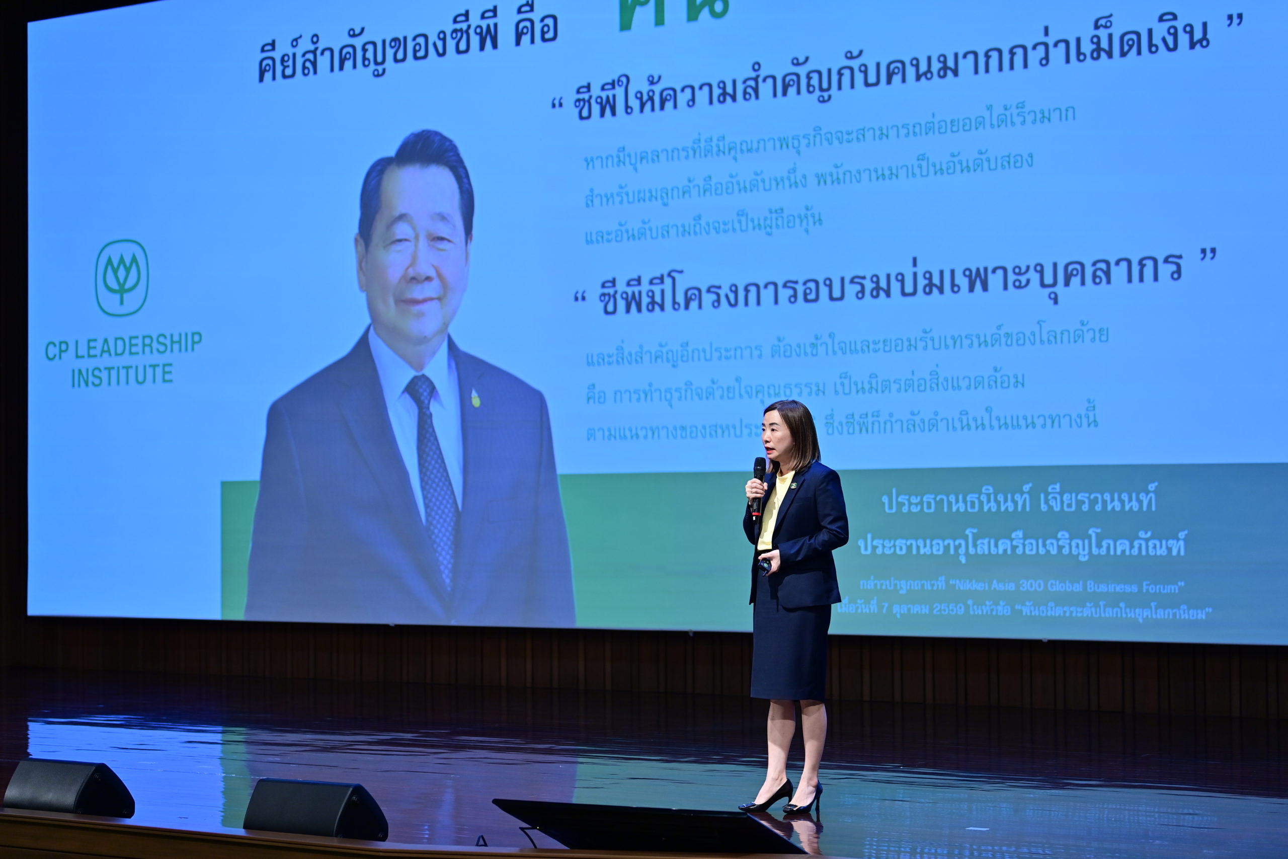 พร้อมกันนี้ท่านประธานอาวุโสได้กล่าวถึงสถาบันผู้นำว่าท่านเรียนรู้มาจากสหรัฐอเมริกา ซึ่งไม่ใช่แค่สถาบันผู้นำ เครือฯเริ่มต้นที่เกษตรก็เพราะได้ความรู้จากอเมริกาเช่นกัน โดยร่วมทุนกับร็อกกี้เฟลเลอร์เลี้ยงไก่ เครือฯยังเชื่อมั่นในการพัฒนาเทคโนโลยีและคิดว่าเทคโนโลยีที่ดีที่สุดในโลกยังเป็นอเมริกา อย่างไรก็ตามเครือฯก็ยังเรียนรู้เทคโนโลยีจากประเทศอื่น ๆ ด้วย