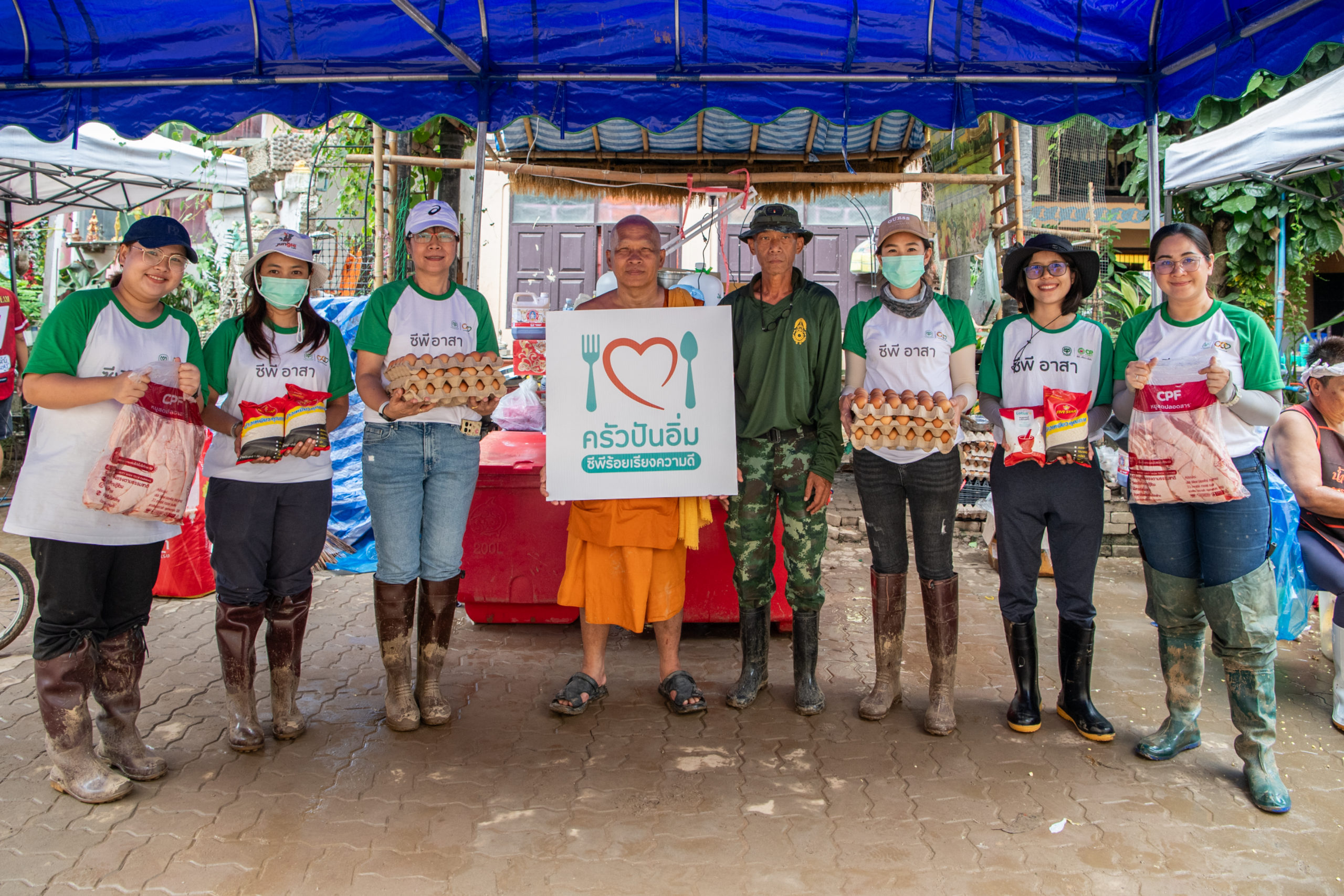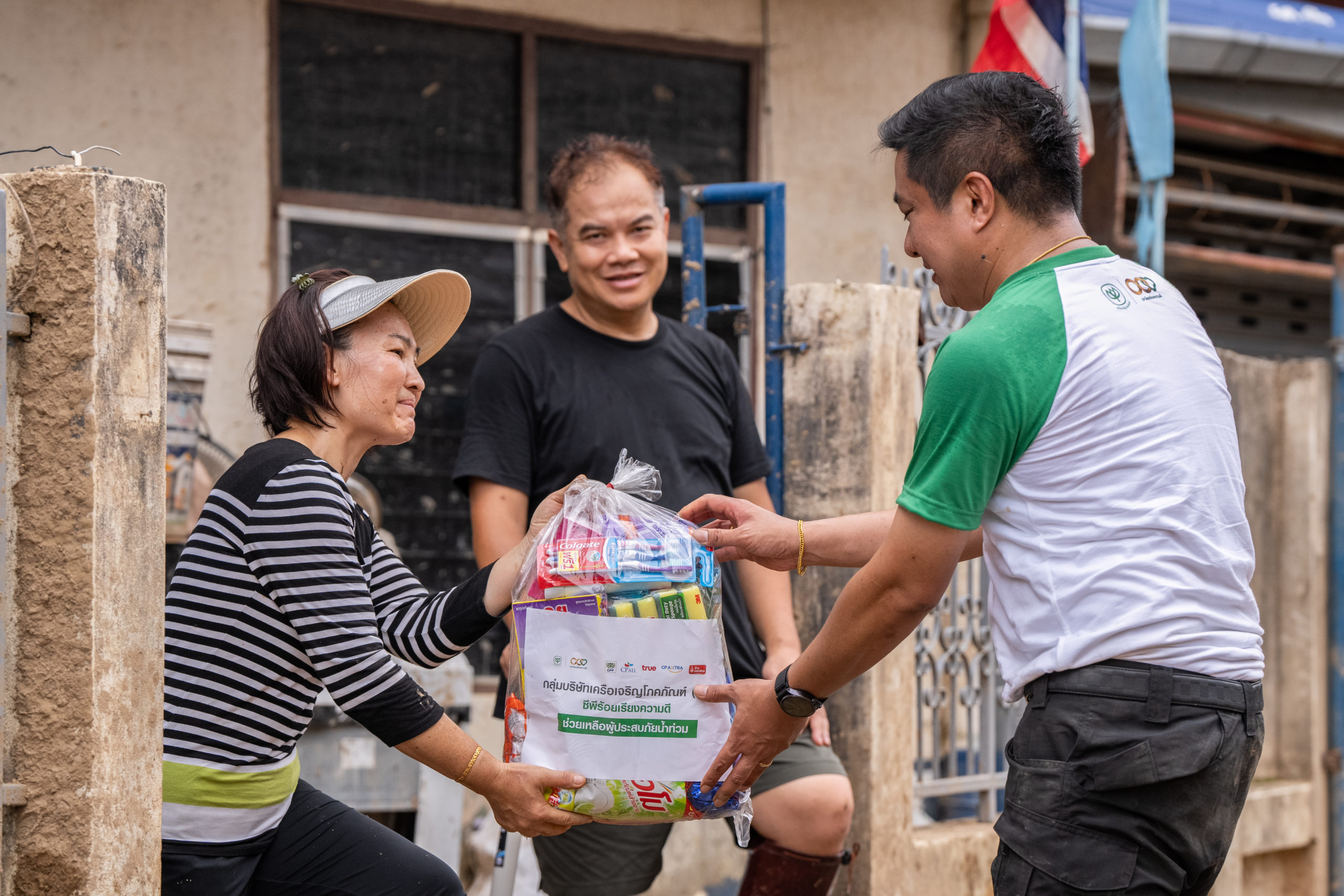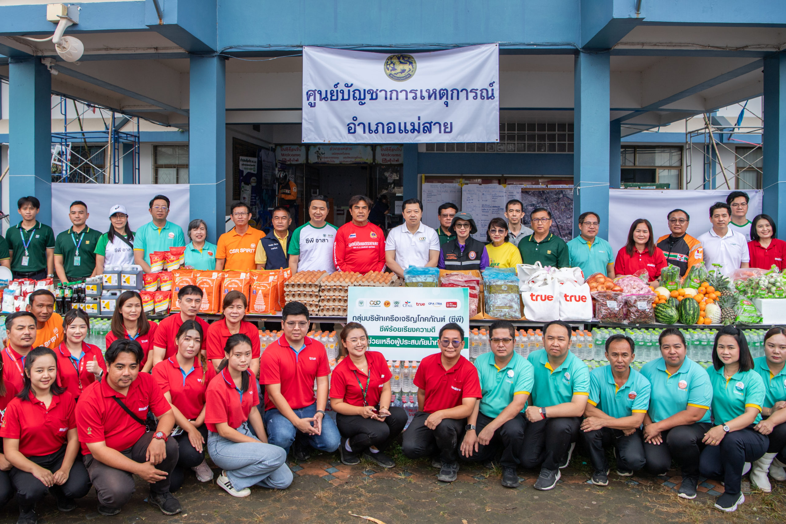 ในการนี้ คุณศุภชัยและทีมงานซีพีอาสา ได้เริ่มต้นภารกิจโดยมอบสิ่งของบรรเทาทุกข์ที่จำเป็นให้กับโรงครัวกิ่งกาชาด โรงครัวมูลนิธิอาสาเพื่อนพึ่ง (ภาฯ) ยามยาก และโรงครัวมูลนิธิเพชรเกษม เพื่อใช้ในการประกอบอาหารเลี้ยงผู้ประสบภัยและจิตอาสา โดยสิ่งของที่มอบในครั้งนี้ได้รับการสนับสนุนจากบริษัทในเครือซีพี ได้แก่ CPF มอบวัตถุดิบของสด CP Axtra มอบเครื่องปรุงและผัก CP ALL มอบน้ำดื่ม และ CPI มอบข้าวตราฉัตร นอกจากนี้ เครือซีพียังได้ส่งรถโมบายทรูเข้าให้บริการสัญญาณโทรศัพท์และอินเทอร์เน็ตในพื้นที่ที่ประสบปัญหาด้านการสื่อสาร ช่วยให้ชาวบ้านสามารถติดต่อสื่อสารกับภายนอกได้อย่างสะดวกและมีประสิทธิภาพ ทั้งยังมอบผ้าห่ม หมอน และมุ้ง ให้กับผู้ประสบภัย ณ ศูนย์พักพิงชั่วคราวที่วัดพรหมวิหาร ซึ่งมีผู้อยู่อาศัยกว่า 100 คน เพื่อให้การดำรงชีวิตในช่วงเวลานี้เป็นไปอย่างปลอดภัย