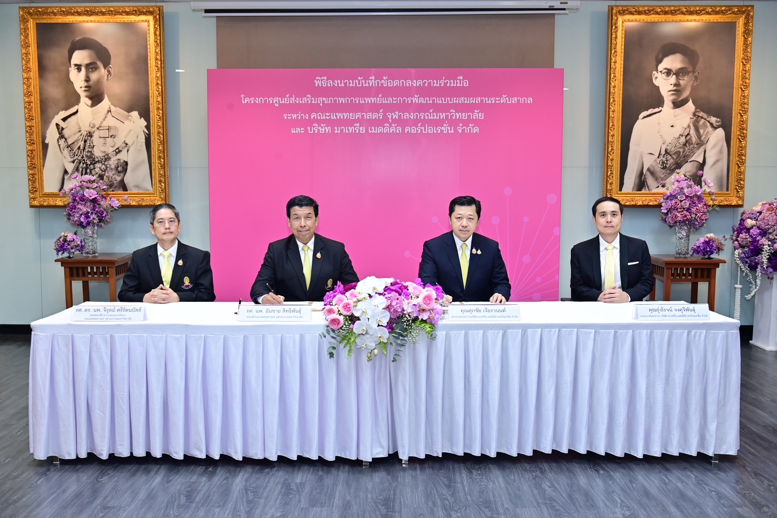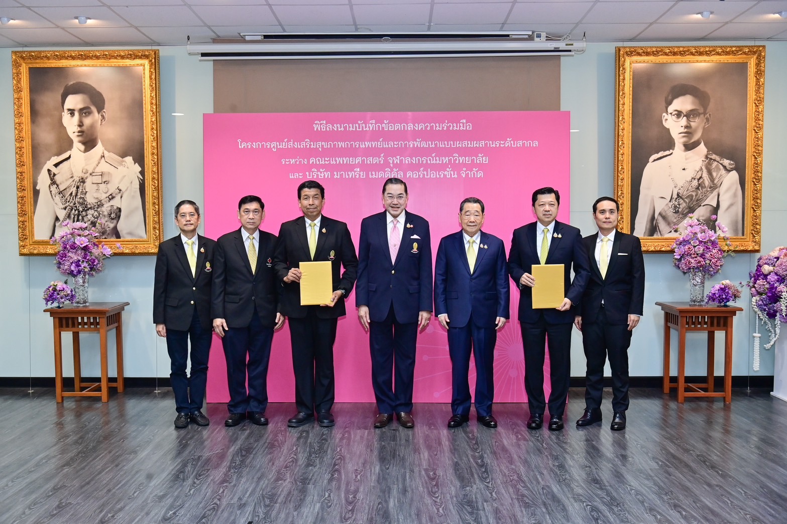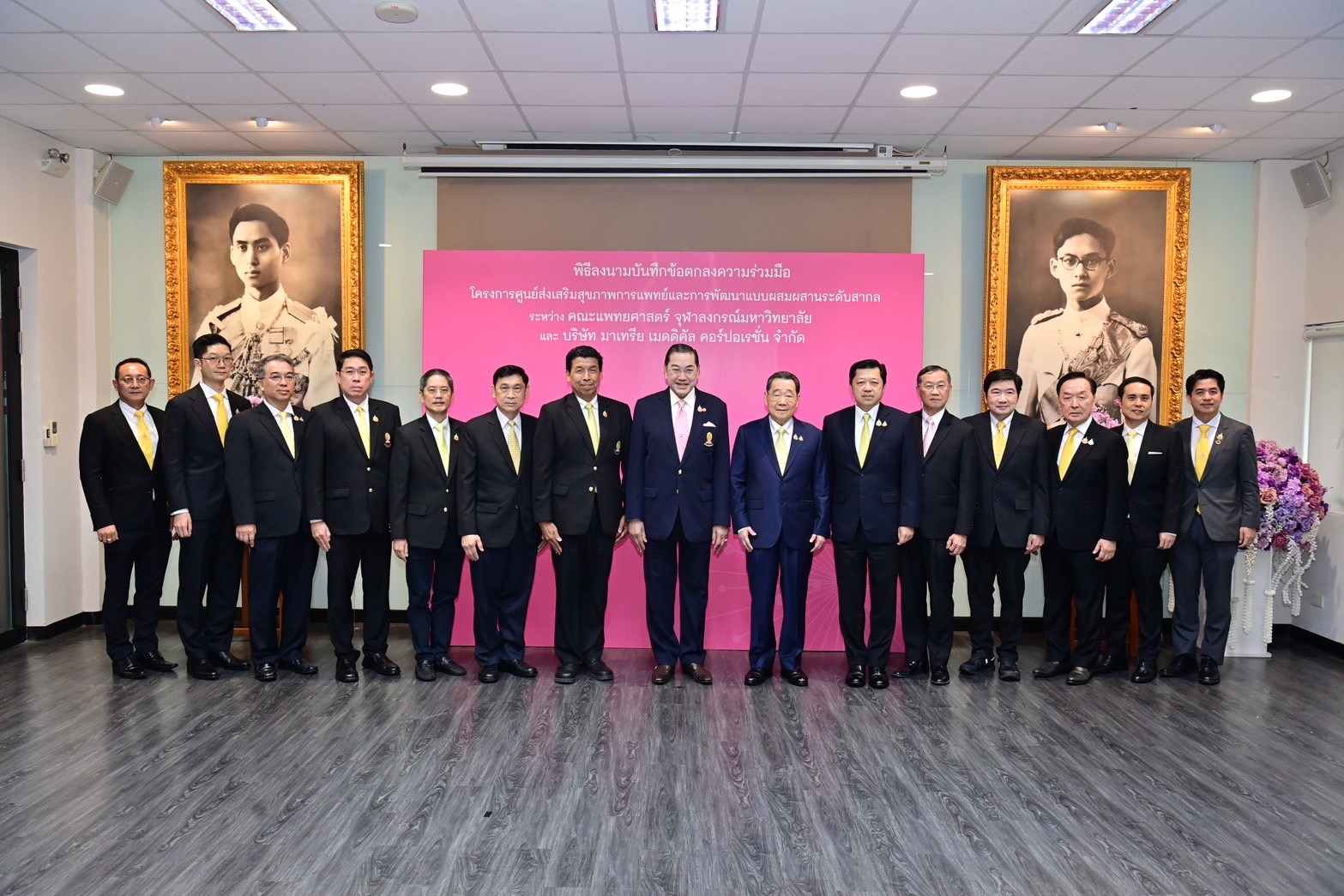 กรุงเทพฯ 24 กันยายน 2567 – คณะแพทยศาสตร์ จุฬาลงกรณ์มหาวิทยาลัย ลงนามบันทึกความร่วมมือกับ บริษัท มาเทรีย เมดดิคัล คอร์ปอเรชั่น จำกัด ในการพัฒนางานวิจัย บุคลากร และนวัตกรรมทางการแพทย์ ผ่านโครงการศูนย์ส่งเสริมสุขภาพและการแพทย์ครบวงจรระดับสากล โดยมี รองศาสตราจารย์นายแพทย์ ฉันชาย สิทธิพันธุ์ คณบดีคณะแพทยศาสตร์ และคุณศุภชัย เจียรวนนท์ ประธานกรรมการบริษัท เป็นผู้ลงนาม พร้อมทั้งได้รับเกียรติจาก ศาสตราจารย์พิเศษ ดร.สุรเกียรติ เสถียรไทย นายกสภาจุฬาลงกรณ์มหาวิทยาลัย ท่านประธานอาวุโสธนินท์ เจียรวนนท์ รศ.นพ.สมพงษ์ สุวรรณวลัยกร พร้อม รศ.ดร.นพ.จิรุตม์ ศรีรัตนบัลล์ และคุณรุ่งโรจน์ จงศุจิพันธุ์ เป็นสักขีพยานกิตติมศักดิ์ นอกจากนี้ยังมี ศ.นพ.วิชัย เบญจชลมาศ คณะกรรมการโครงการ บริษัท มาเทรีย เมดดิคัล คอร์ปอเรชั่น จำกัด รศ.นพ.ธีระพงศ์ เจริญวิทย์ คณะกรรมการโครงการฯ นพ.สุธร ชุตินิยม คณะกรรมการโครงการฯ คุณวรวิทย์ เจนธนากุล คณะกรรมการโครงการฯ ดร.ธีระพล ถนอมศักดิ์ยุทธ ประธานคณะผู้บริหารยุทธศาสตร์ข้อมูลและการสื่อสาร เครือฯ คุณเมธี วินิชบุตร คณะกรรมการโครงการฯ ร่วมเป็นเกียรติในงาน