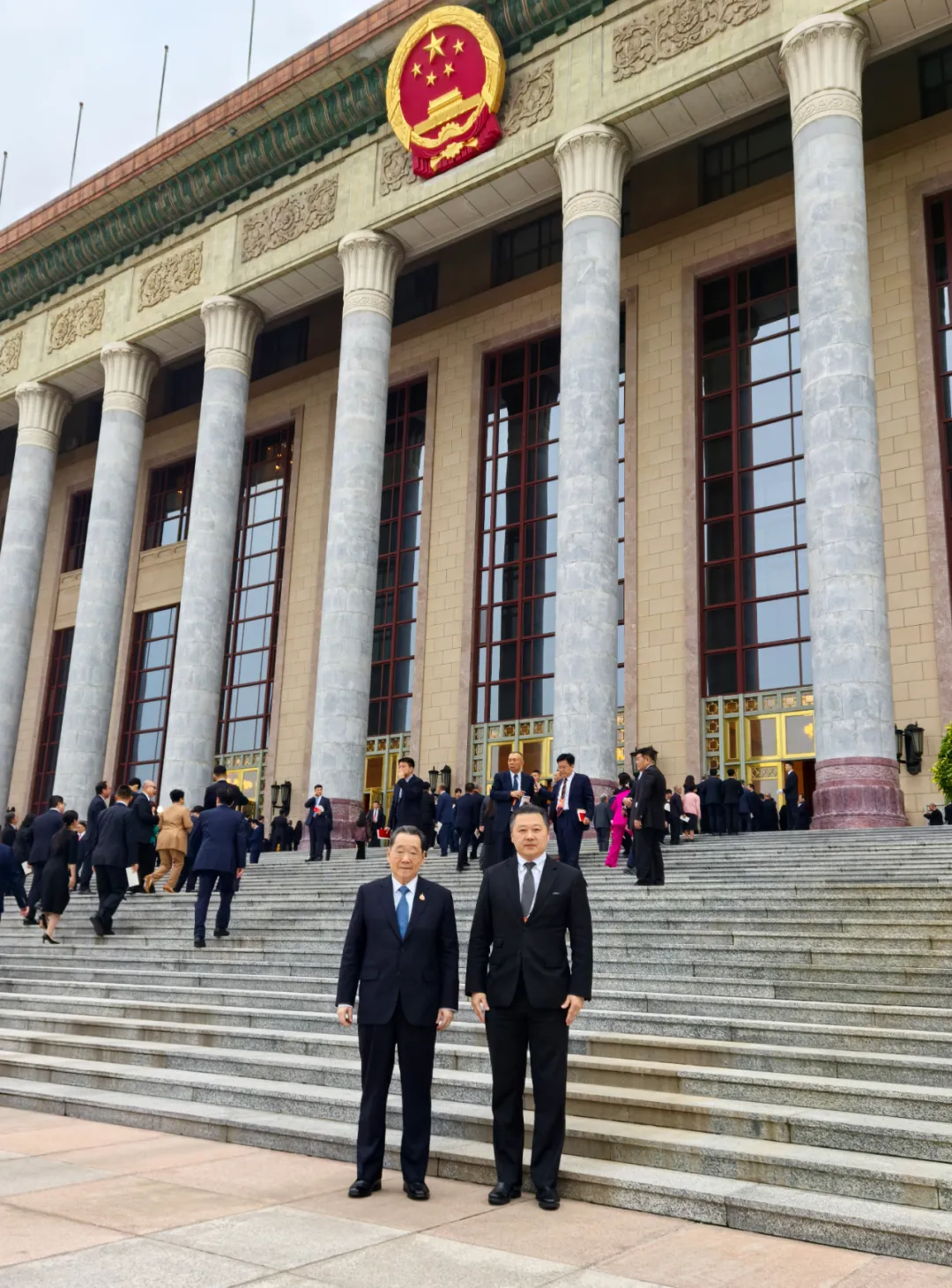 ▲ท่านประธานอาวุโสธนินท์ เจียรวนนท์ และ ท่านประธานกรรมการสุภกิต เจียรวนนท์ ถ่ายภาพเป็นที่ระลึกหน้าห้องโถงใหญ่แห่งประชาชน