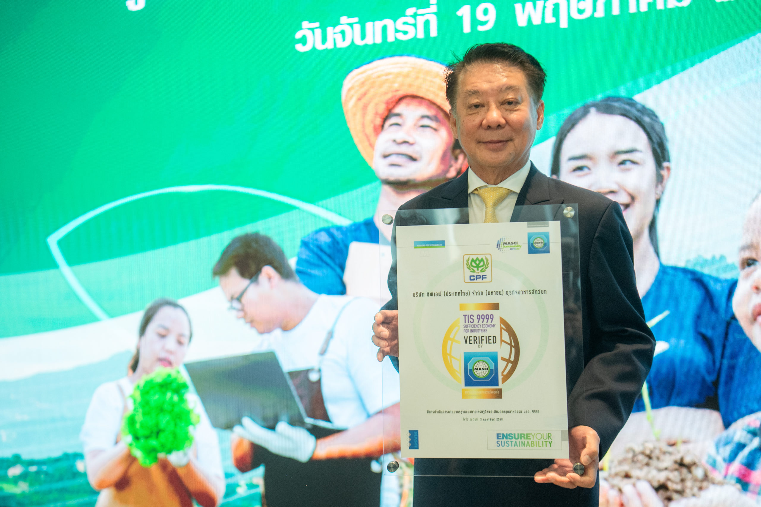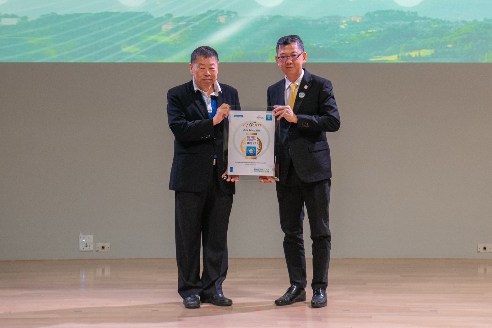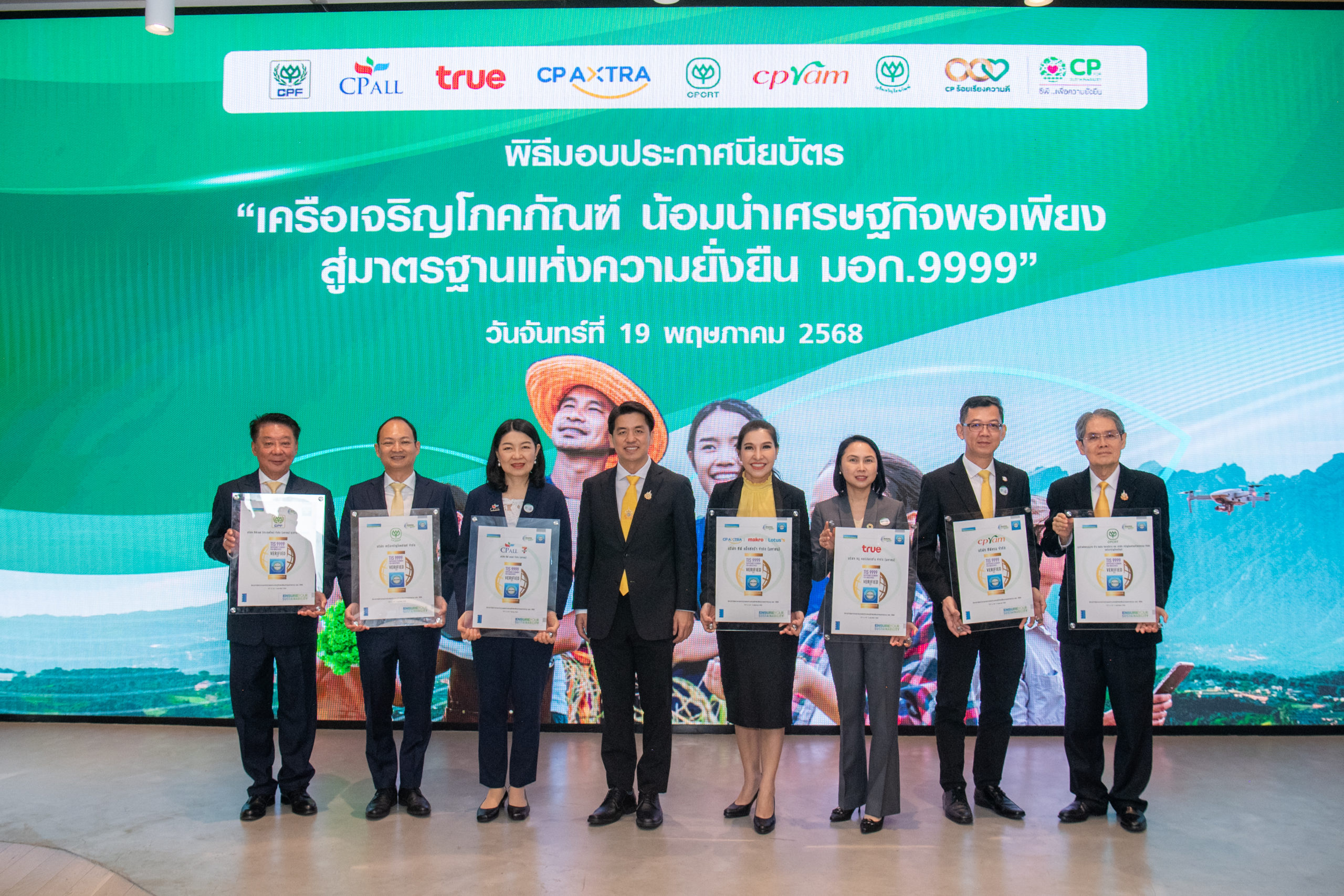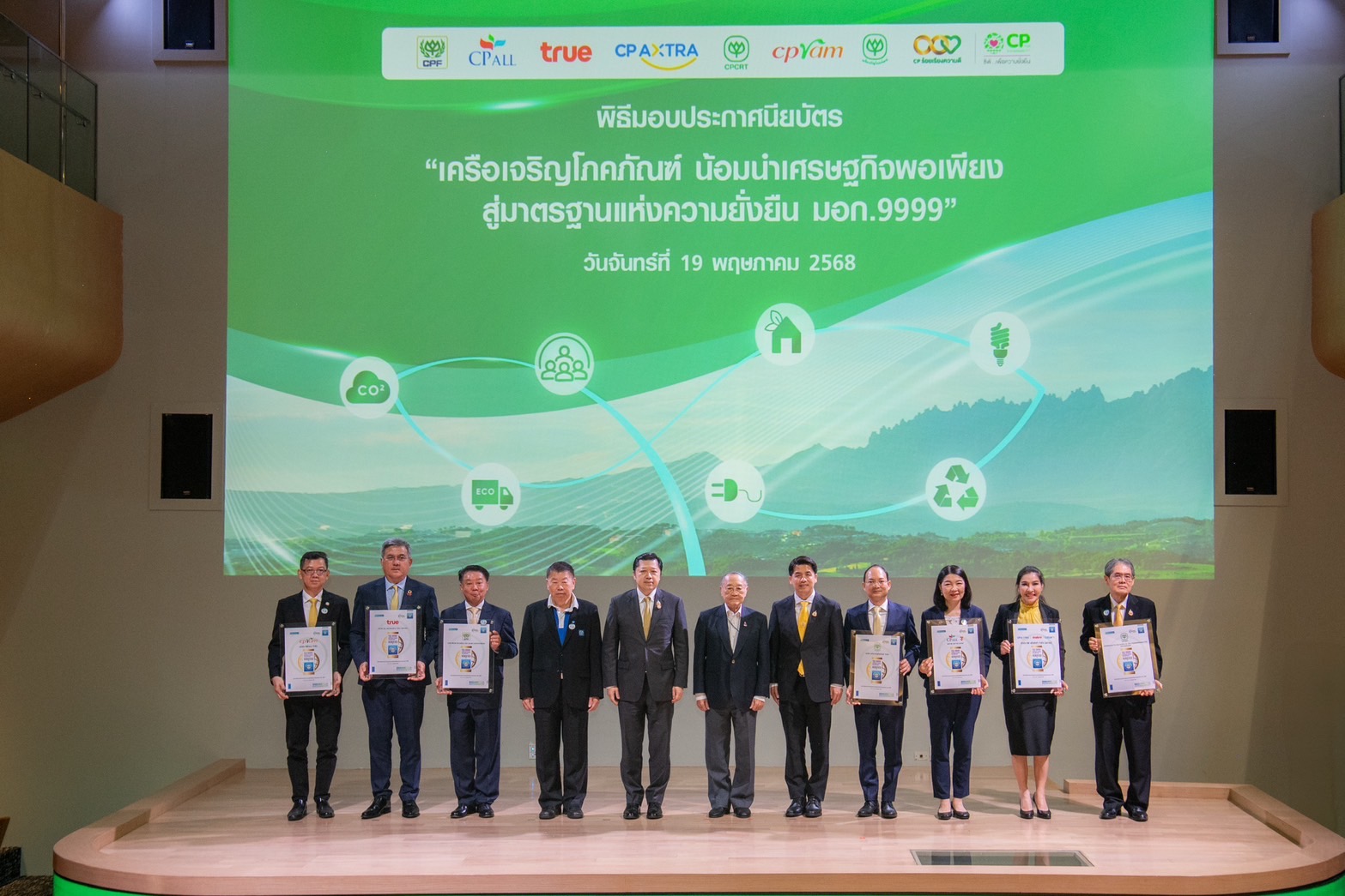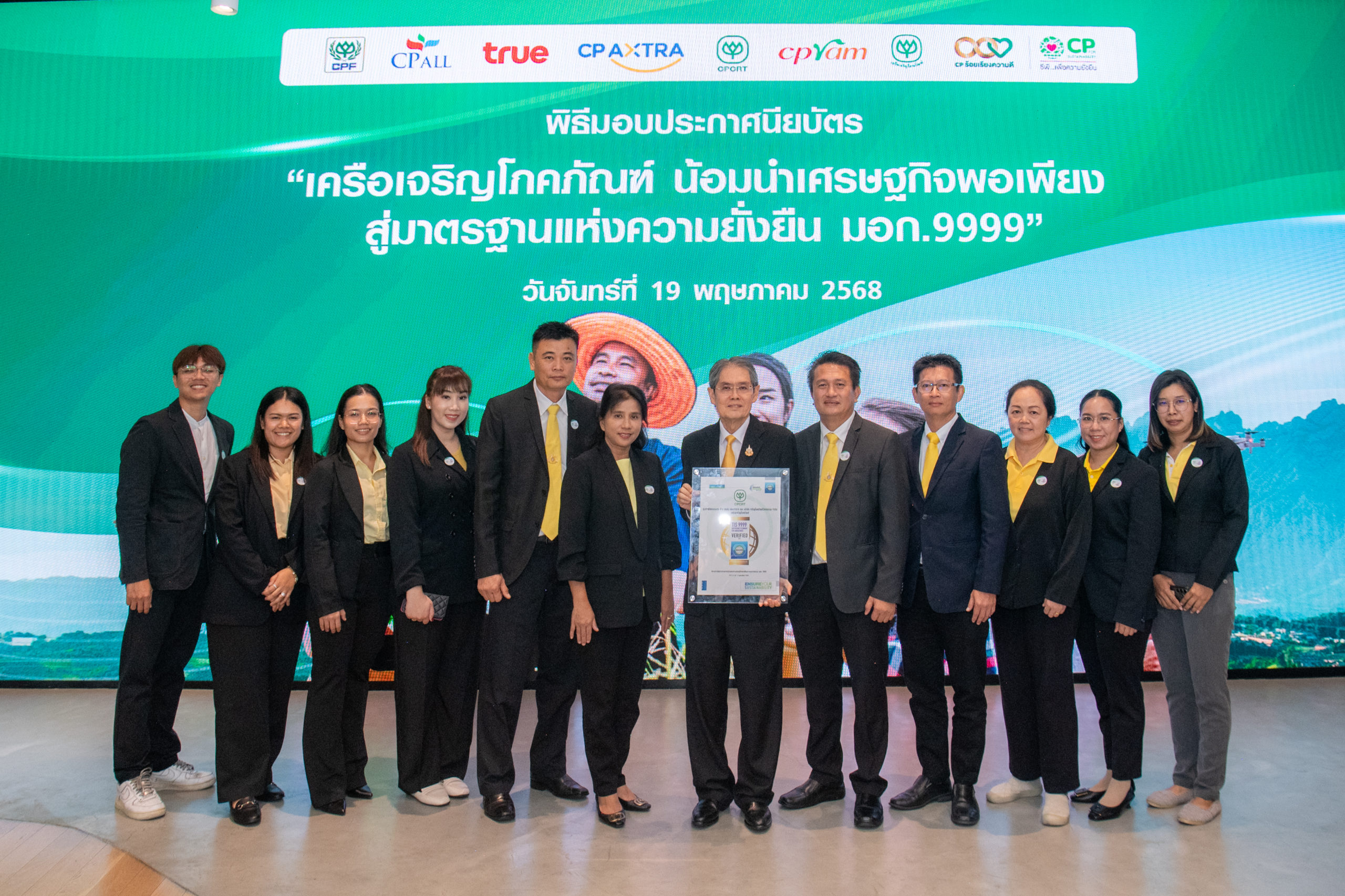 ภายในงานยังได้รับเกียรติจากคุณจงรักษ์ โรจน์พลาเสถียร ผู้อำนวยการสถาบันรับรองมาตรฐานไอเอสโอ (สรอ.) เป็นผู้มอบประกาศนียบัตรให้กับผู้แทนบริษัทในเครือซีพี โดยมีผู้บริหารระดับสูงของแต่ละบริษัทเข้ารับมอบ ได้แก่ ดร.ธีระพล ถนอมศักดิ์ยุทธ ประธานคณะผู้บริหาร ความยั่งยืนองค์กรและการพัฒนากลยุทธ์, คุณสมเจตนา ภาสกานนท์ รองกรรมการผู้จัดการอาวุโส ด้านความยั่งยืน, คุณเรวัติ หทัยสัตยพงศ์ ผู้อำนวยการใหญ่ ธุรกิจอาหารสัตว์บก ซีพีเอฟ, คุณมาลี อุทัยกิตติศัพท์ รองกรรมการผู้จัดการ บริษัท ซีพี ออลล์ จำกัด (มหาชน), คุณศิริพร เดชสิงห์ ประธานเจ้าหน้าที่บริหาร สายงานความยั่งยืนและสื่อสารองค์กร บริษัท ซีพี แอ็กซ์ตร้า จำกัด (มหาชน), คุณจักรกฤษณ์ อุไรรัตน์ หัวหน้าคณะผู้บริหารด้านกิจการองค์กร บมจ. ทรู คอร์ปอเรชั่น, คุณอดิศักดิ์ ประมวลมิตรา รักษาการประธานคณะผู้บริหารฝ่ายปฏิบัติการ บริษัท เจริญโภคภัณฑ์วิศวกรรม จำกัด และคุณชุมพล ลีละศุภพงษ์ ผู้ช่วยกรรมการผู้จัดการ บริษัท ซีพีแรม จำกัด