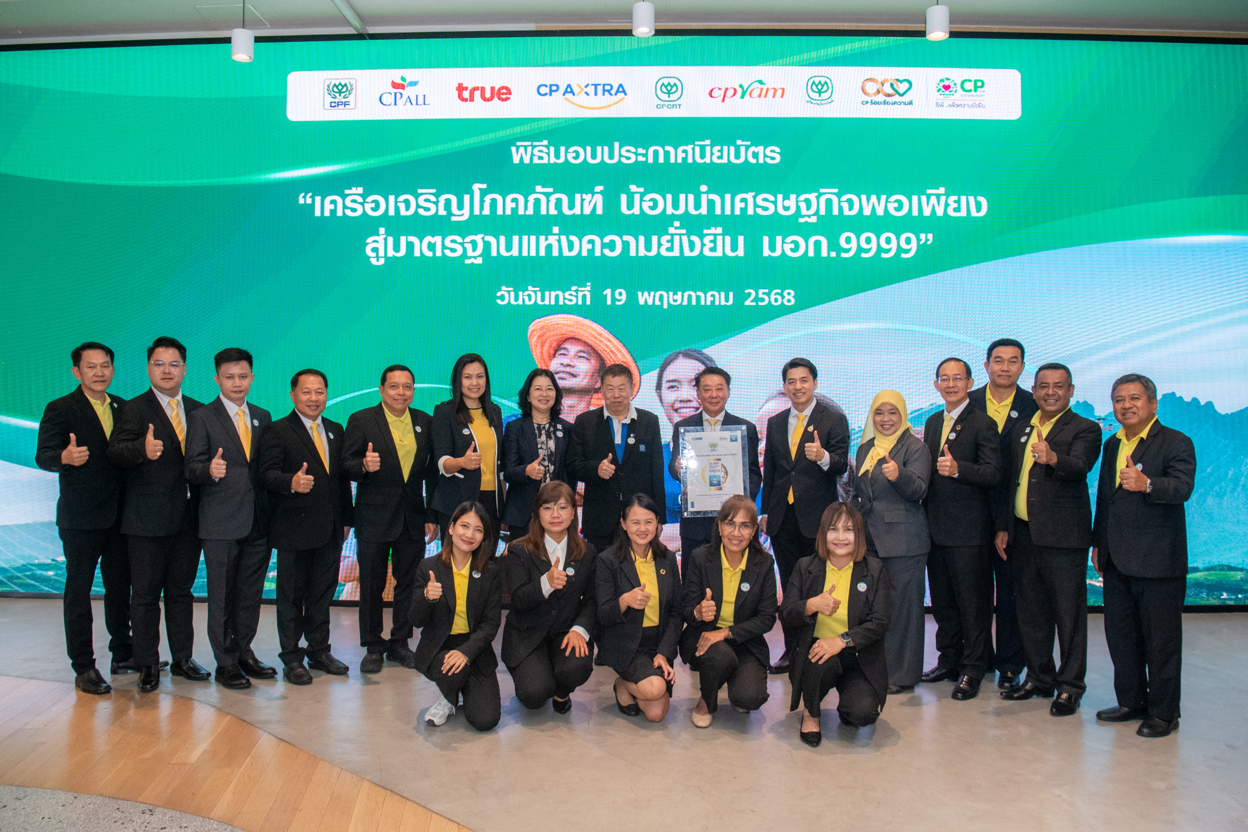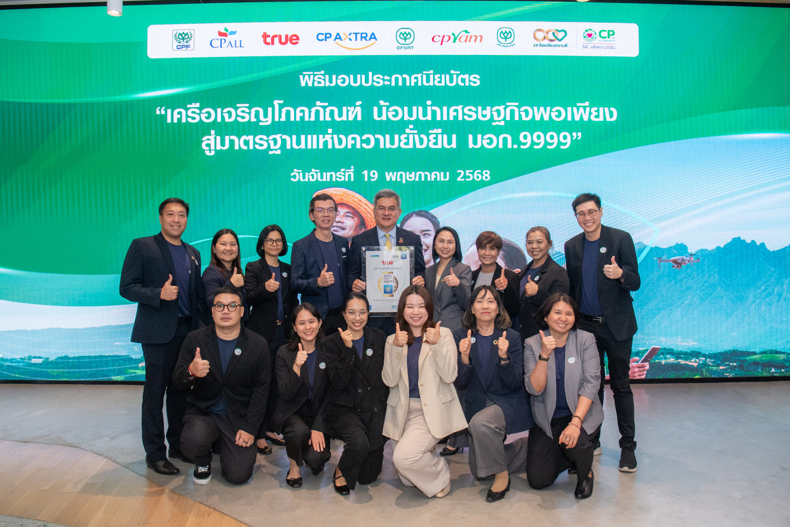 ดร.ธีระพล ถนอมศักดิ์ยุทธ ประธานคณะผู้บริหารด้านความยั่งยืนองค์กร และการพัฒนากลยุทธ์ เครือเจริญโภคภัณฑ์ กล่าวถึงวัตถุประสงค์ของการจัดงานว่า “เครือเจริญโภคภัณฑ์ น้อมนำเศรษฐกิจพอเพียง สู่มาตรฐานแห่งความยั่งยืน มอก.9999” จัดขึ้นเพื่อแสดงให้เห็นถึงความตั้งใจของเครือฯ ในการน้อมนำปรัชญาเศรษฐกิจพอเพียงมาสู่การดำเนินธุรกิจอย่างเป็นรูปธรรม ตลอดเวลากว่า 10 ทศวรรษ เครือเจริญโภคภัณฑ์ดำเนินธุรกิจภายใต้ค่านิยม “3 ประโยชน์” เพื่อประเทศชาติ ประชาชน และบริษัท ควบคู่ไปกับการสร้างการเติบโตอย่างมั่นคงและมีคุณค่าต่อสังคม โดยมีปรัชญาเศรษฐกิจพอเพียงเป็นแนวทางสำคัญที่ยึดถือมาโดยตลอด เศรษฐกิจพอเพียง มิใช่การหยุดนิ่ง หากแต่เป็นการเติบโตด้วยความพอดี มีสติ มั่นคง และยั่งยืน ไม่ใช่สูตรสำเร็จ หากแต่เป็น “เข็มทิศ” ที่ช่วยนำทางให้เราตัดสินใจอย่างรอบคอบและสมดุล ท่ามกลางความเปลี่ยนแปลงของโลกที่หมุนเร็วขึ้นทุกวัน ปรัชญานี้จึงกลายเป็นรากฐานสำคัญของยุทธศาสตร์ความยั่งยืนของเครือเจริญโภคภัณฑ์ ตามที่คุณศุภชัย เจียรวนนท์ ประธานคณะผู้บริหาร ได้เน้นย้ำและประกาศให้เป็นแนวทางหลักในการขับเคลื่อนองค์กร โดยผสานหลัก “พอประมาณ มีเหตุผล และมีภูมิคุ้มกัน” เข้ากับระบบบริหารจัดการของทุกกลุ่มธุรกิจ พร้อมยืนอยู่บนพื้นฐานของความรู้และคุณธรรมเพื่อให้แนวคิดเศรษฐกิจพอเพียงสามารถนำไปสู่การปฏิบัติได้อย่างแท้จริง คุณศุภชัยได้แต่งตั้ง “คณะกรรมการขับเคลื่อนเศรษฐกิจพอเพียงสู่มาตรฐาน มอก.9999” ซึ่งมีตัวแทนจากทุกกลุ่มธุรกิจในเครือฯ ร่วมกันผลักดันแนวทางดังกล่าวให้เกิดผลอย่างเป็นระบบ โดยในปีนี้ บริษัทในเครือจำนวน 7 แห่ง ได้ผ่านการทวนสอบจากสำนักงานรับรองมาตรฐานไอเอสโอ (สรอ.) และได้รับการรับรองตามมาตรฐานแนวทางเศรษฐกิจพอเพียงภาคอุตสาหกรรม (มอก.9999) ได้แก่ บริษัท เครือเจริญโภคภัณฑ์ จำกัด บริษัท เจริญโภคภัณฑ์อาหาร จำกัด (มหาชน) – ธุรกิจอาหารสัตว์บก บริษัท ซีพี ออลล์ จำกัด (มหาชน) บริษัท ซีพี แอ็กซ์ตร้า จำกัด (มหาชน) บริษัท ทรู คอร์ปอเรชั่น จำกัด (มหาชน) ธุรกิจพืชครบวงจร ข้าว ขนส่งและบริการ และบริษัท เจริญโภคภัณฑ์วิศวกรรม จำกัด บริษัท ซีพีแรม จำกัด เครือเจริญโภคภัณฑ์ขอแสดงความขอบคุณอย่างสุดซึ้งต่อ ดร.สุเมธ ตันติเวชกุล ท่านองคมนตรี รศ.ดร.จิรายุ อิศรางกูร ณ อยุธยา และ ศ.ดร.เกษม วัฒนะชัย ที่ให้คำแนะนำอันทรงคุณค่าและความเมตตาอย่างต่อเนื่อง ในการส่งเสริมให้แนวทางเศรษฐกิจพอเพียงขยายผลสู่ภาคธุรกิจได้อย่างลึกซึ้งและยั่งยืน เครือเจริญโภคภัณฑ์