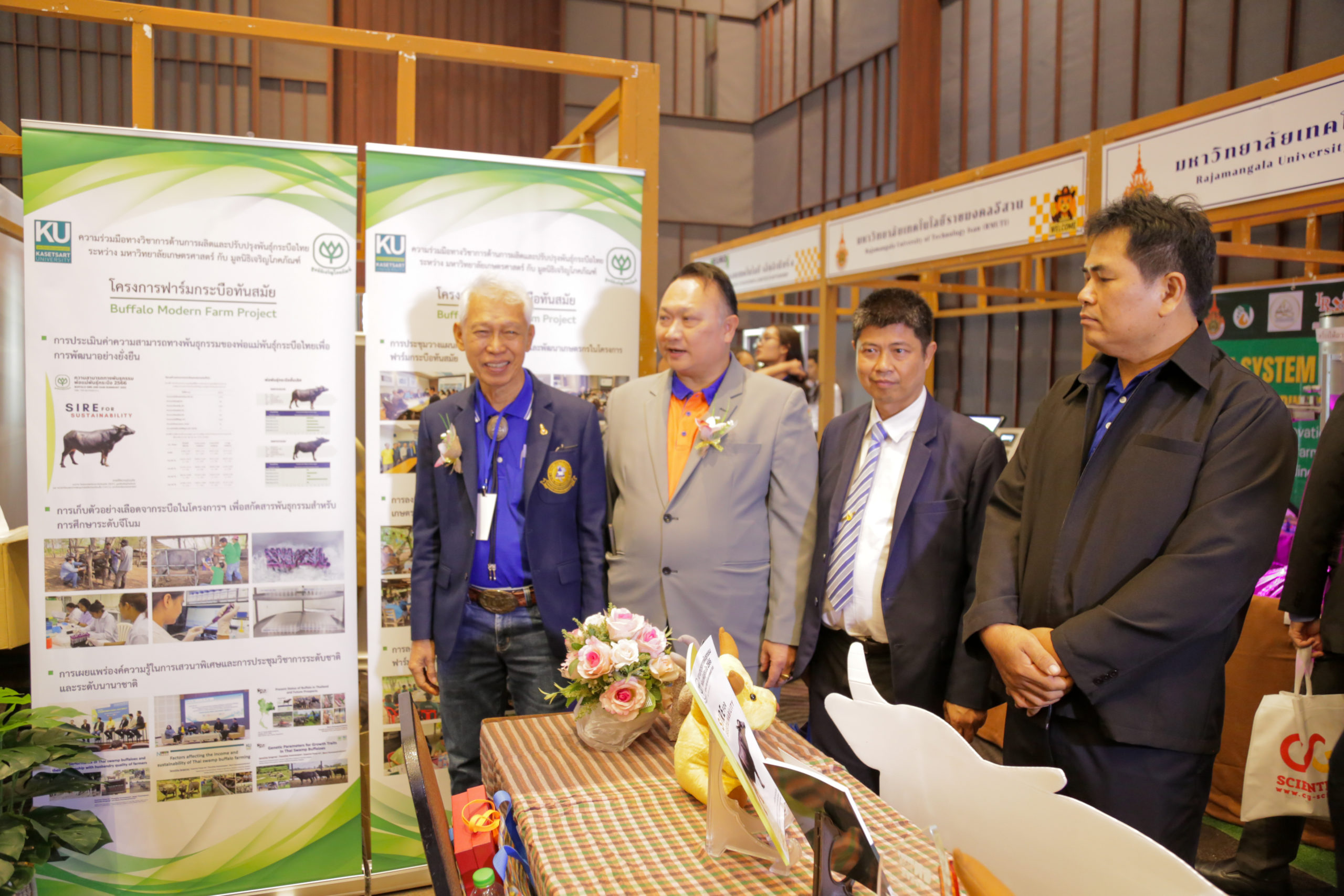 หนึ่งในผลงานสำคัญที่โครงการฯ ให้ความสำคัญและผลักดันมาอย่างต่อเนื่อง คือ “หนังสือความสามารถทางพันธุกรรมพ่อแม่พันธุ์กระบือไทย” หรือ Buffalo Sire and Dam Summary ซึ่งจัดทำขึ้นโดยความร่วมมือกับ หน่วยวิจัยเฉพาะทางพันธุศาสตร์สัตว์เขตร้อนชื้น (TAGU; Tropical Animal Genetic Special Research Unit) ภาควิชาสัตวบาล คณะเกษตร มหาวิทยาลัยเกษตรศาสตร์ นำโดย รองศาสตราจารย์ ดร.ศกร คุณวุฒิฤทธิรณ และคณะ หนังสือฉบับนี้ใช้ เทคโนโลยีการประเมินคุณค่าทางพันธุกรรม (EBV: Estimated Breeding Value) ร่วมกับ ข้อมูลระดับจีโนม (Genomic Data) ในการวิเคราะห์ศักยภาพของพ่อแม่พันธุ์กระบือไทยอย่างละเอียด ไม่ว่าจะเป็นน้ำหนักตัว สัดส่วนโครงสร้าง ความสามารถในการถ่ายทอดลักษณะทางพันธุกรรม รวมถึงปัจจัยที่เกี่ยวข้องกับการเติบโตและประสิทธิภาพการผลิต ซึ่งช่วยให้การคัดเลือกพันธุ์กระบือไม่ต้องอาศัยเพียงประสบการณ์หรือการประเมินด้วยสายตาอีกต่อไป แต่สามารถใช้ข้อมูลเชิงวิทยาศาสตร์ในการประกอบการตัดสินใจได้อย่างมีประสิทธิภาพ
