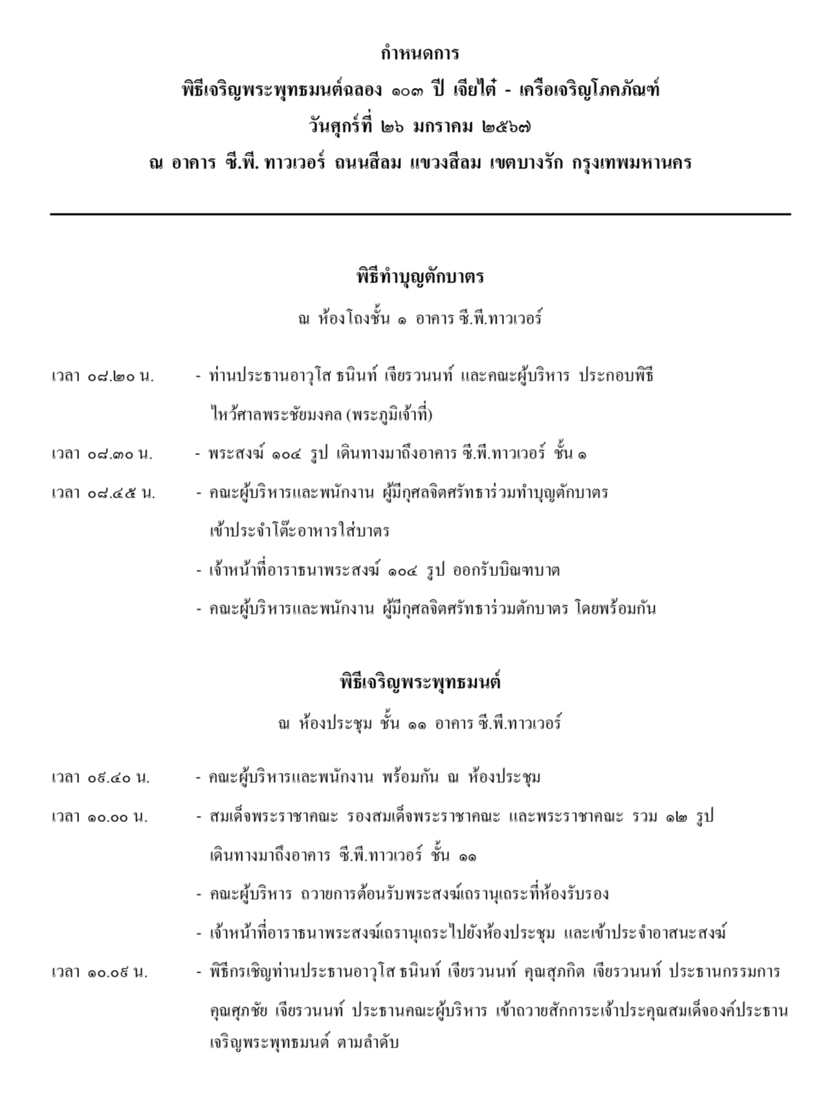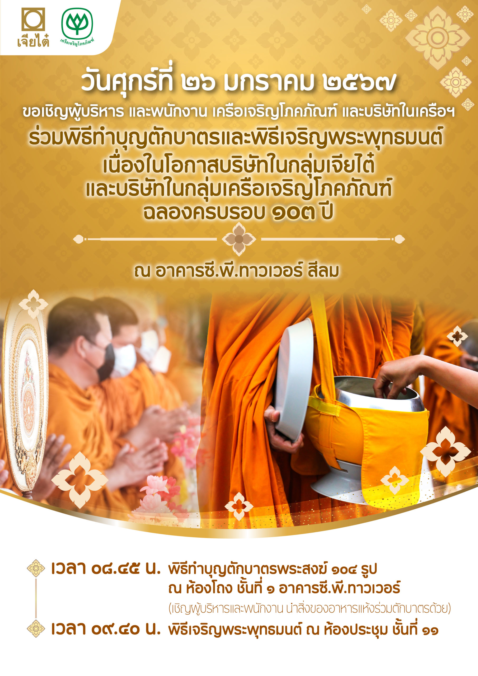 ขอเชิญผู้บริหาร และพนักงาน เครือเจริญโภคภัณฑ์ และบริษัทในเครือฯ ร่วมพิธีทำบุญตักบาตรและพิธีเจริญพระพุทธมนต์ เนื่องในโอกาสบริษัทในกลุ่มเจียไต๋และบริษัทในกลุ่มเครือเจริญโภคภัณฑ์ ฉลองครบรอบ ๑๐๓ ปี