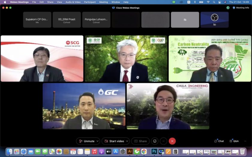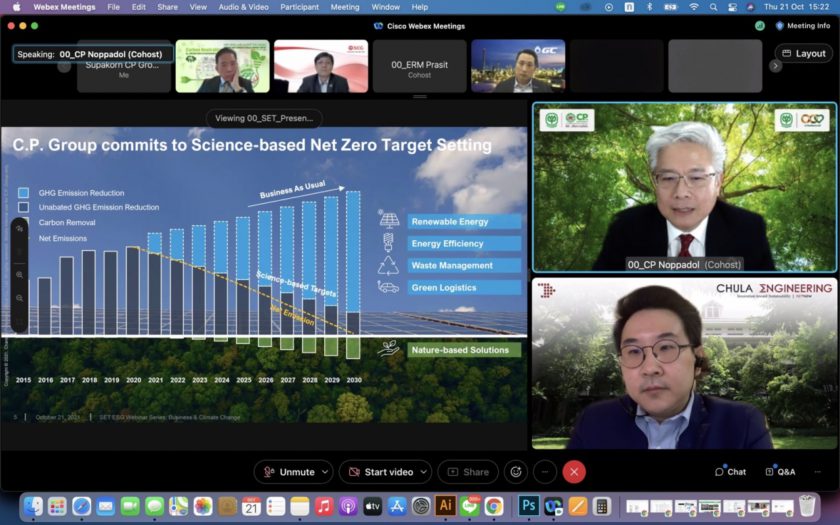ในการนี้ คุณนพปฎล เดชอุดม ประธานคณะผู้บริหารด้านความยั่งยืนองค์กร เครือเจริญโภคภัณฑ์ (ซีพี) ร่วมเสวนาออนไลน์ในหัวข้อ “เริ่มเลย เริ่มอย่างไร?” ร่วมกับตัวแทนจากภาคธุรกิจเอกชนต่าง ๆ ประกอบด้วย คุณนำพล ลิ้มประเสริฐ ผู้อำนวยการสำนักงานพัฒนาอย่างยั่งยืน บมจ.ปูนซีเมนต์ไทย คุณสมพล ธนาดำรงศักดิ์ กรรมการผู้จัดการ บมจ.ฟอร์จูนพาร์ท อินดัสตรี้ และดร.ชญาน์ จันทวสุ ผู้ช่วยกรรมการผู้จัดการใหญ่ สายงานบริหารความยั่งยืนและภาพลักษณ์องค์กร บมจ.พีทีที โกลบอล เคมิคอล เพื่อร่วมแลกเปลี่ยนประสบการณ์ของภาคธุรกิจเอกชนที่ประสบความสำเร็จ ในการปรับตัวและเปลี่ยนแปลงองค์กรเพื่อมุ่งสู่การดำเนินธุรกิจที่่ช่วยลดการปล่อยก๊าซคาร์บอนไดออกไซด์