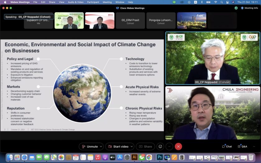 วันที่ 21 ตุลาคม ตลาดหลักทรัพย์แห่งประเทศไทย จัดงาน SET ESG Webinar Series: Business & Climate Change ครั้งที่ 1 ซึ่งเป็นการจัดเสวนาออนไลน์เรื่อง “Understanding Climate Change as Business Drivers” เพื่อสร้างความเข้าใจในประเด็นการเปลี่ยนแปลงสภาพภูมิอากาศที่กำลังขับเคลื่อนภาคธุรกิจ โดยมีนักวิชาการ ผู้บริหารจากภาคธุรกิจเอกชน และหน่วยงานรัฐ เข้าร่วมงานอย่างคับคั่ง