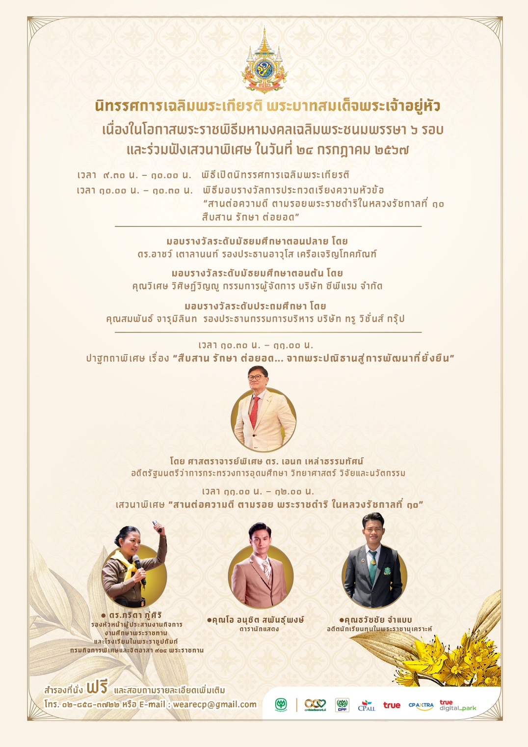 ชวนคนซีพีเข้าชมนิทรรศการเฉลิมพระเกียรติพระบาทสมเด็จพระเจ้าอยู่หัวเนื่องในโอกาสพระราชพิธีมหามงคลเฉลิมพระชนมพรรษา 6 รอบ และร่วมฟังเสวนาพิเศษ ในวันที่ 24 กรกฎาคม 2567 เวลา 09:00 – 12:00 น. ณ ทรูดิจิทัลพาร์ค ลานชั้น 1 ฝั่งเวสต์
