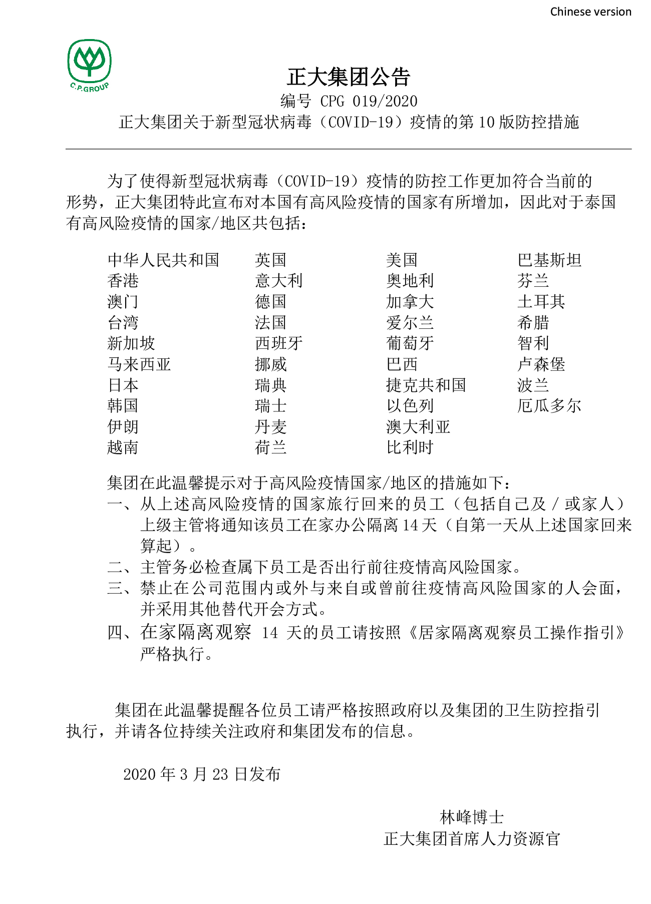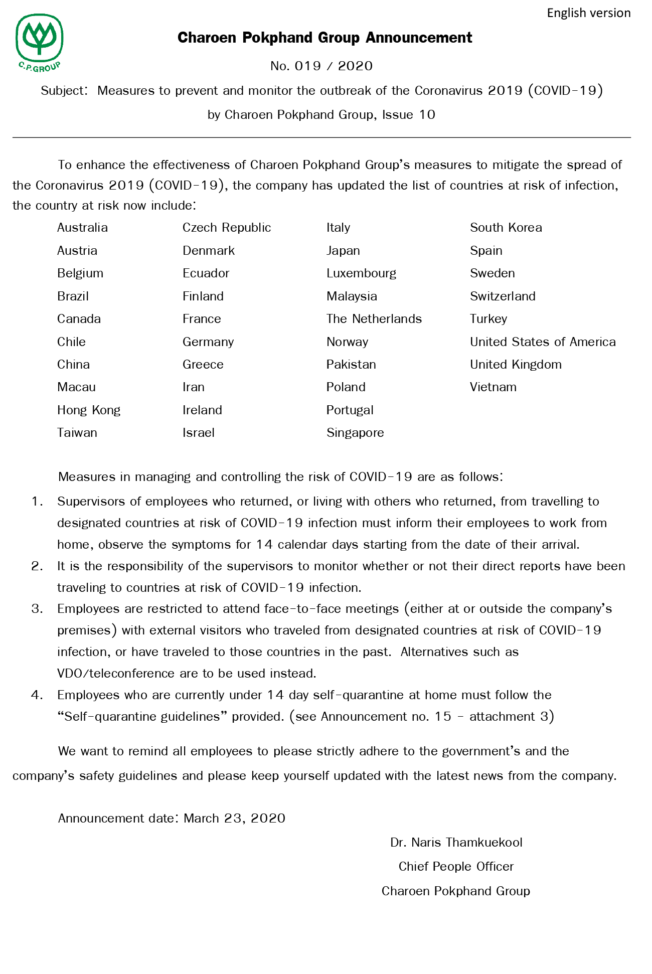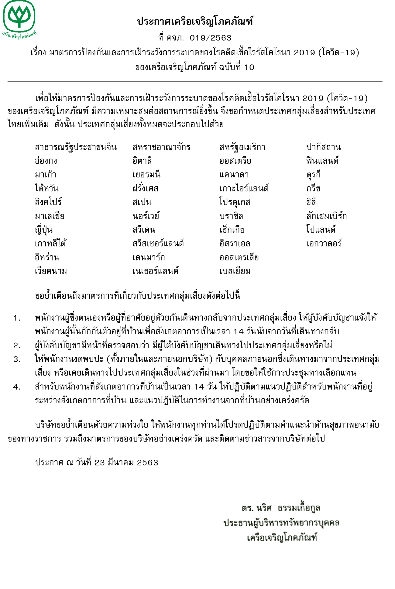 เครือซีพีประกาศมาตรการป้องกันฯไวรัสโควิด-19 ฉบับที่ 10