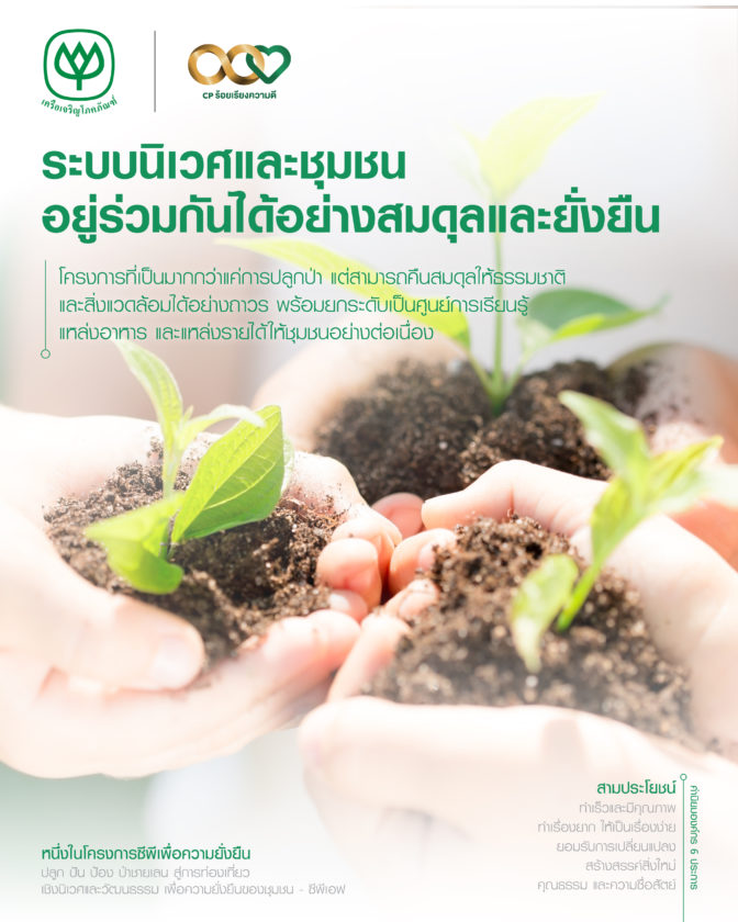 ปี 2557 ซีพีเอฟ ได้ดำเนินโครงการ ซีพีเอฟ ปลูก ปัน ป้อง ป่าชายเลน ในพื้นที่ ตำบลปากน้ำประแส อำเภอแกลง จังหวัดระยอง โดยดำเนินโครงการร่วมกับหน่วยงานภาครัฐ ท้องถิ่น ภาคประชาชน และนักวิชาการ ในการดำเนินโครงการซีพีเอฟได้เข้าไปร่วมสานเสวนากับผู้มีส่วนได้เสีย เพื่อให้ทราบปัญหาที่แท้จริง นำมาซึ่งการกำหนดแผนงานโครงการ และได้ปลูกป่าชายเลนเพิ่มในพื้นที่จำนวน 54 ไร่ (ปัจจุบันมีอัตรารอด 80% ) และมีส่วนร่วมในการอนุรักษ์ ฟื้นฟู ป่าชายเลนในพื้นที่จำนวน 614 ไร่ เมื่อกระบวณการอนุรักษ์ฟื้นฟูป่าชายเลนได้ถูกดำเนินการแล้ว ก็สร้างความเชื่อมโยงและต่อยอดให้เกิดเป็นการท่องเที่ยวเชิงอนุรักษ์และวัฒนธรรม เพื่อให้คนในชุมชนตระหนักถึงคุณค่าของป่าชายเลน และเข้ามามีส่วนร่วมในการดำเนินกิจกรรมด้านการท่องเที่ยวเชิงนิเวศ มีการจดเป็นวิสาหกิจชุมชน จัดตั้งกองทุนเพื่อการอนุรักษ์สิ่งแวดล้อมและส่งเสริมอาชีพของคนในชุมชน