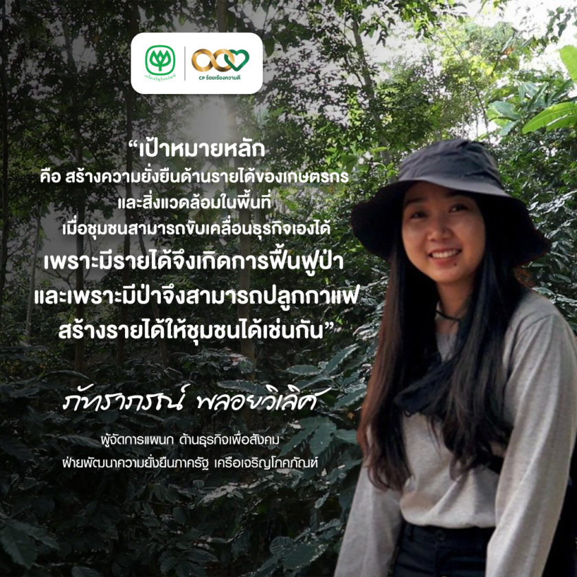 เธอยังบอก อีกว่า ‘เป้าหมายหลักในการทำงานของเรา คือ สร้างความยั่งยืนด้านรายได้ของเกษตรกร และสิ่งแวดล้อมป่าไม้ในพื้นที่ ซึ่งจะเกิดขึ้นเมื่อชุมชนสามารถขับเคลื่อนธุรกิจเองได้ เพราะมีรายได้จึงเกิดการฟื้นฟูป่า และเพราะมีป่าจึงสามารถปลูกกาแฟสร้างรายได้ให้ชุมชนเช่นกัน”