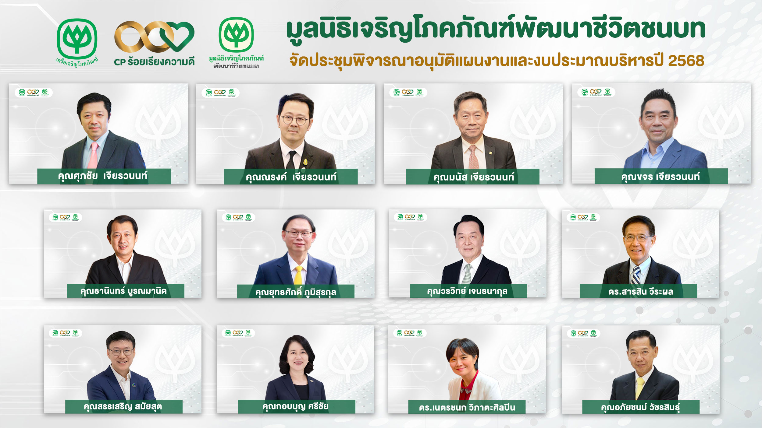วันที่ 26 มิถุนายน 2568 – มูลนิธิเจริญโภคภัณฑ์พัฒนาชีวิตชนบท (ซีพี) จัดประชุมพิจารณาอนุมัติแผนงานและงบประมาณปีบริหาร 2568 นำโดย พลอากาศเอก ชลิต พุกผาสุข องคมนตรี ประธานกรรมการมูลนิธิเจริญโภคภัณฑ์พัฒนาชีวิตชนบท เป็นประธานการประชุม พร้อมด้วย คุณสุภกิต เจียรวนนท์ ประธานกรรมการ เครือเจริญโภคภัณฑ์ คุณศุภชัย เจียรวนนท์ ประธานคณะผู้บริหาร เครือเจริญโภคภัณฑ์ ในฐานะรองประธานกรรมการมูลนิธิฯ และกรรมการมูลนิธิฯ อาทิ คุณอดิเรก ศรีประทักษ์ รองประธานอาวุโส เครือเจริญโภคภัณฑ์ คุณณรงค์ เจียรวนนท์ รองประธานอาวุโส เครือเจริญโภคภัณฑ์ และคณะกรรมการมูลนิธิฯ ผู้บริหารระดับสูงของเครือเจริญโภคภัณฑ์ รวม 25 ท่าน ณ ห้องบอร์ดรูม ชั้น 34 อาคารทรู ทาวเวอร์ ถนนรัชดาภิเษก และเข้าร่วมประชุมทางไกลผ่านระบบออนไลน์ (Zoom Meeting)