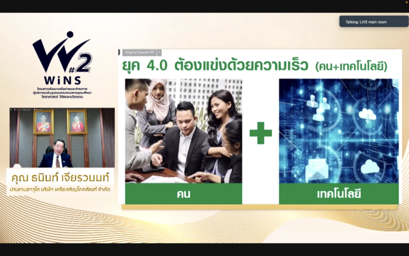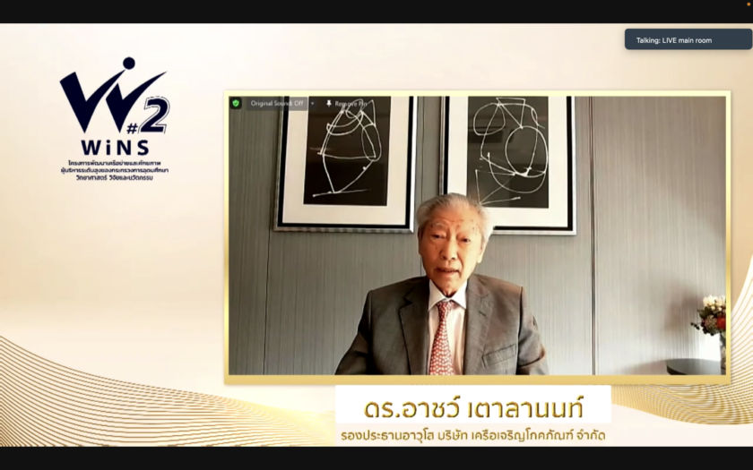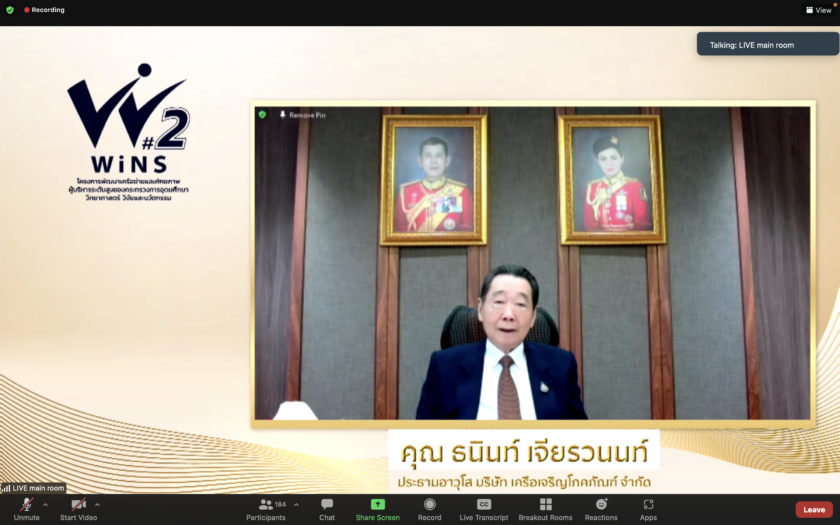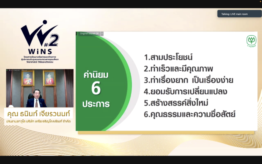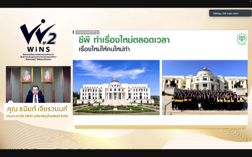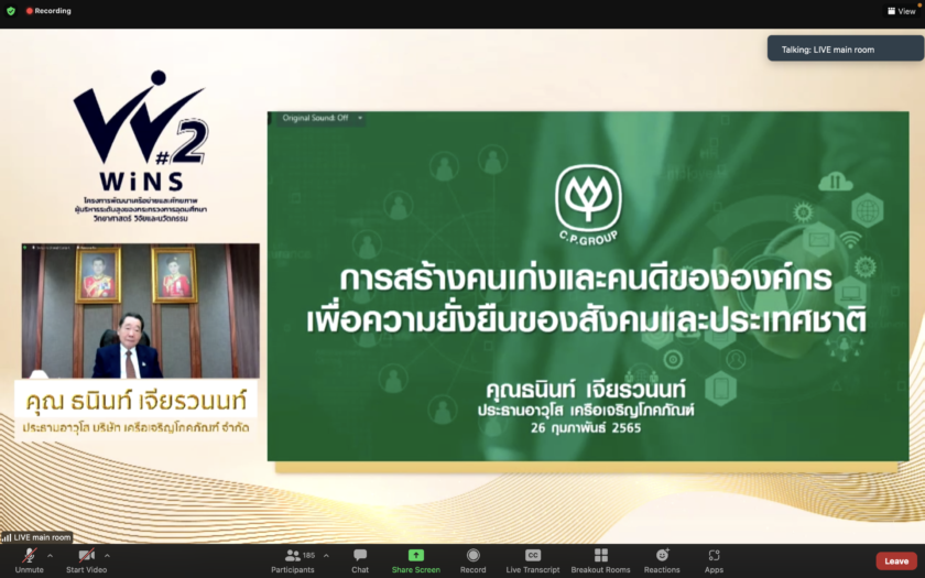 26 กุมภาพันธ์ 2565 – คุณธนินท์ เจียรวนนท์ ประธานอาวุโส เครือเจริญโภคภัณฑ์ และดร.อาชว์ เตาลานนท์ รองประธานอาวุโส เครือเจริญโภคภัณฑ์ ได้รับเชิญเป็นวิทยากรพิเศษในโครงการพัฒนาเครือข่ายและศักยภาพผู้บริหารระดับสูงของกระทรวงการอุดมศึกษา วิทยาศาสตร์ วิจัยและนวัตกรรม (หลักสูตร WiNS รุ่นที่ 2) ได้รับการสนับสนุนการจัดโครงการจากสำนักงานการวิจัยแห่งชาติ (วช.) ผ่านระบบประชุมออนไลน์ โดยมี ศ.พิเศษ ดร.เอนก เหล่าธรรมทัศน์ รัฐมนตรีว่าการกระทรวงการอุดมศึกษา วิทยาศาสตร์ วิจัยและนวัตกรรม (อว.) พร้อมศ.ดร.นพ.สิริฤกษ์ ทรงศิวิไล ปลัดกระทรวงอว. และผู้บริหารระดับสูงภาครัฐ ภาคเอกชน นักวิชาการ กลุ่มสตาร์อัพ และองค์กรภาคประชาสังคม เข้าร่วมงานกว่า 300 คน