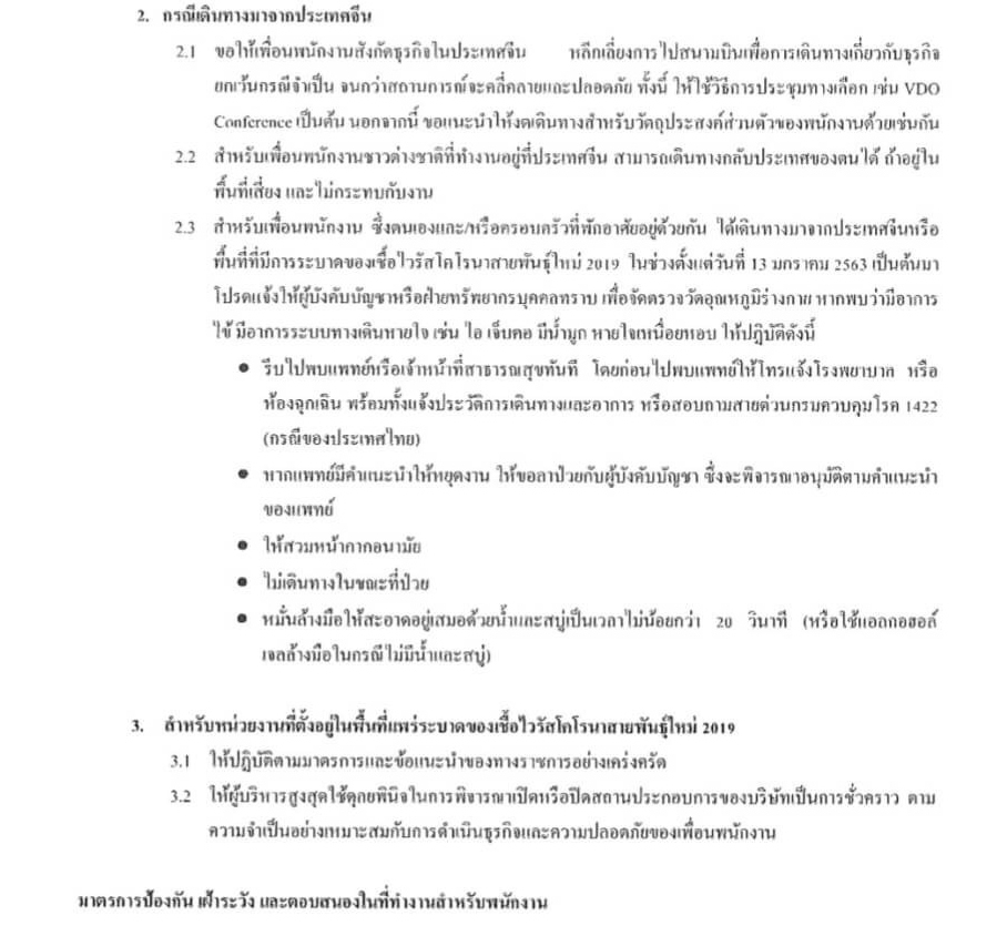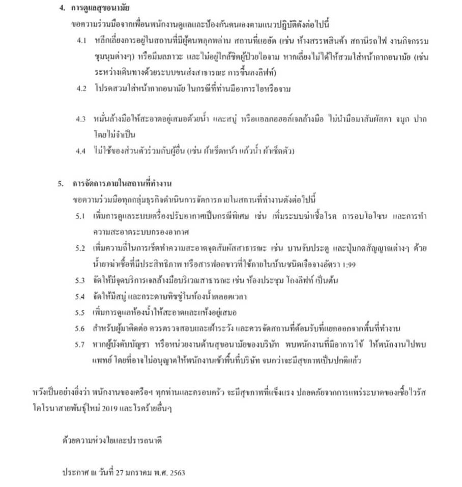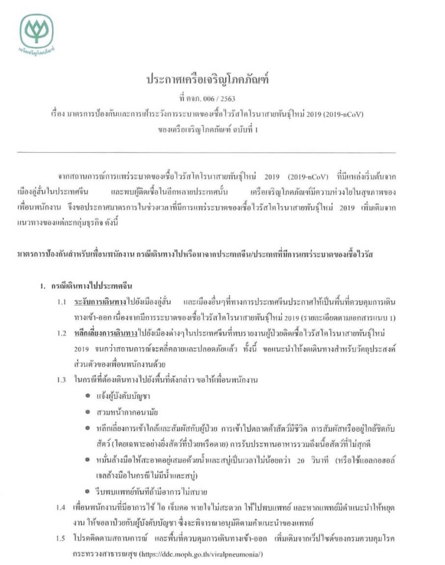 คุณศุภชัย เจียรวนนท์ ประธานคณะผู้บริหารเครือเจริญโภคภัณฑ์ ได้ลงนามประกาศมาตรการป้องกันและการเฝ้าระวังการระบาดของไวรัสโคโรนาสายพันธุ์ 2019 ฉบับที่1ด้วยความห่วงใยพนักงาน