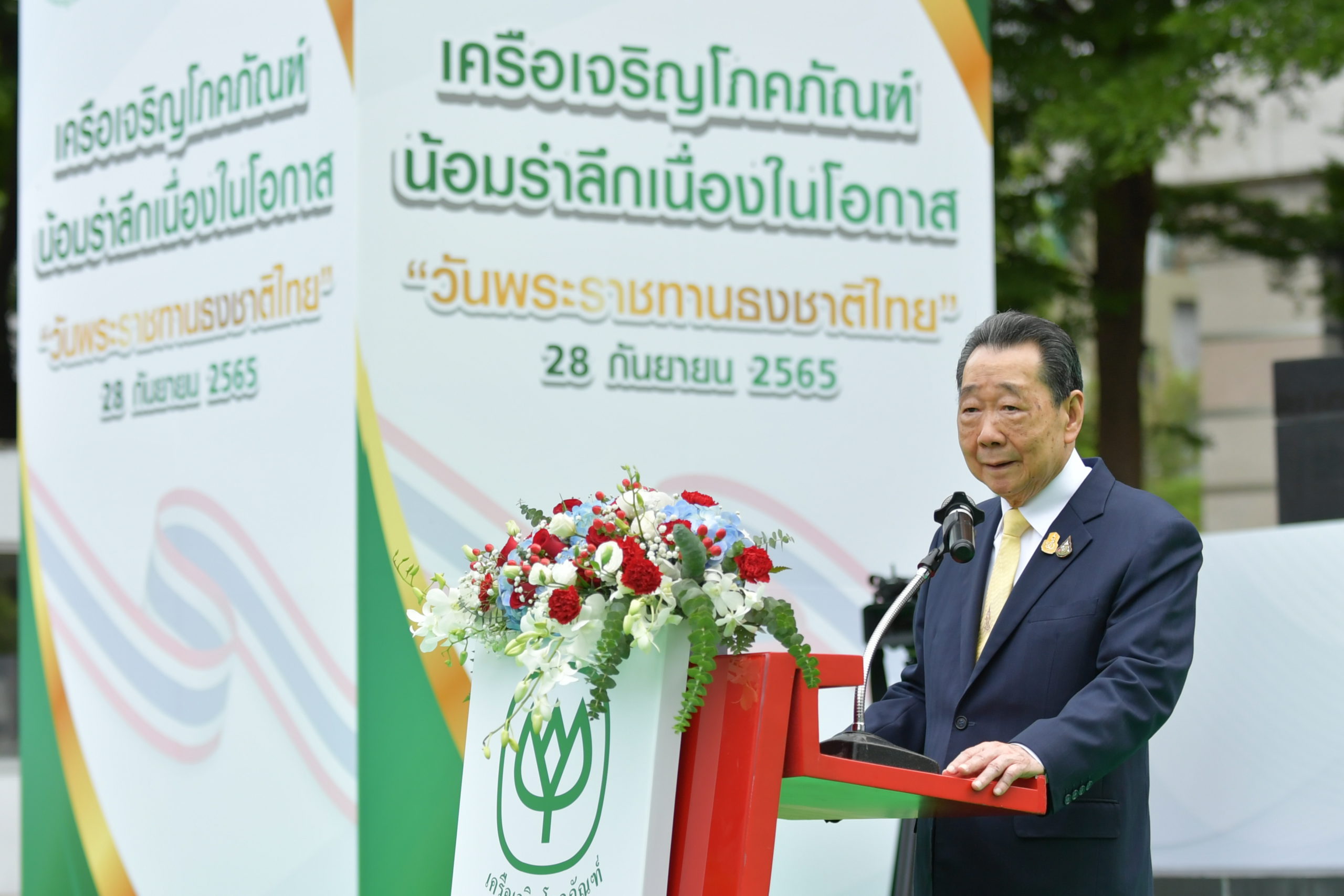 28 กันยายน 2565 – เครือเจริญโภคภัณฑ์ (ซีพี) และบริษัทในเครือได้ร่วมกันร้อยเรียงความดี จัดกิจกรรมเชิดชูชาติ ศาสน์ กษัตริย์ เพื่อน้อมรำลึกในวันพระราชทานธงชาติไทย ครบรอบ 105 ปี โดย คุณธนินท์ เจียรวนนท์ ประธานอาวุโส เครือซีพี เป็นประธานในพิธี ทั้งนี้โดยมี ดร.อาชว์ เตาลานนท์ รองประธานอาวุโส เครือฯ คุณณรงค์ เจียรวนนท์ รองประธานอาวุโส เครือฯ คุณศุภชัย เจียรวนนท์ ประธานคณะผู้บริหาร เครือฯ คุณขจร เจียรวนนท์ กรรมการบริหาร เครือเจริญโภคภัณฑ์ คุณธานินทร์ บูรณมานิต ประธานเจ้าหน้าที่บริหาร กลุ่มธุรกิจแม็คโคร และรองประธานกรรมการบริหาร บมจ. ซีพี ออลล์ คุณยุทธศักดิ์ ภูมิสุรกุล ประธานเจ้าหน้าที่บริหาร บมจ. ซีพี ออลล์ คุณนพดล เจียรวนนท์ รองประธาน กลุ่มธุรกิจอุตสาหกรรมยานยนต์ คุณธนิศร์ เจียรวนนท์ ประธานคณะผู้บริหาร ธุรกิจค้าส่งแม็คโครประเทศไทย บริษัท สยามแม็คโคร จำกัด (มหาชน) คุณอติรุฒม์ โตทวีแสนสุข รองประธานคณะกรรมการบริหาร บมจ.ทรู คอร์ปอเรชั่น คุณจิระศักดิ์ เสงี่ยมกิตติกุล ประธานคณะผู้บริหาร บริษัท เจริญโภคภัณฑ์วิศวกรรม จำกัด คุณกนธีร์ ติรวิภาส กรรมการผู้จัดการใหญ่ (รักษาการ) บจ.ซีพีแลนด์ คุณมนัสส์ มานะวุฒิเวช กรรมการผู้จัดการใหญ่ (ร่วม) บมจ.ทรู คอร์ปอเรชั่น พร้อมด้วยผู้บริหารและพนักงานจากกลุ่มธุรกิจต่าง ๆ ร่วมพิธีฯ ณ ลานเสาธง อาคารทรู ทาวเวอร์ ถนนรัชดาภิเษก กรุงเทพฯ ซึ่งเป็นศูนย์กลางในการจัดงาน และได้ถ่ายทอดสดไปยังอาคารสำนักงาน โรงงาน และกลุ่มธุรกิจในเครือกว่า 50 แห่งทั้งไทยและต่างประเทศ โดยคุณศุภชัย เจียรวนนท์ ประธานคณะผู้บริหาร เครือซีพี ได้เป็นผู้นำในการกล่าวคำปฏิญานตนเพื่อเทิดทูนและรักษาไว้ซึ่งชาติ ศาสนา และพระมหากษัตริย์ จากนั้นได้ร่วมกันเคารพธงชาติและร้องเพลงชาติไทยพร้อมกัน เพื่อน้อมรำลึกในพระมหากรุณาธิคุณของพระบาทสมเด็จพระมงกุฎเกล้าเจ้าอยู่หัวที่ทรงพระราชทานธงไตรรงค์เป็นธงชาติไทย รวมถึงน้อมรำลึกถึงพระมหากรุณาธิคุณของพระมหากษัตริย์ทุกพระองค์ ตลอดจนความเสียสละของบรรพบุรุษไทยที่ทรงดำรงรักษาไว้ซึ่งเอกราชอธิปไตยให้ชาวไทยได้อยู่อย่างร่มเย็นตราบจนปัจจุบัน