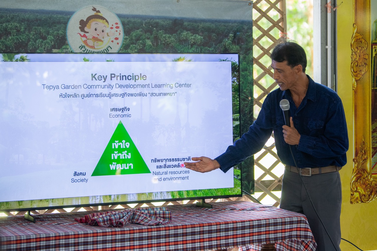 ด้าน คุณดุริยา อมตวิวัฒน์ ผู้อํานวยการศูนย์ระดับภูมิภาคของซีมีโอ ได้กล่าวขอบคุณสวนเทพหยาที่จัดกิจกรรมในวันนี้ คณะ SEAMEO SEPS ได้เห็นความเป็นชุมชนที่มีความหลากหลาย แต่เป็นอันหนึ่งอันเดียวกัน เพราะทุกคนมุ่งมั่นใช้หลักเศรษฐกิจพอเพียงที่บ้านตนเอง หลายบ้านมีอาชีพ มีรายได้ และความชำนาญที่แตกต่างกันแต่ทุกคนในชุมชนเน้นการ “ลดรายจ่าย เพิ่มรายได้” ทำให้ชุมชน มีรายได้ที่ดีและน่าอยู่ ไม่ว่าจะเป็นมิติเรื่องสังคม มิติเศรษฐกิจ และมิติวัฒนธรรม คาดว่า “สวนเทพหยา” เป็นจุดสำคัญในการเป็นศูนย์กลางเชื่อมชุมชน ทำให้ชุมชนเห็นแนวทางปฏิบัติ นำปรัชญาและหลักคิดเศรษฐกิจพอเพียงไปใช้ในชีวิตประจำวันได้จริง ซึ่งปัจจุบันหลักปรัชญาของเศรษฐกิจพอเพียง เป็นแนวคิดที่นานาประเทศให้การยอมรับและมีการน้อมนำไปปรับใช้อย่างแพร่หลาย เพราะเป็นต้นแบบการพัฒนาที่สมดุลและยั่งยืน การเดินทางมาศึกษาดูงานครั้งนี้ จึงเป็นโอกาสสำคัญที่ผู้เชี่ยวชาญจาก 9 ประเทศ จะได้มาเรียนรู้เพิ่มเติมจากพื้นที่จริง เพื่อนำองค์ความรู้ไปขยายผลให้เกิดประโยชน์ต่อผู้คนในประเทศตนเองต่อไป/.