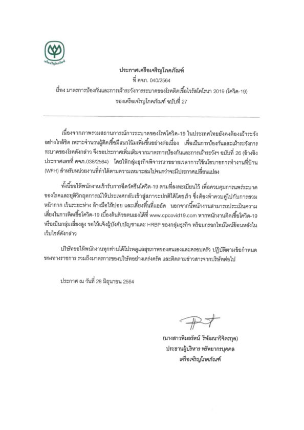 มาตรการป้องกันและการเฝ้าระวังการระบาดของโรคติดเชื้อไวรัสโคโรนา 2019 (โควิด-19) ของเครือเจริญโภคภัณฑ์ ฉบับที่ 27 29 มิถุนายน 2564SystemNews, กิจกรรมเพื่อสังคม, มาตรการป้องกันcovid-19 Post Views: 1,883